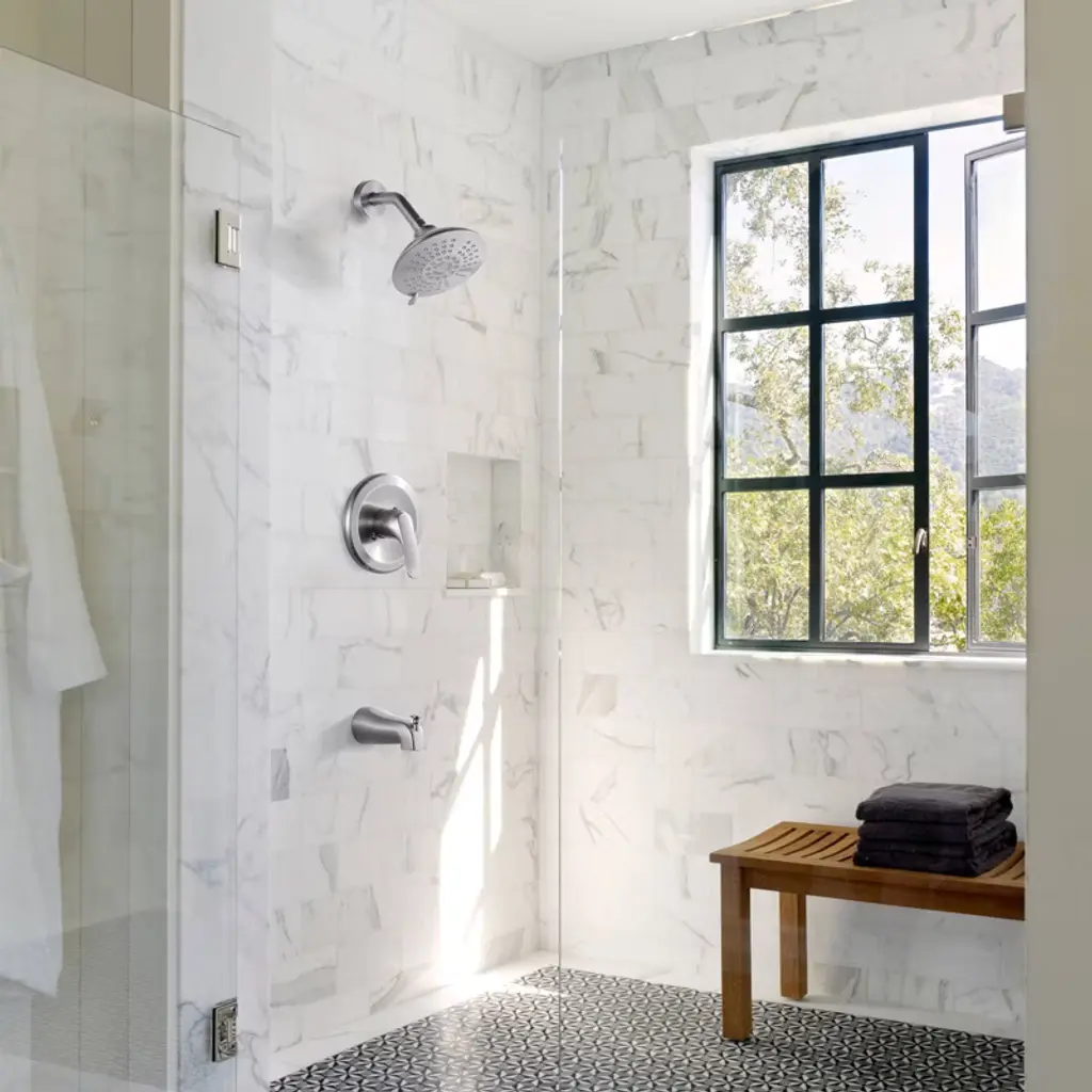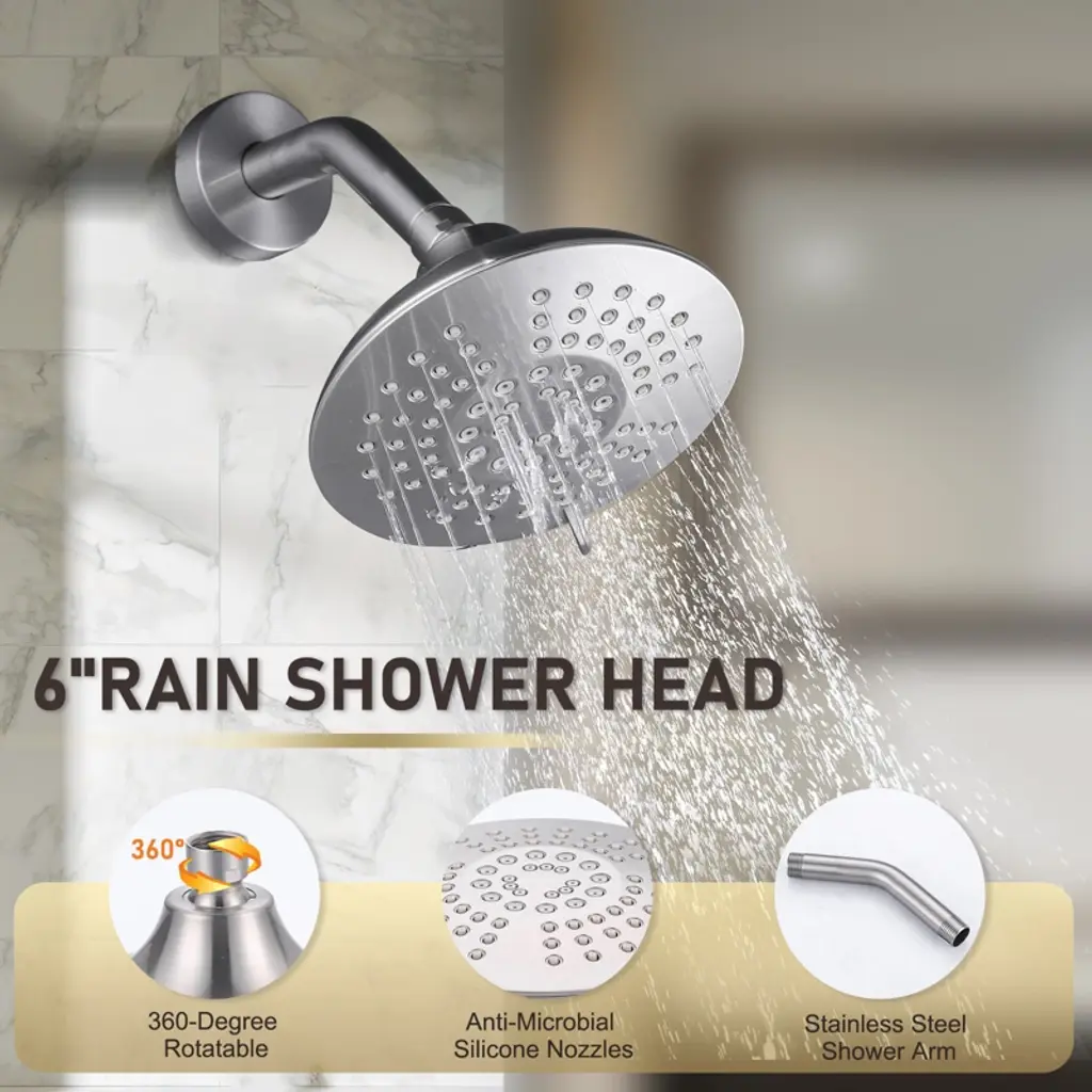 The sleek and modern design of this shower faucet makes it an ideal choice for contemporary bathrooms, enhancing the overall aesthetic appeal of the space. Crafted from high quality materials, the solid brass body and stainless-steel shower arm ensure exceptional durability and corrosion resistance, guaranteeing years of reliable performance. The single handle operation makes it easy to control the water flow and temperature, providing you with a convenient experience. 6-inch diameter shower head features 5 spray settings, offering a variety of options ranging from a gentle, rain-like flow to a powerful massage spray, catering to your diverse showering preferences. The included tub spout with a convenient diverter allows for effortless switching between filling your tub and enjoying a shower. Upgrade your bathroom with our Single Handle 5-Spray Shower Faucet with Tub Spout.