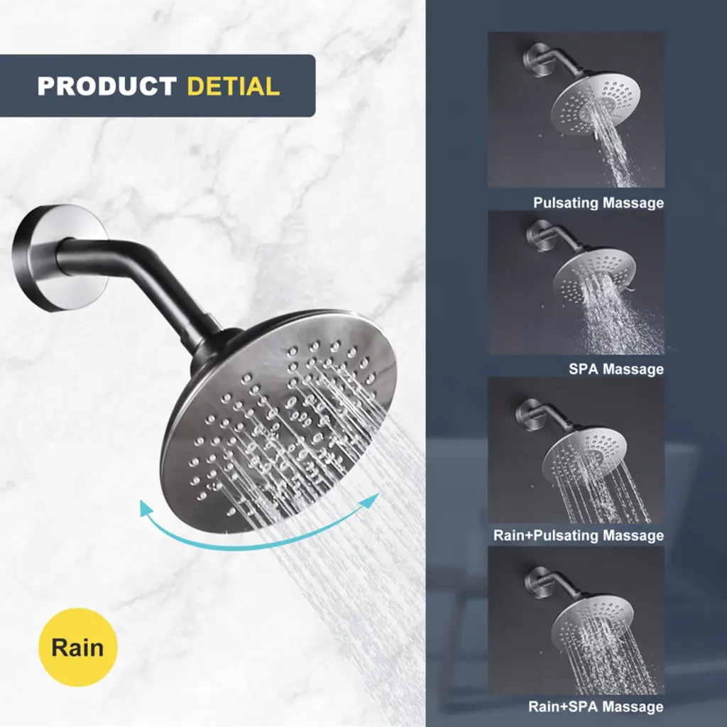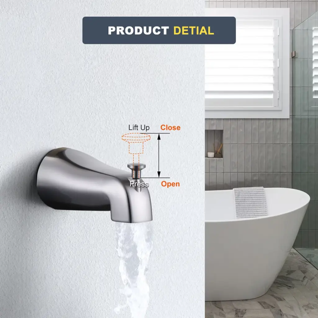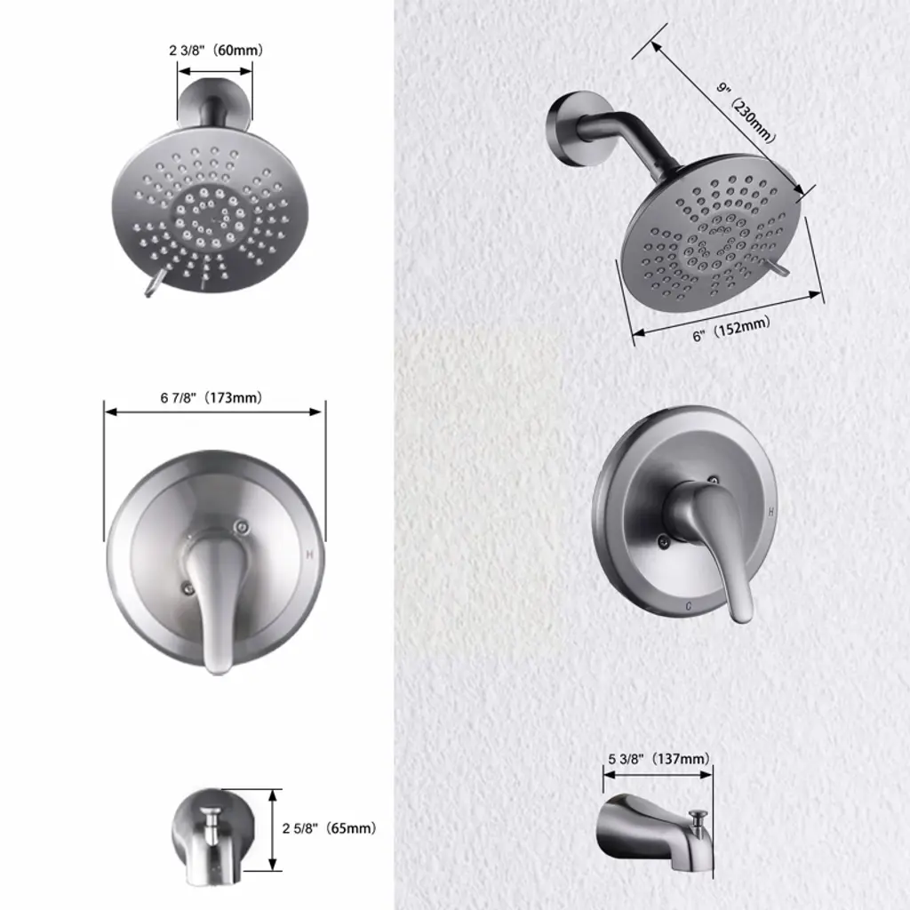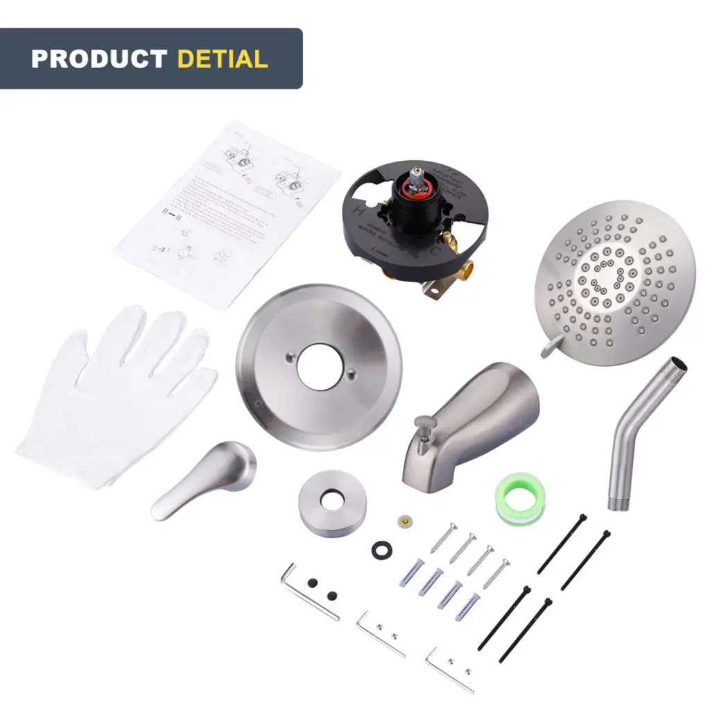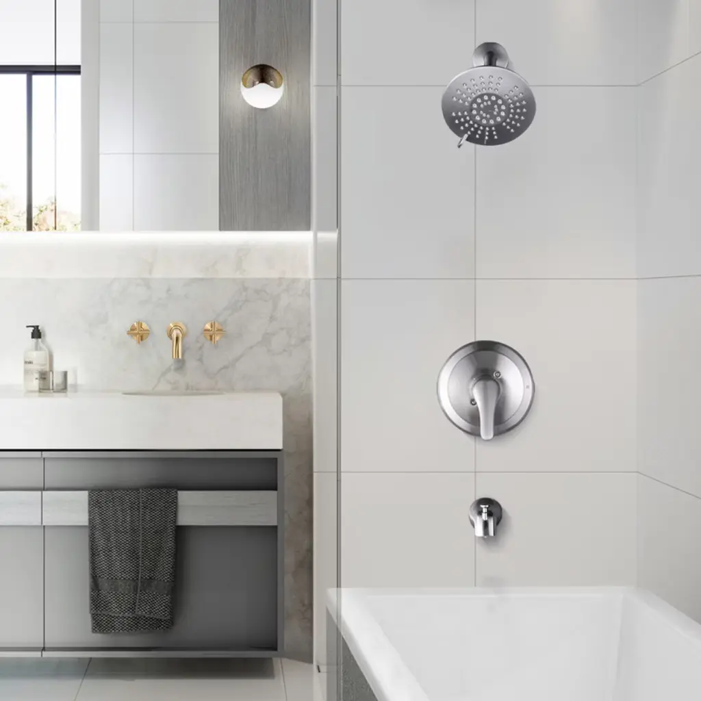 This single-lever shower faucet combines the elegance of brass with the classic brushed nickel color, showing the luxury quality. Equipped with a valve and bathtub spout, it is fully functional and meets a variety of needs. Five spray head design, rich water flow pattern, bring the ultimate bathing experience. Simple but exquisite, adding a touch of extraordinary style to your bathroom.