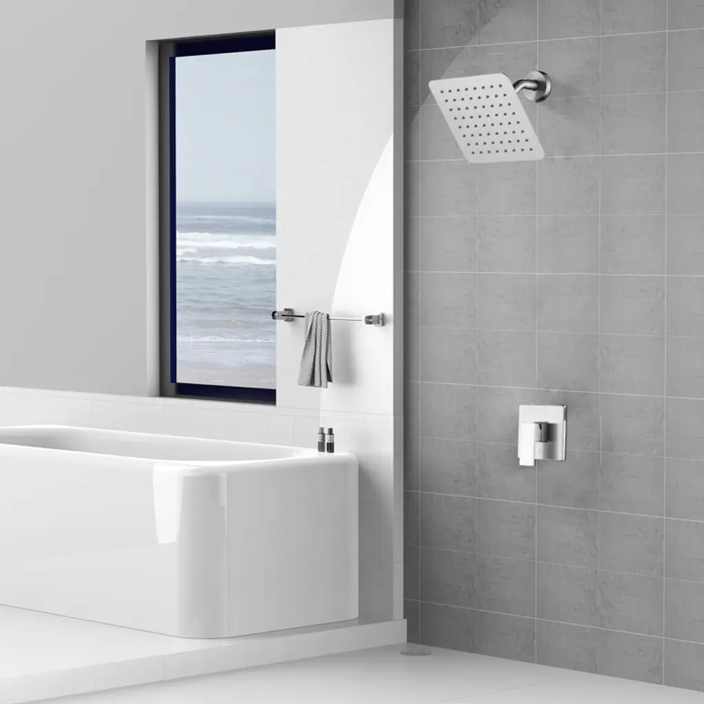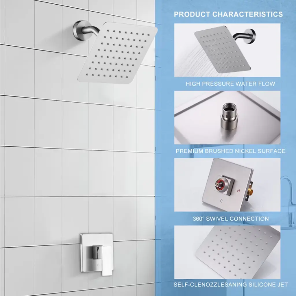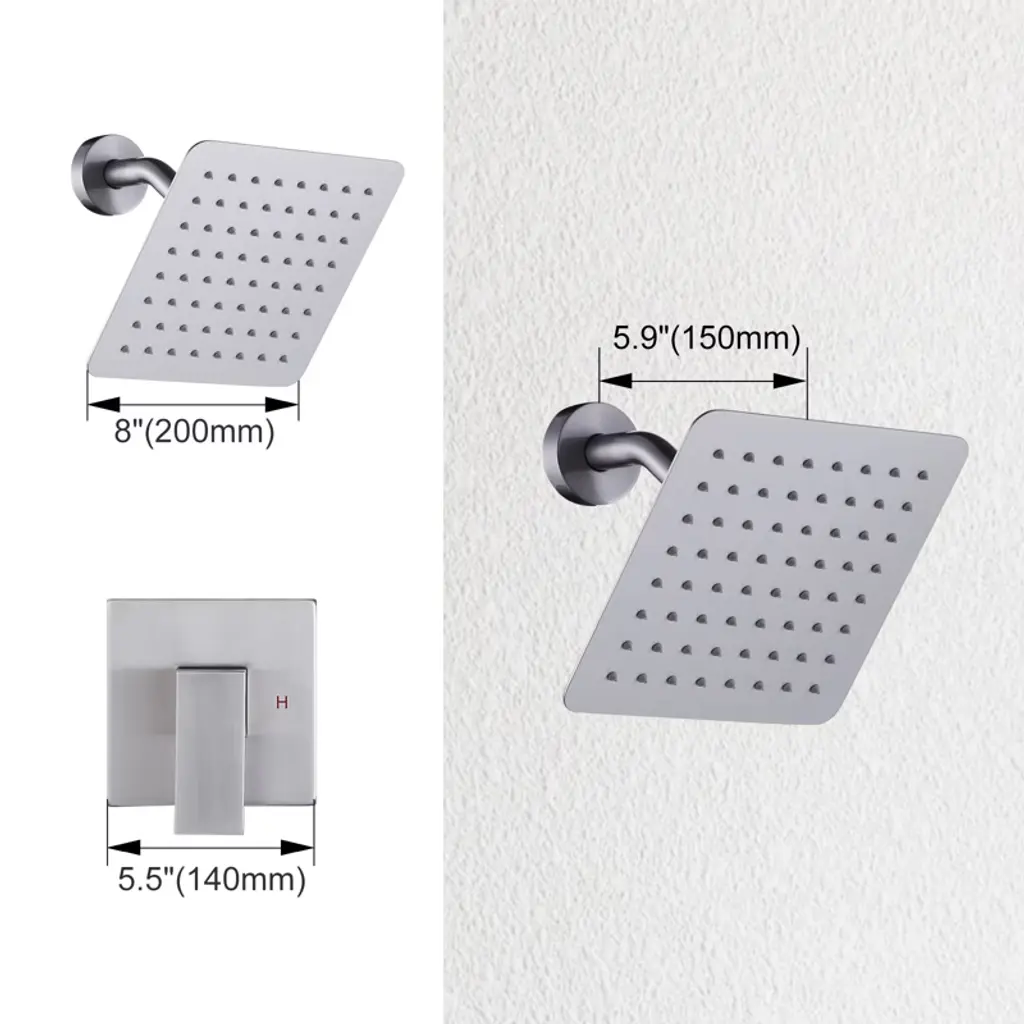 Simple and square-shaped wall-mounted rain shower head with an 8 in. size that fits the majority of bathroom styles. Single handle for temperature control, offering simple and convenient operation. High-quality pressure balance valve ensures a perfect shower relaxation experience. Silicone water outlet for easy cleaning and prevents residue buildup.