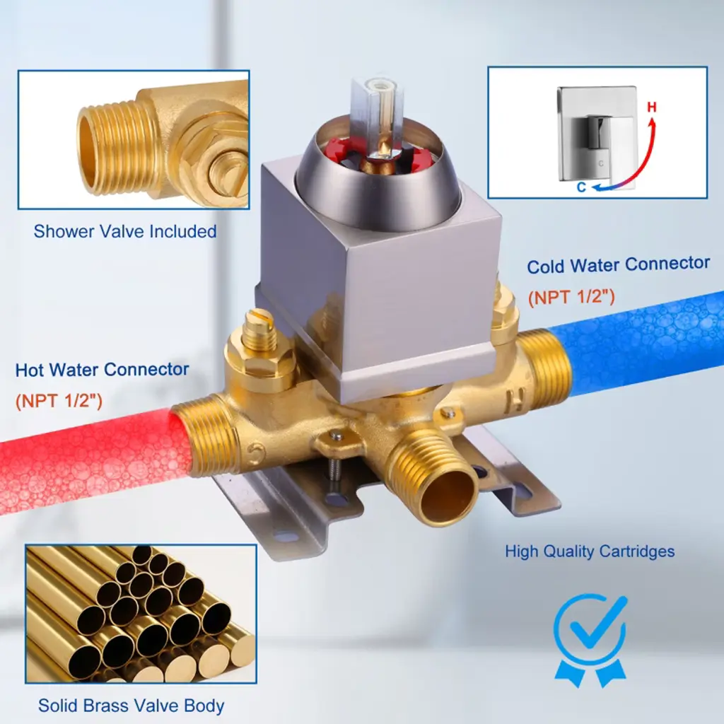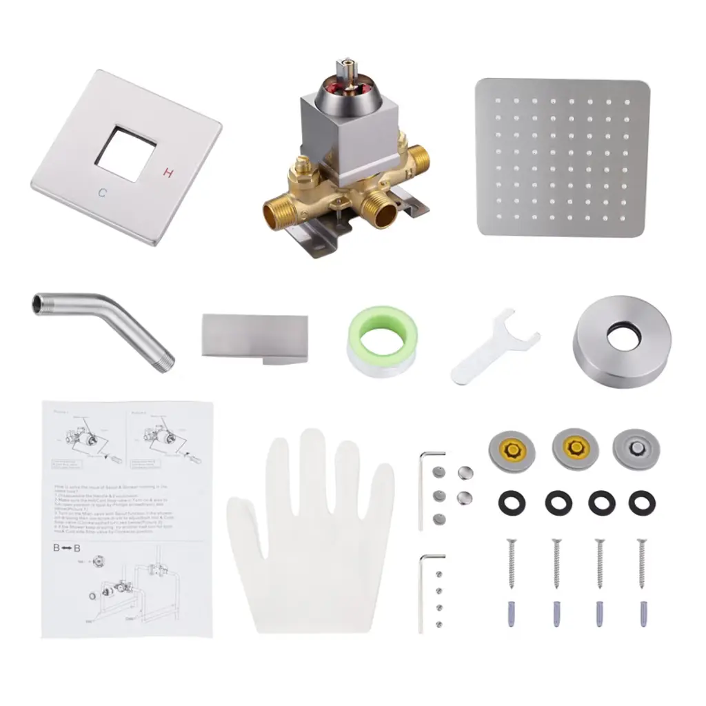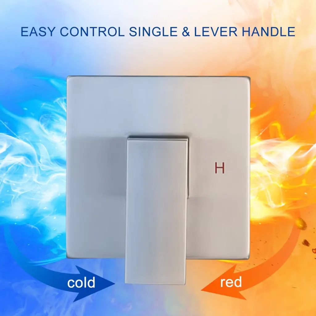Simple and square-shaped wall-mounted rain shower head with an 8 in. size that fits the majority of bathroom styles. Single handle for temperature control, offering simple and convenient operation. High-quality pressure balance valve ensures a perfect shower relaxation experience. Silicone water outlet for easy cleaning and prevents residue buildup.