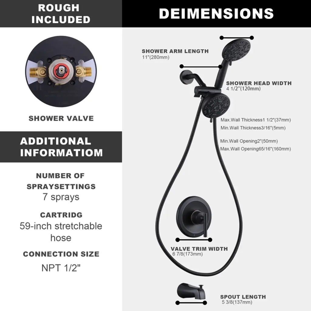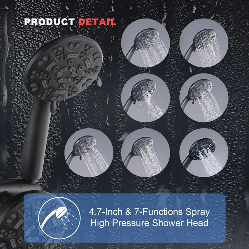 Experience the epitome of luxury and functionality with our Single Handle 7-Spray Shower Faucet with dual shower heads. Crafted for both style and performance, this fixture boasts a streamlined design and a convenient single handle for effortless temperature and water flow control. The 1.8 GPM (gallons per minute) showerhead delivers a satisfying spray, providing a refreshing and invigorating shower experience. Elevate your daily routine with this meticulously designed shower faucet, marrying efficiency with a touch of sophistication in every aspect of your bathroom.