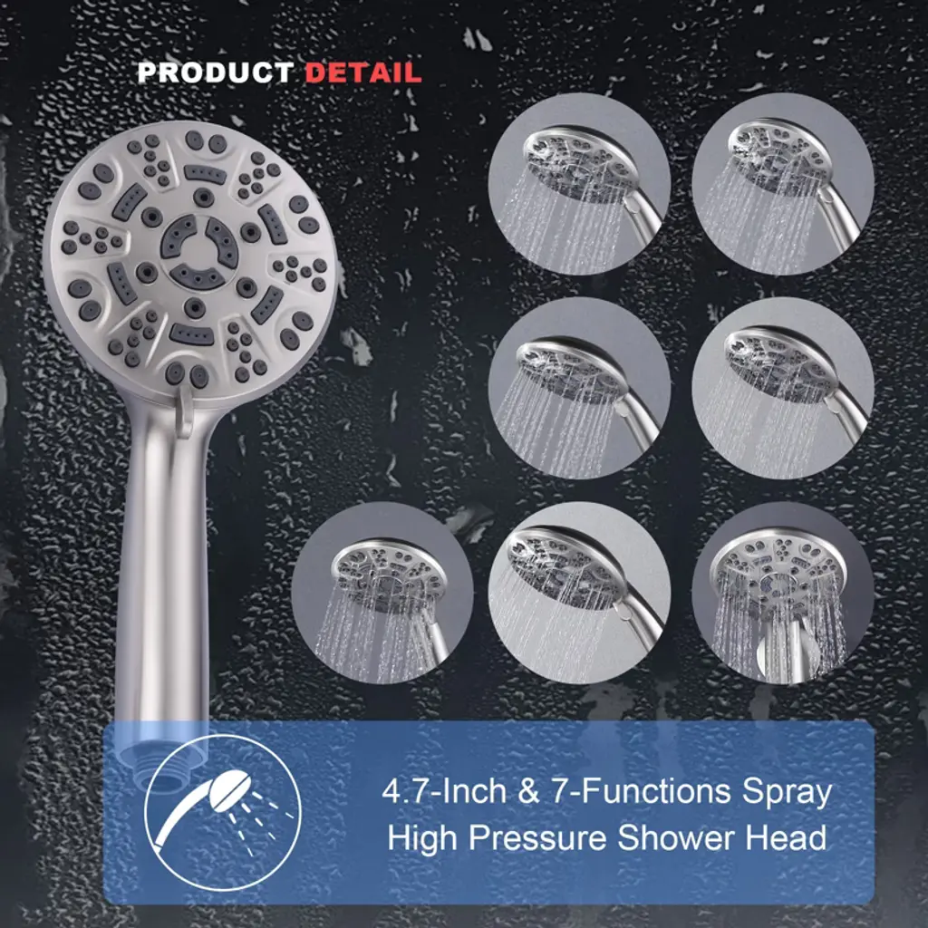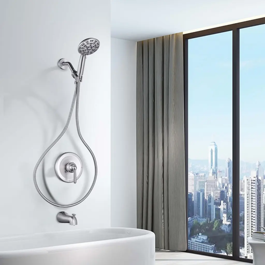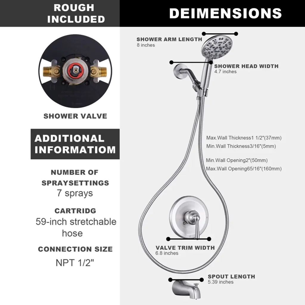 This shower faucet integrates 7 well-designed shower patterns to fully meet your personalized bathing needs, making every shower an ultimate enjoyable experience. 70 in. extra long shower hose makes your showering process more flexible. Fixed in-wall shower faucet, perfect integration with the overall bathroom style, also makes the bathroom space more neat, low-level design bathtub spout, to meet your immediate water needs. The solid brass fixed shower head connector not only regulates the water flow accurately, but also ensures a long service life, giving you a great showering experience.
