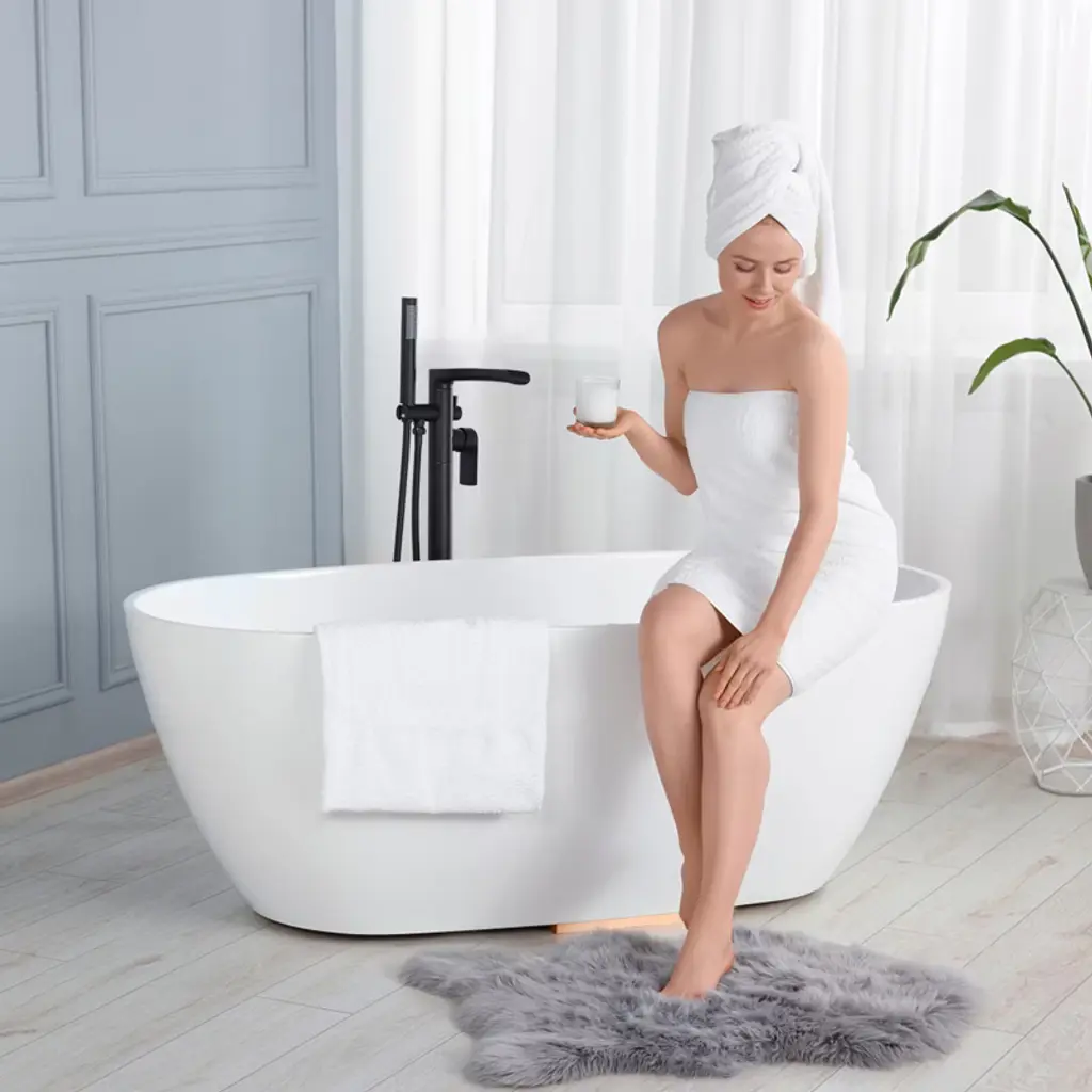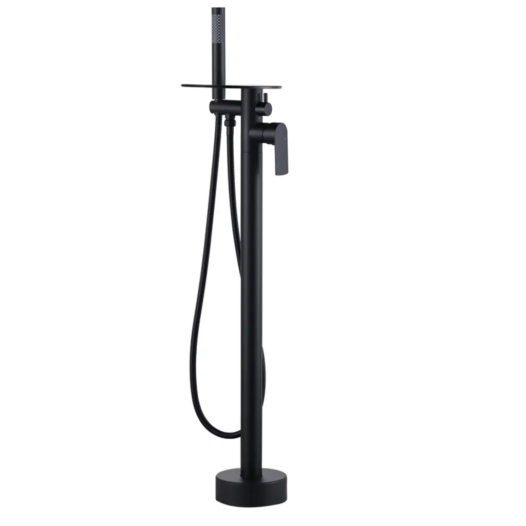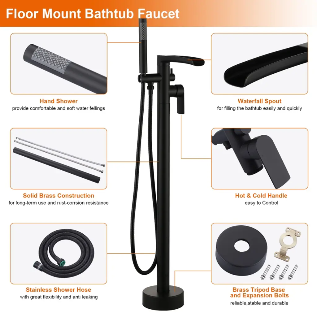This freestanding tub faucet is an indispensable high-end addition to the modern bathroom with its exceptional quality and design. The sturdy brass structure not only ensures the faucet's stability and durability, but also imparts an elegant texture. The flexible hand shower is equipped with a stainless steel hose, which is structurally effective in preventing water leakage, making every use worry-free. The sturdy brass base further enhances the overall stability and keeps the faucet firm and shaky even when the water flow is strong. Most notably, the faucet is equipped with a convenient water switching knob that allows users to easily select whether the water comes out of the handheld shower or the bathtub spout with a simple twist, improving bathing efficiency.