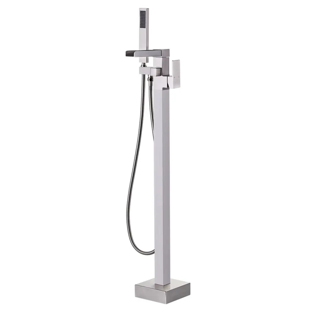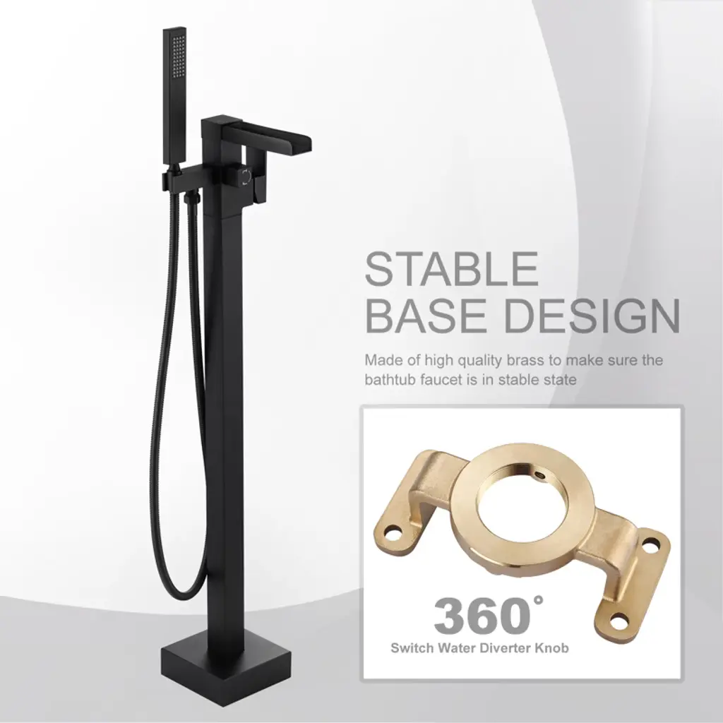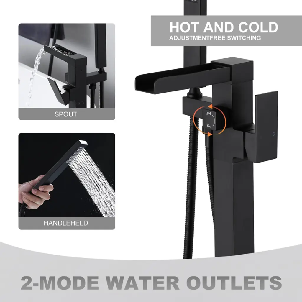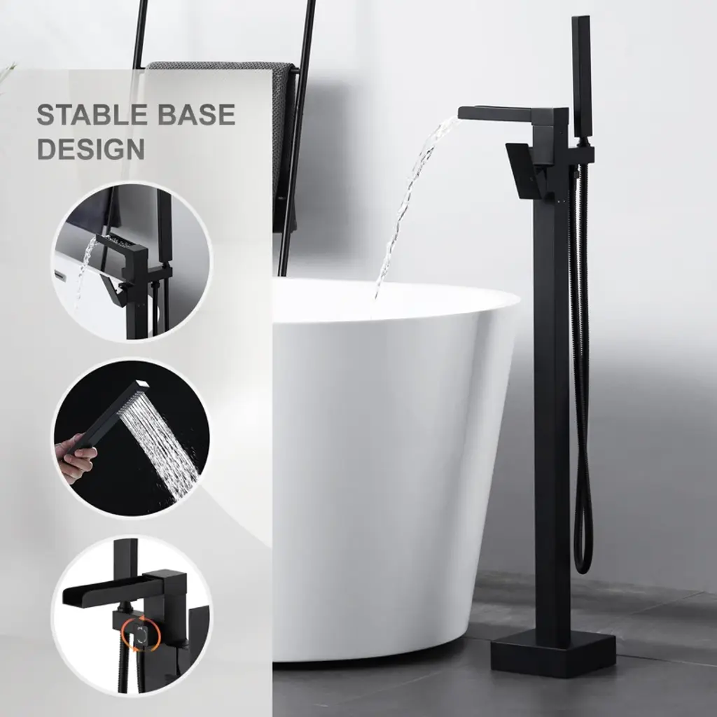 This elegant bathtub faucet, crafted from high-quality solid brass with anti-pressure and heat resistance functions, features a sleek design with a waterfall spout and handheld showerhead. Designed for floor-standing installation, it provides both soaking tub and standing shower options. The high-flow spout ensures quick and warm filling, while the 59-inch (150 cm) hose handheld shower offers maximum flexibility for various shower needs, including full-body showers, tub cleaning, and pet bathing. Its practicality, versatility, and easy installation make it a standout choice for any bathroom.