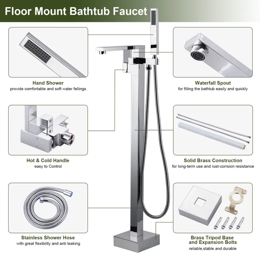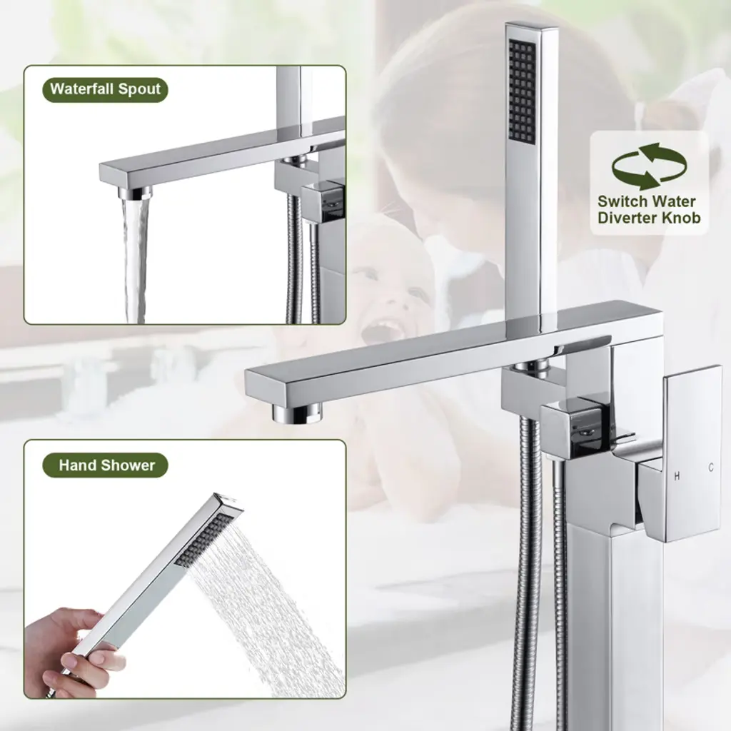 Our freestanding bathtub faucet has a stylish appearance and its smooth lines will add a touch of modernity to your bathroom. Its multi-functional design is a highlight of the freestanding bathtub faucet, which not only can easily adjust the water temperature and flow, but also has 2-water outlet modes to choose from, meeting your different needs and bringing you unprecedented bathing enjoyment. Choose our floor standing bathtub faucet to upgrade your bathroom and enjoy a comfortable bathing experience.
