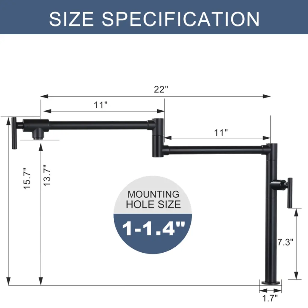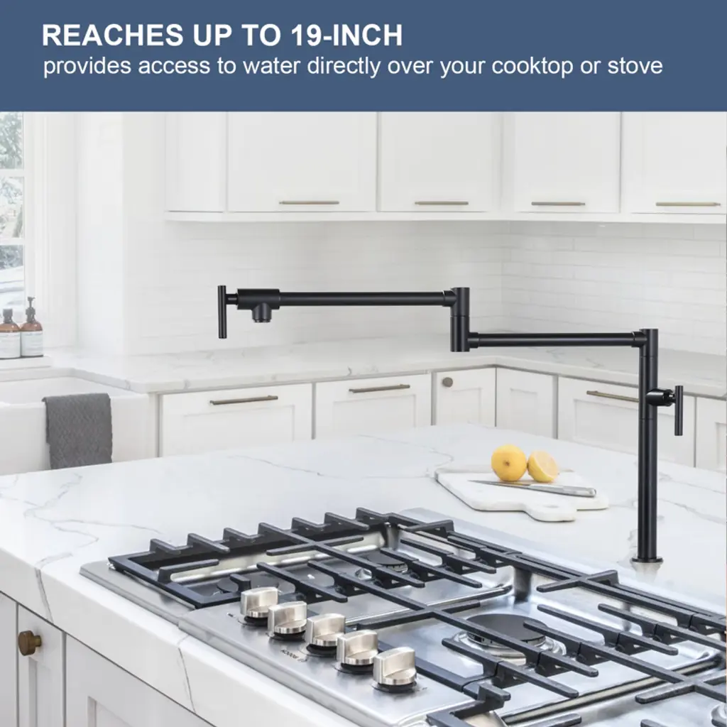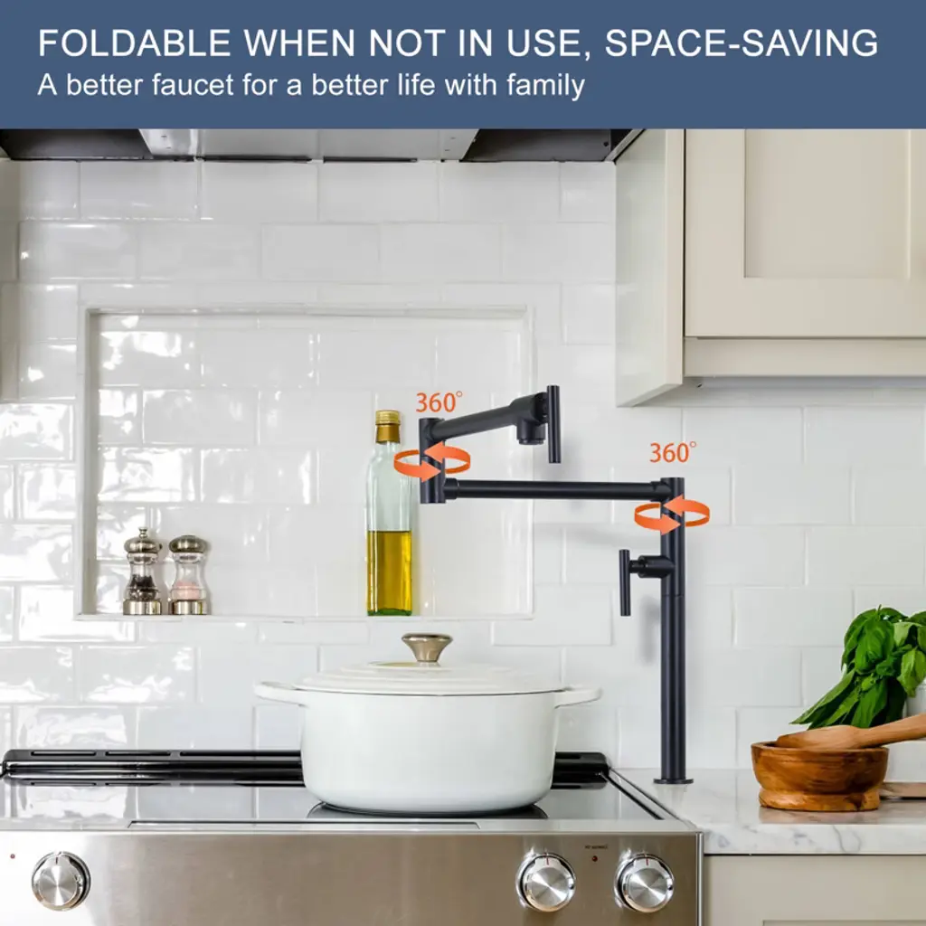 Experience kitchen convenience with our Pot Filler Faucet Deck Mount Stove Faucet. Crafted for efficiency, its 360° rotation and double joints extend up to 22 in., saving space and simplifying cooking. The deck-mount design ensures easy installation. Upgrade your kitchen with this stylish and functional addition.