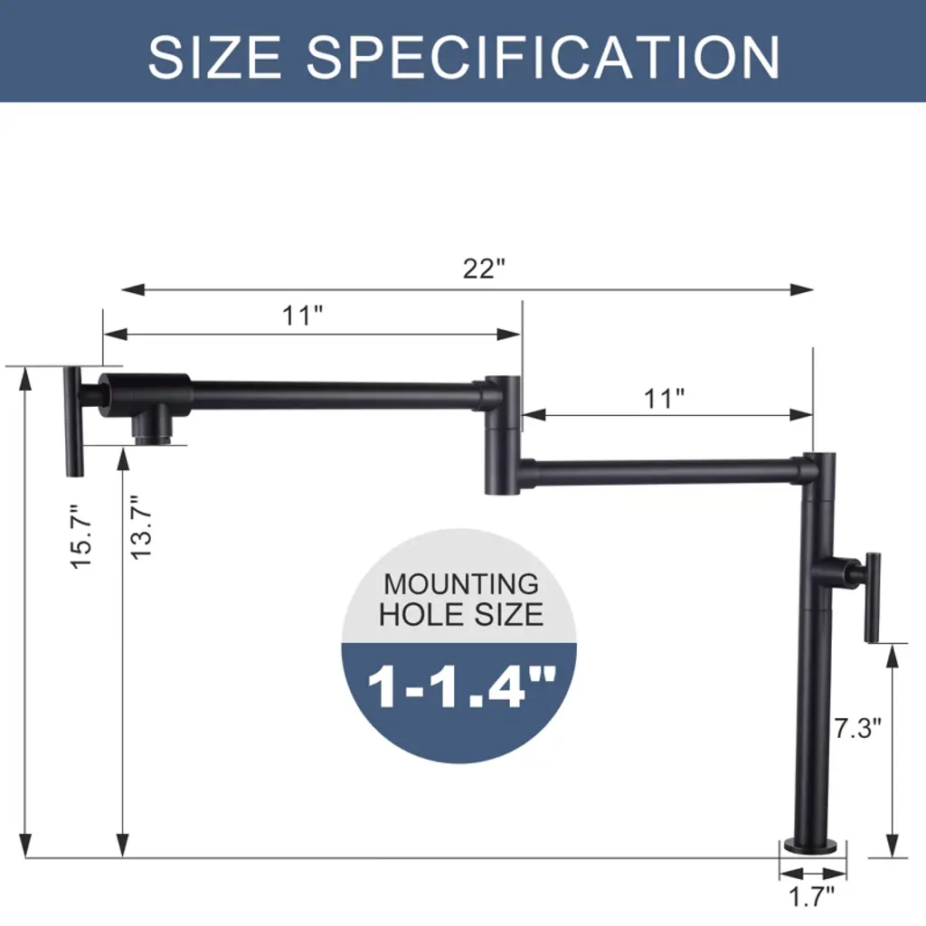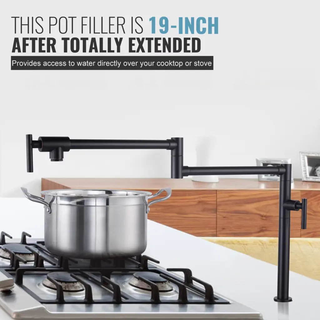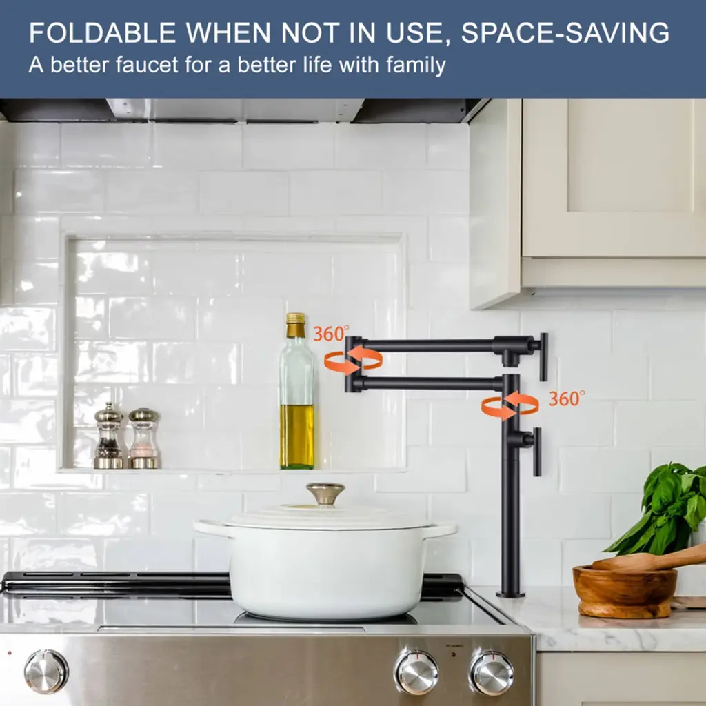 Experience kitchen convenience with our Pot Filler Faucet Deck Mount Stove Faucet. Crafted for efficiency, its 360° rotation and double joints extend up to 22 in., saving space and simplifying cooking. The deck-mount design ensures easy installation. Upgrade your kitchen with this stylish and functional addition.