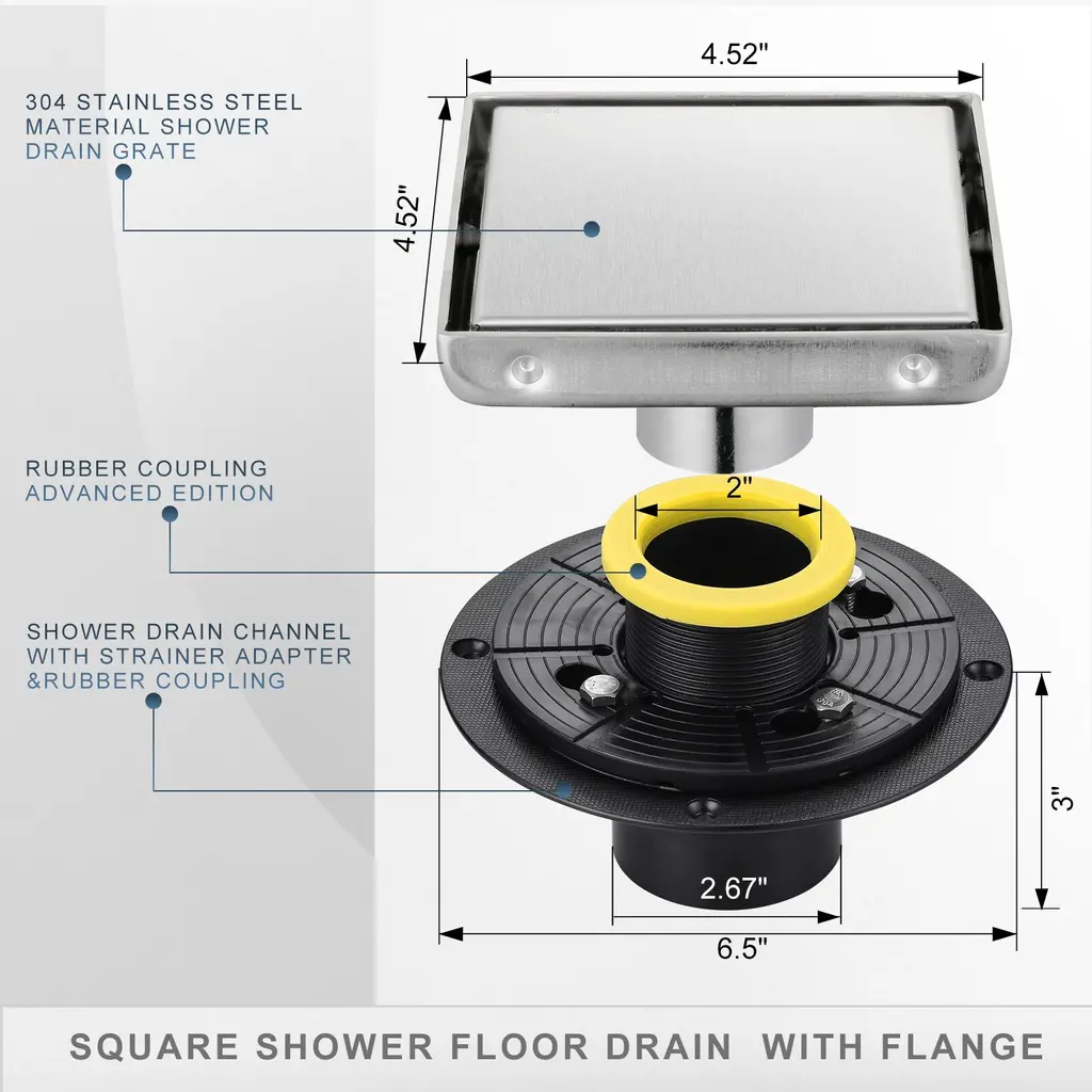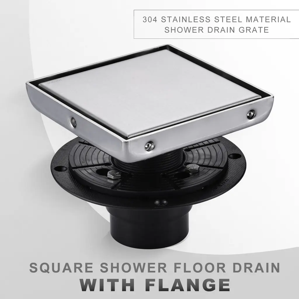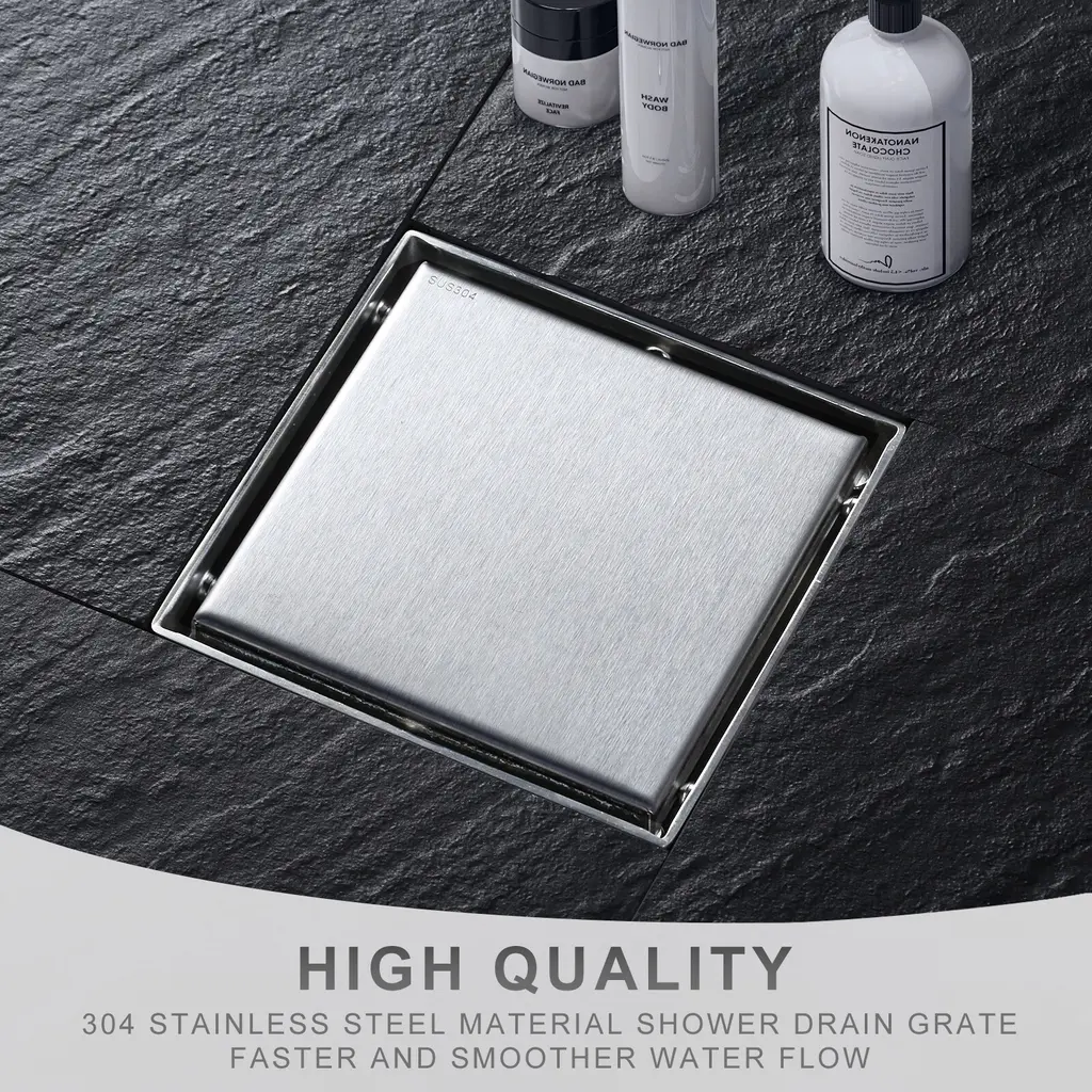 The floor drain has completely become a decoration for bathrooms, kitchens, swimming pools and other places where it is suitable. The flip face mask is embedded in the ceramic tiles to make your shower room more natural and harmonious.The surface of this floor drain adopts the process of brushed nickel, in addition to having a unique bright appearance, it can be more effective anti-rust, anti-oxidation and anti-scratch.This floor drain has a small lifting hook, which can help you quickly and easily lift the detachable lid for cleaning, so as to keep the floor drain and sewer clean, and let your bathroom and kitchen feel the fragrance every moment.This floor drain is equipped with a stainless steel filter, which can effectively capture hair and valuable small objects, such as rings, bracelets, necklaces, etc., to avoid clogging the drain pipe, allowing you to perform washing tasks with peace of mind.This floor drain outlet is 2 inches in diameter and has a high flow capacity of 20-25 L/min. It can drain quickly, avoid the problem of water accumulation on the shower room or swimming pool floor.Our products strictly control the quality details of each floor drain. The thicker main body and panel protection layer are more durable, prevent rust, have quality, and show high grade.Feature: