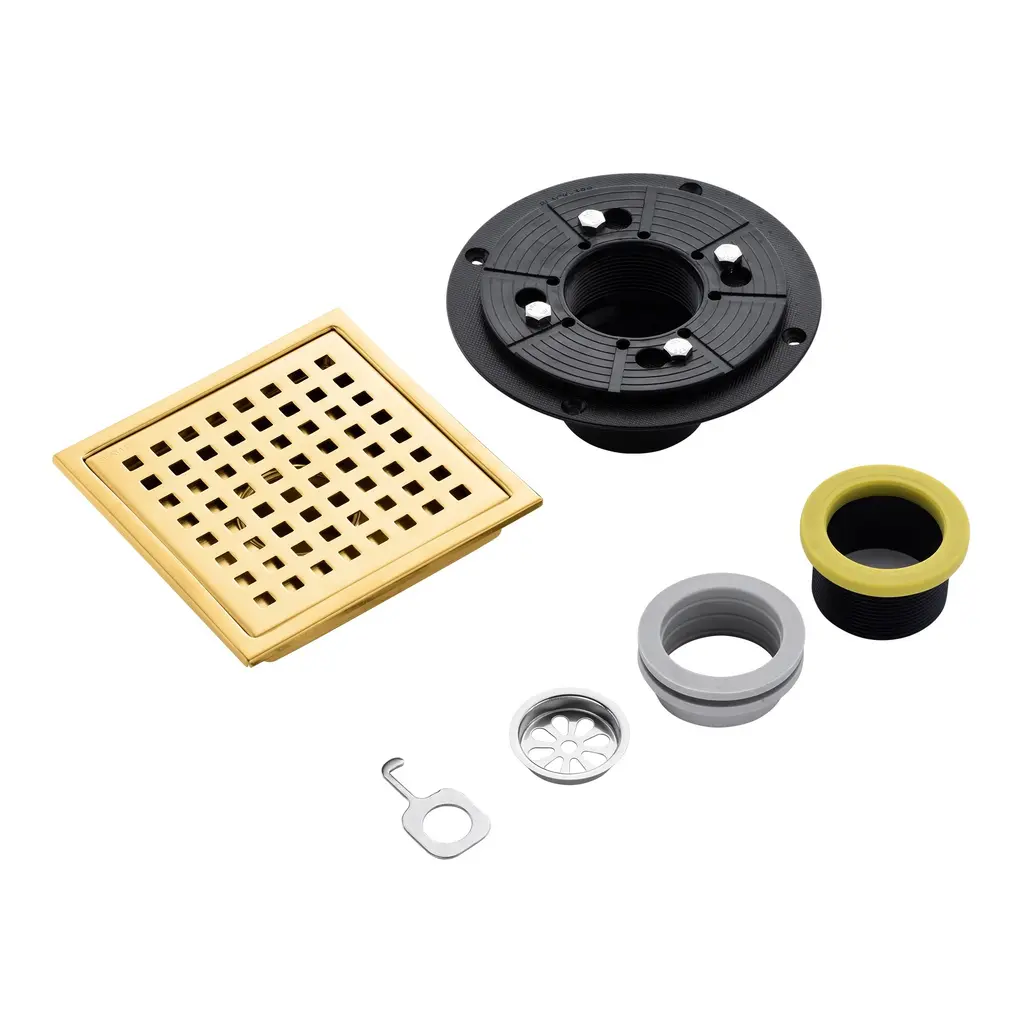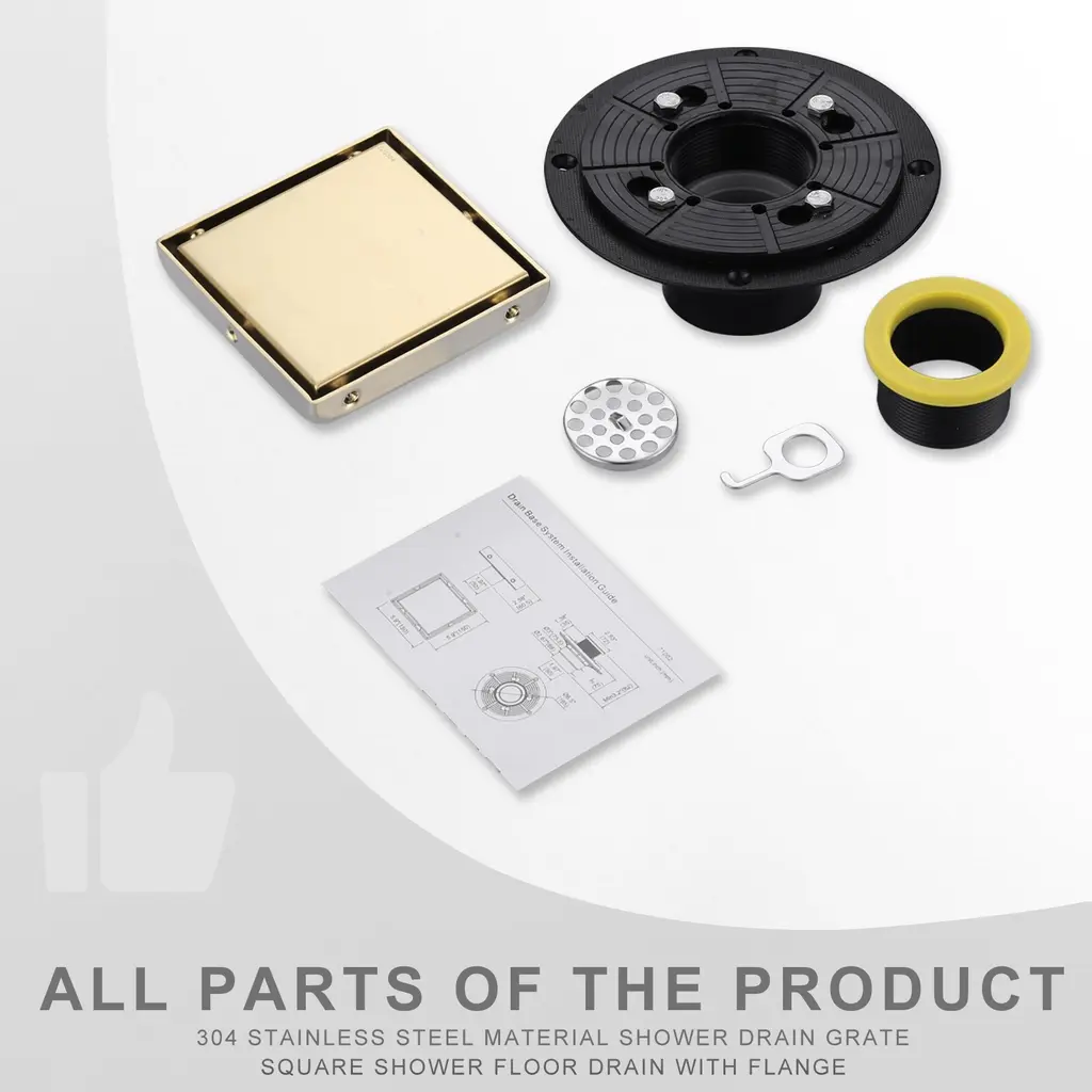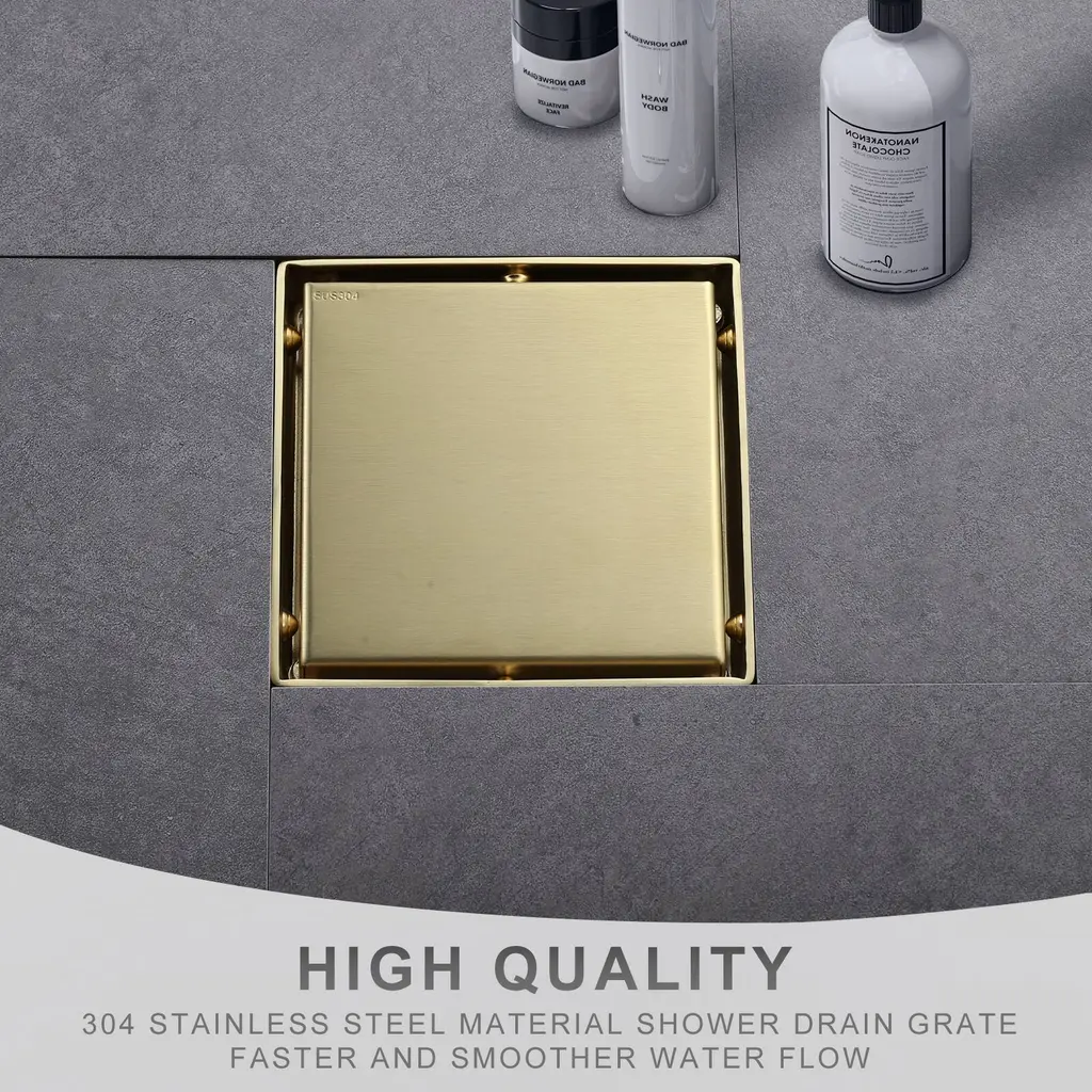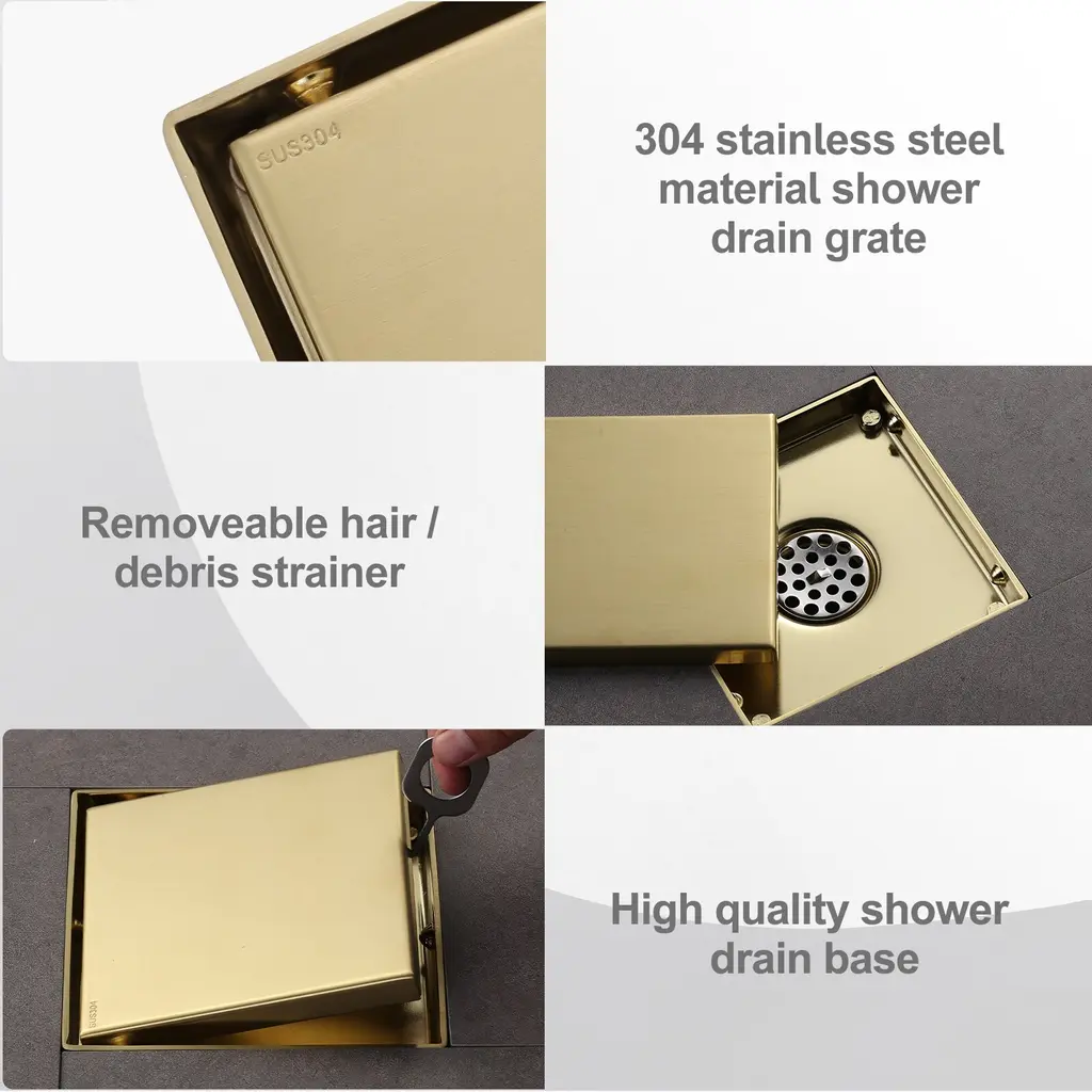 Wowow Square Shower Drain With Tile Insert Grate And Hair Strainer - Gold