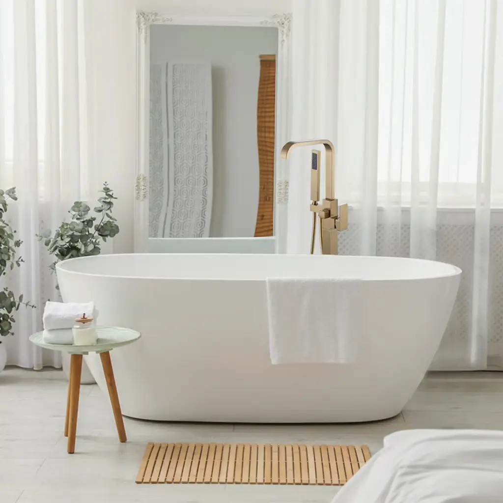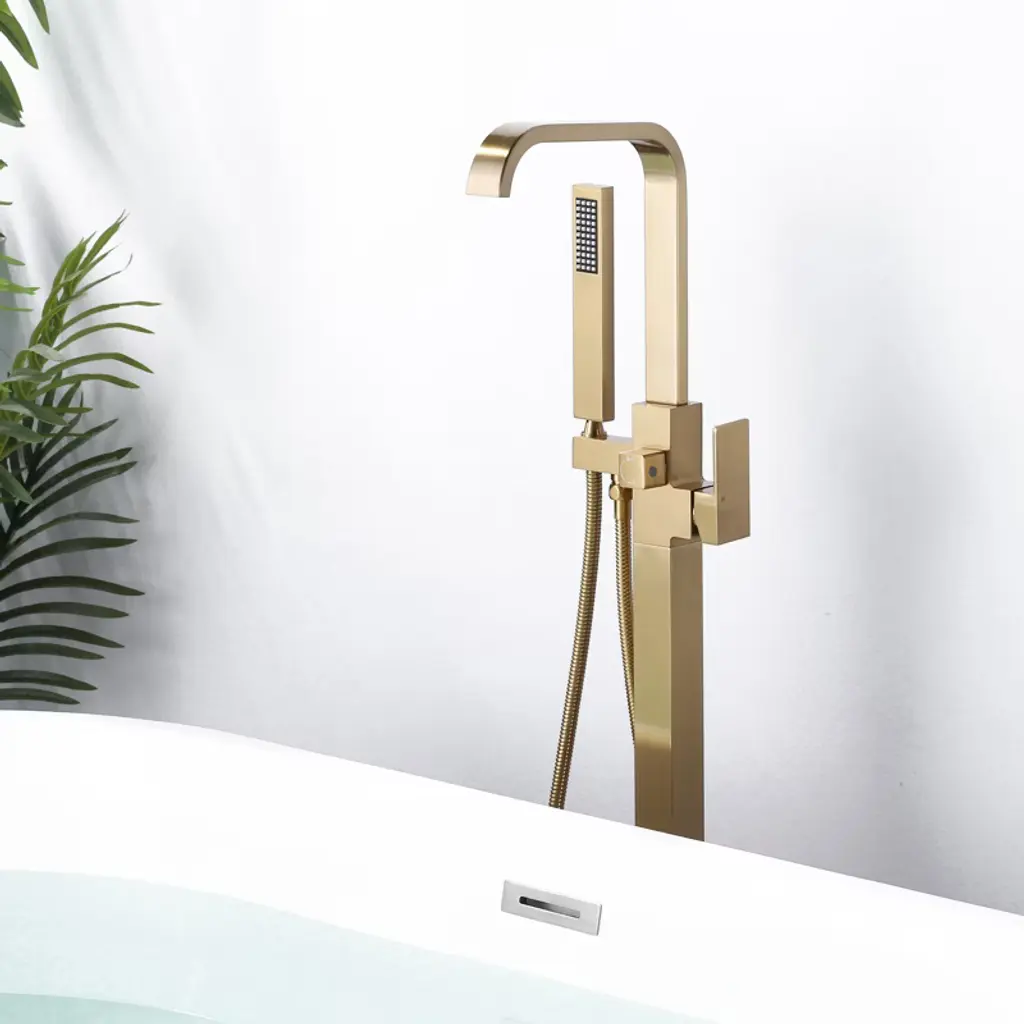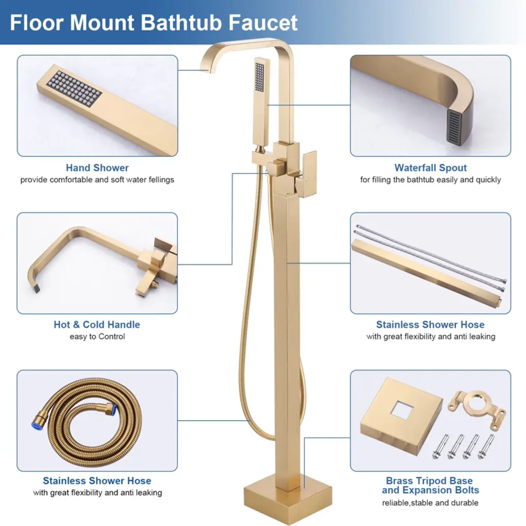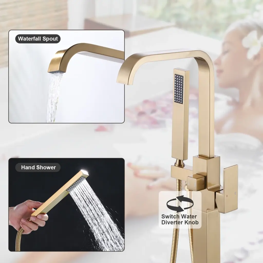 Crafted from high quality brass, our products combine exquisite beauty with superb durability to ensure long-lasting performance and durability. The single lever handle seamlessly adjusts water temperature and flow, allowing you to easily control your bathing experience. The integrated diverter adds versatility, allowing you to easily switch between the tub filler and the convenient hand shower, adding flexibility to your bathing routine. The unique spout design allows you to enjoy the soothing sensation of a waterfall, perfect for creating a tranquil bathing environment. Our freestanding bathtub faucet has a flexible design that eliminates the need for a wall-mounted unit, keeping your bathroom elegant and tidy.