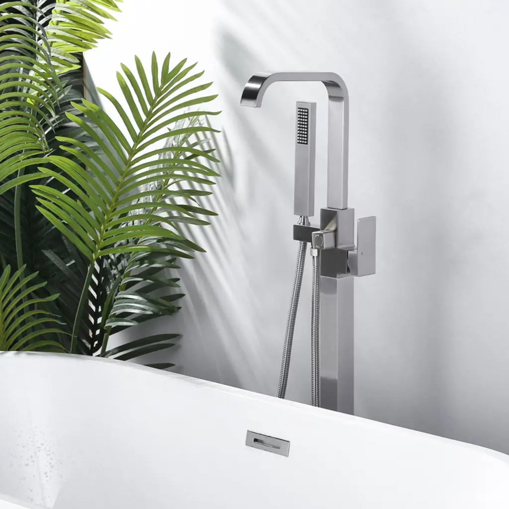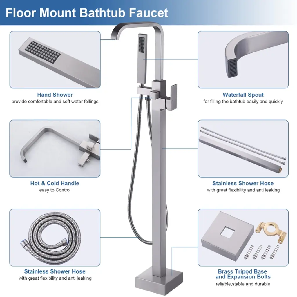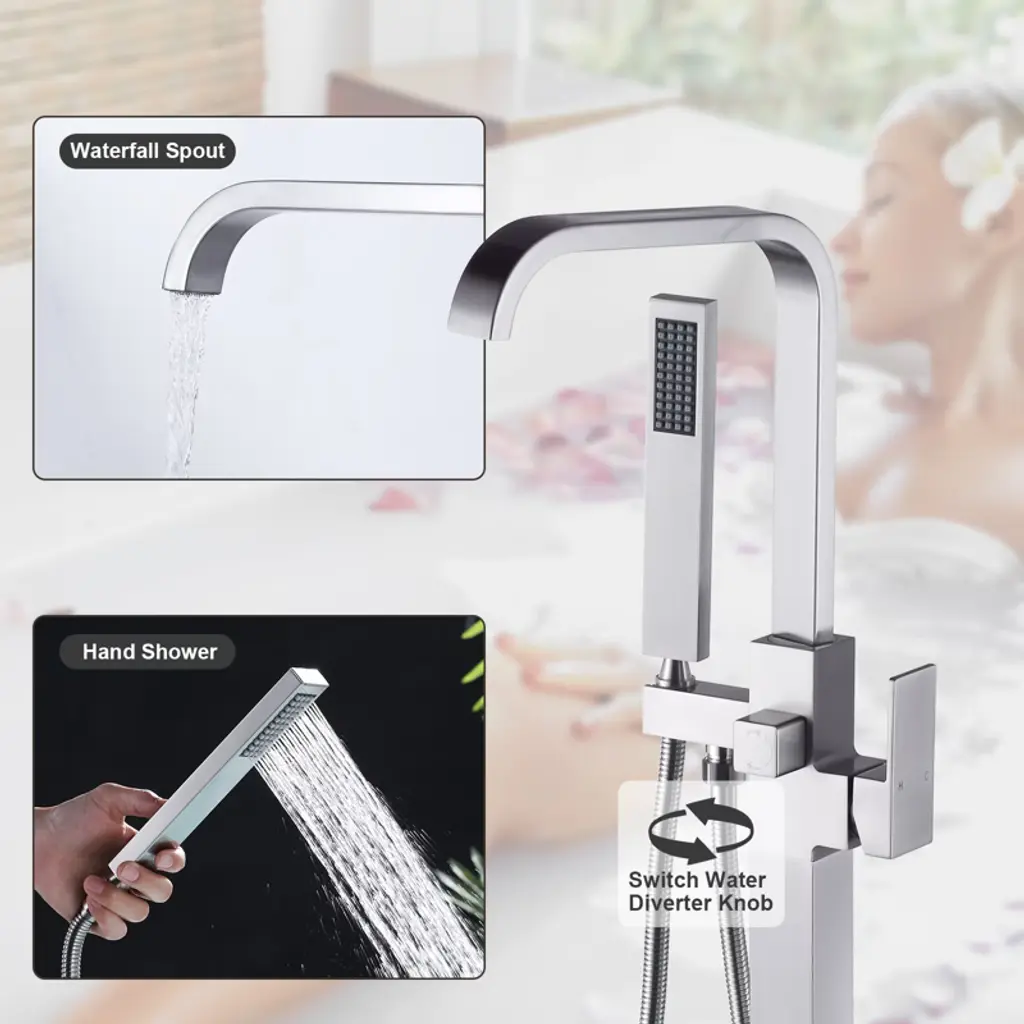 Crafted from high quality brass, our products combine exquisite beauty with superb durability to ensure long-lasting performance and durability. The single lever handle seamlessly adjusts water temperature and flow, allowing you to easily control your bathing experience. The integrated diverter adds versatility, allowing you to easily switch between the tub filler and the convenient hand shower, adding flexibility to your bathing routine. The unique spout design allows you to enjoy the soothing sensation of a waterfall, perfect for creating a tranquil bathing environment. Our freestanding bathtub faucet has a flexible design that eliminates the need for a wall-mounted unit, keeping your bathroom elegant and tidy.