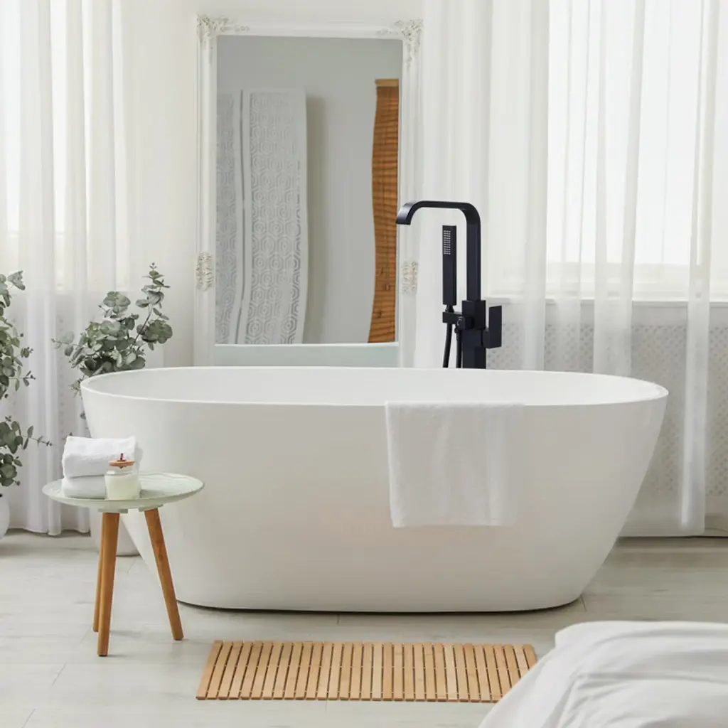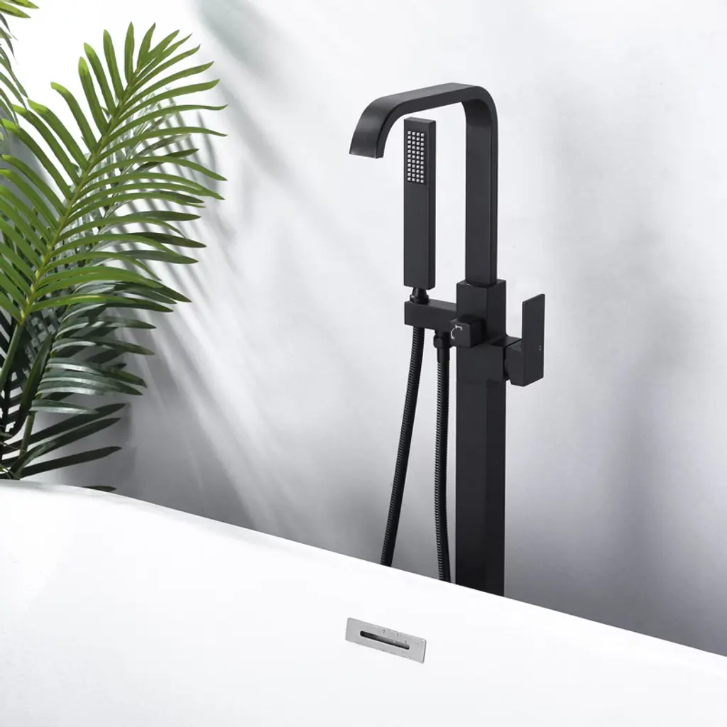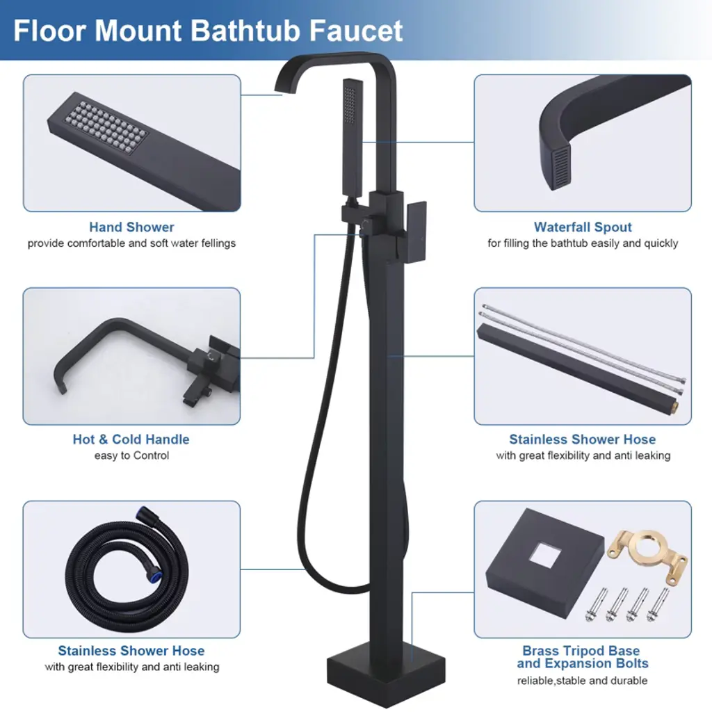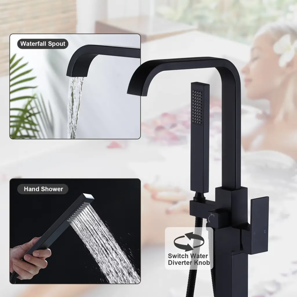 Crafted from high quality brass, our products combine exquisite beauty with superb durability to ensure long-lasting performance and durability. The single lever handle seamlessly adjusts water temperature and flow, allowing you to easily control your bathing experience. The integrated diverter adds versatility, allowing you to easily switch between the tub filler and the convenient hand shower, adding flexibility to your bathing routine. The unique spout design allows you to enjoy the soothing sensation of a waterfall, perfect for creating a tranquil bathing environment. Our freestanding bathtub faucet has a flexible design that eliminates the need for a wall-mounted unit, keeping your bathroom elegant and tidy.