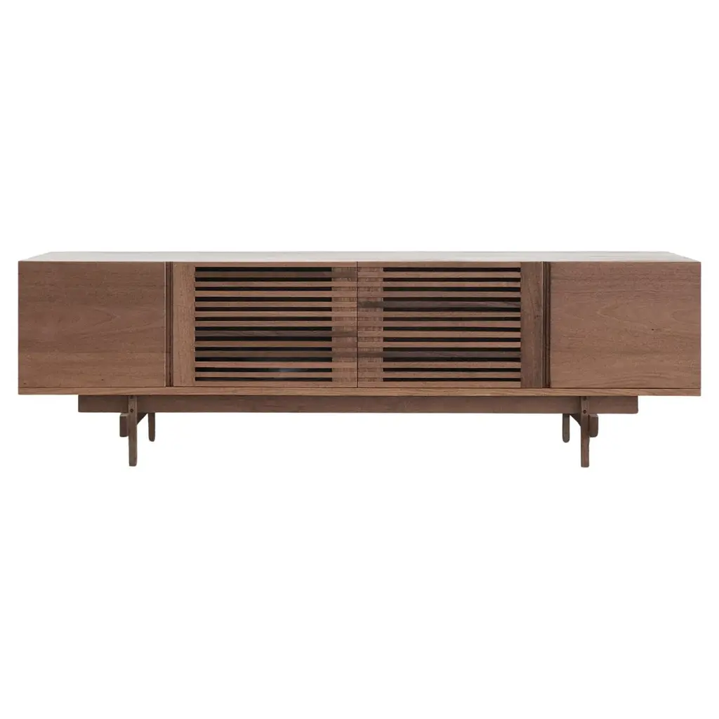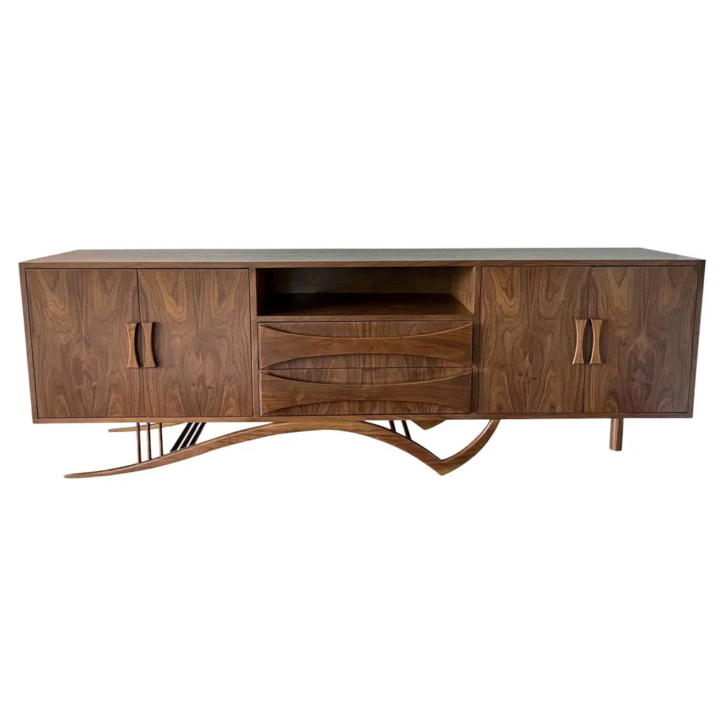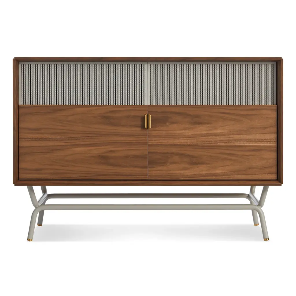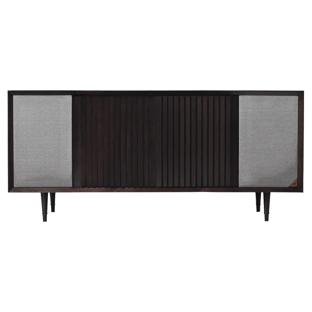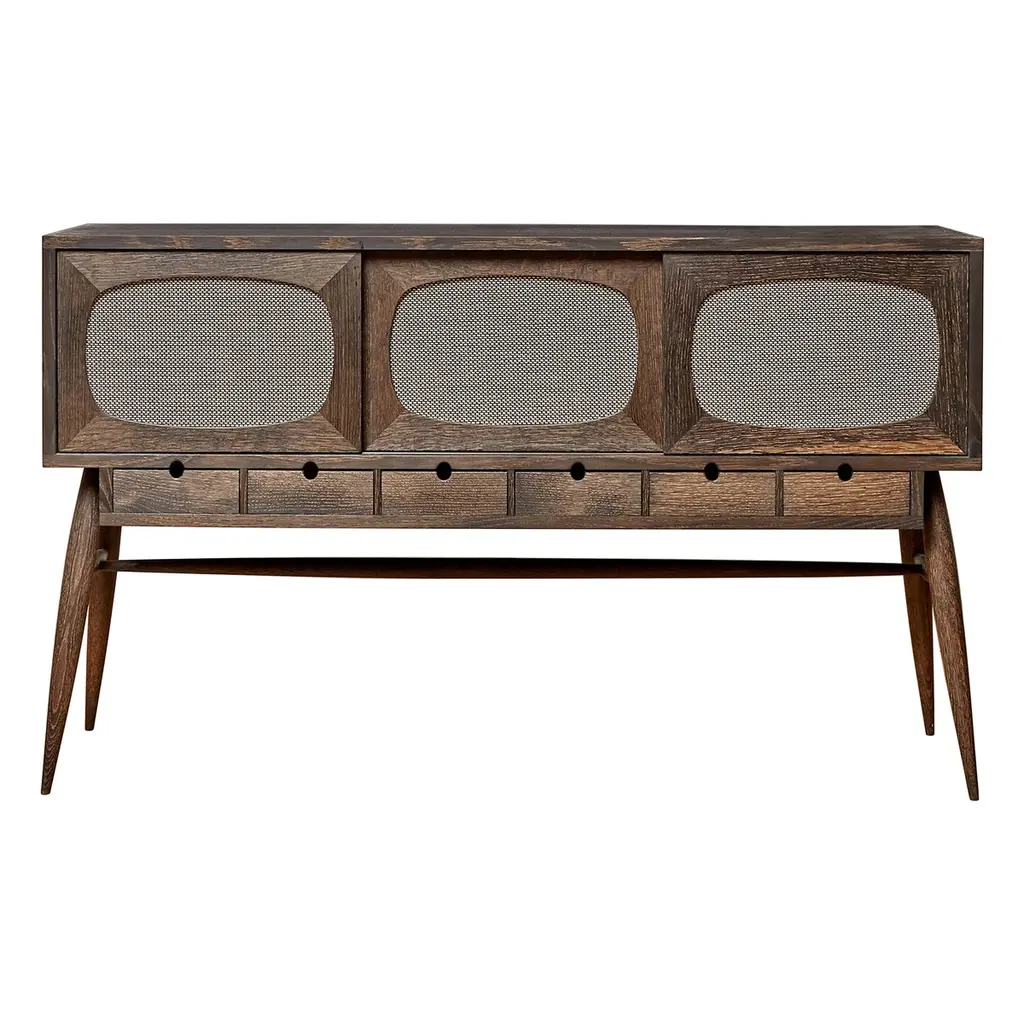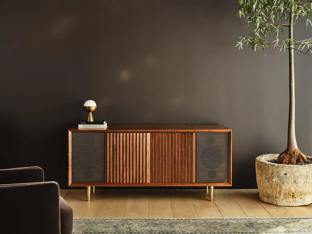 The M1 record console has room-filling Wrensilva sound with five music listening modes including Vinyl, Bluetooth and Sonos®, 200 watts per channel, stow-away lid, lined record pocket, and storage for up to 150 albums. Handmade in San Diego the M1 features hand-selected hardwoods, premium audio performance fabrics with a two-tone weave, and custom spindle legs.- Natural Walnut with Silver and Gold speaker grille fabric and Brushed Brass leg- Grain-matched front frame and speaker panels.- Signature louvered doors with bookmatched grain patterns.- Custom 7.5" spindle legs with adjustable leveling feet.- Lined record pocket and armrest.- Pair your Wrensilva console with existing Sonos speakers throughout your home.- Wrensilva custom turntable with aluminum tonearm and 5/8" frosted acrylic platter- Wrensilva signature 2-way bass reflex speakers- Wrensilva solid state pre-amp- 200 wpc Class D output- Audio output Jacks easily tie into existing in-wall audio systems