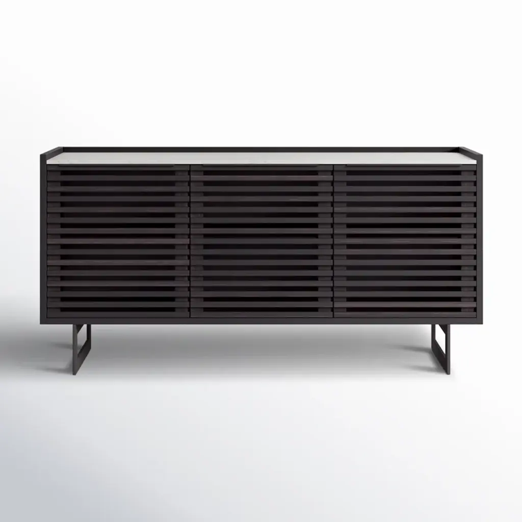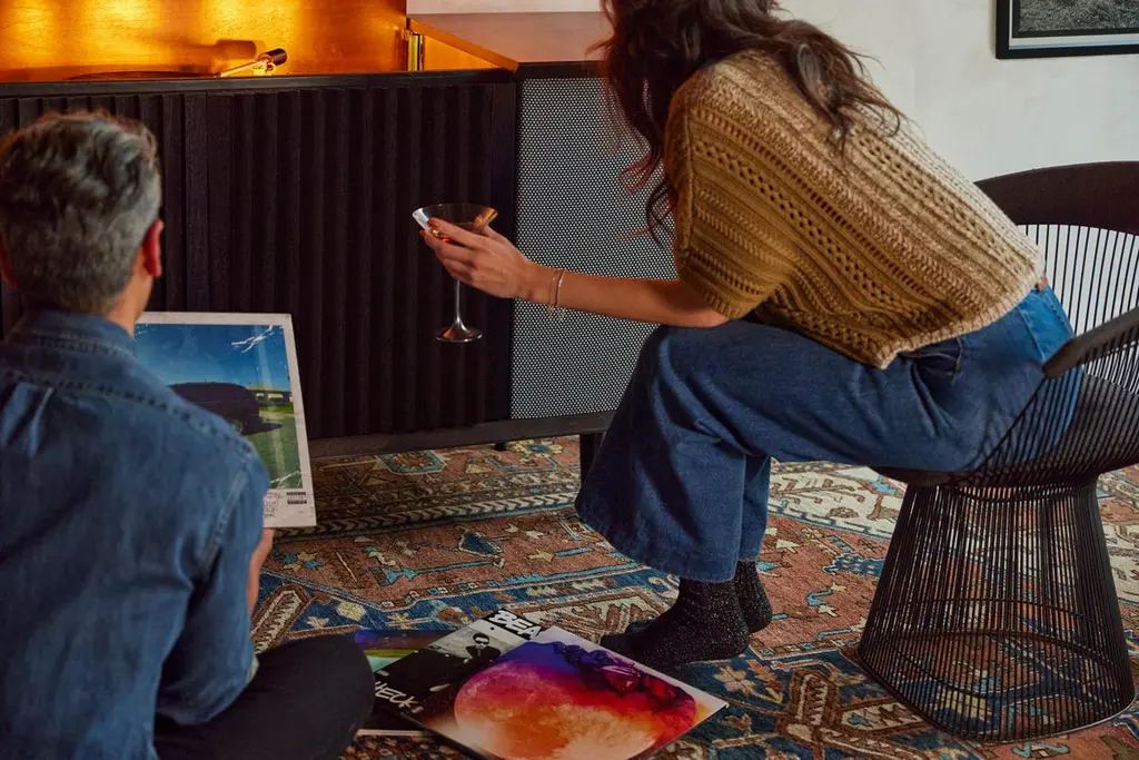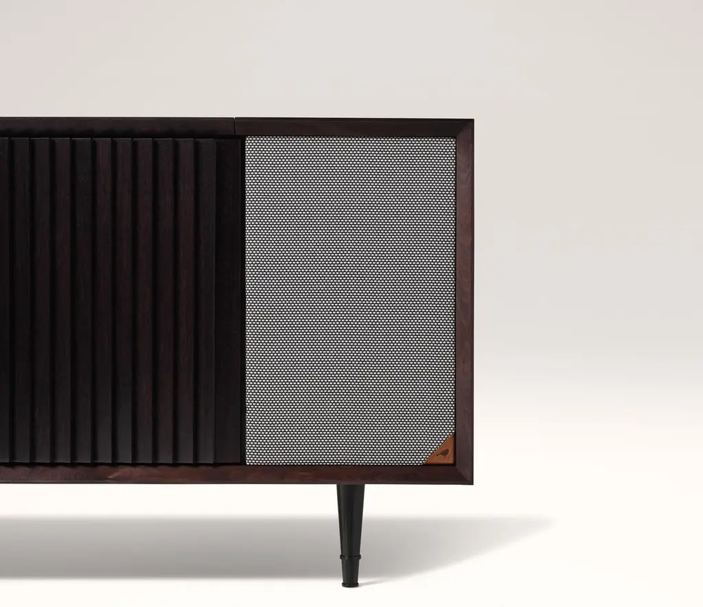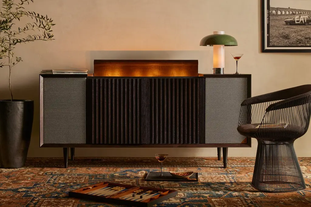 The M1 record console has room-filling Wrensilva sound with five music listening modes including Vinyl, Bluetooth and Sonos®, 200 watts per channel, stow-away lid, lined record pocket, and storage for up to 150 albums. Handmade in San Diego the M1 features hand-selected hardwoods, premium audio performance fabrics with a two-tone weave, and custom spindle legs.- Tobacco Walnut with White speaker grille fabric and Brushed Black leg- Grain-matched front frame and speaker panels.- Signature louvered doors with bookmatched grain patterns.- Custom 7.5" spindle legs with adjustable leveling feet.- Lined record pocket and armrest.- Pair your Wrensilva console with existing Sonos speakers throughout your home.- Wrensilva custom turntable with aluminum tonearm and 5/8" frosted acrylic platter- Wrensilva signature 2-way bass reflex speakers- Wrensilva solid state pre-amp- 200 wpc Class D output- Audio output Jacks easily tie into existing in-wall audio systems
