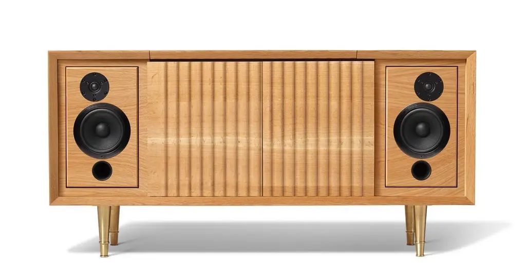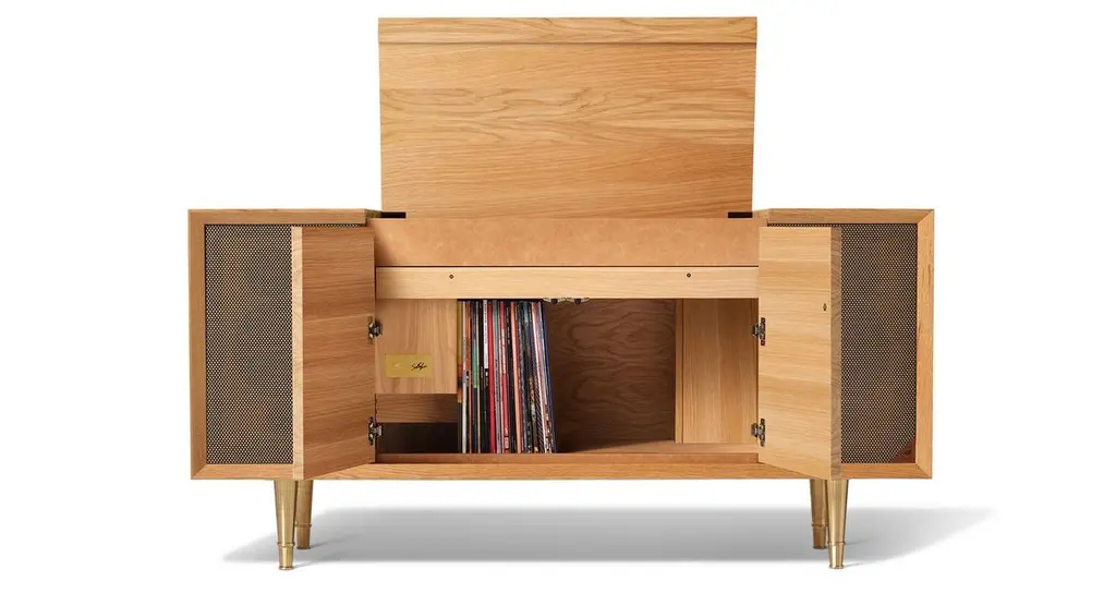 The Standard features five listening modes including Vinyl and Sonos®, 200 watts per channel, lined record pocket, and storage for up to 130 albums. Handmade in San Diego the Standard features hand-selected hardwoods, premium audio performance fabrics with a two-tone weave, and custom spindle legs.- White Oak with Natural speaker grille fabric + Brushed Brass leg- Grain-matched front frame and speaker panels- Fluted door design that highlights the wood’s natural grain and character- Custom 7.5" spindle legs with adjustable leveling feet- Soft-close hinges- Lined record pocket and armrest- Hand-signed and numbered brass badge verifies your Wrensilva is sound certified- Pair your Wrensilva console with existing Sonos speakers throughout your home.- Wrensilva custom turntable with aluminum tonearm and 5/8" frosted acrylic platter- Wrensilva signature 2-way bass reflex speakers- Wrensilva solid state pre-amp- 200 wpc Class D output- Audio output Jacks easily tie into existing in-wall audio systems