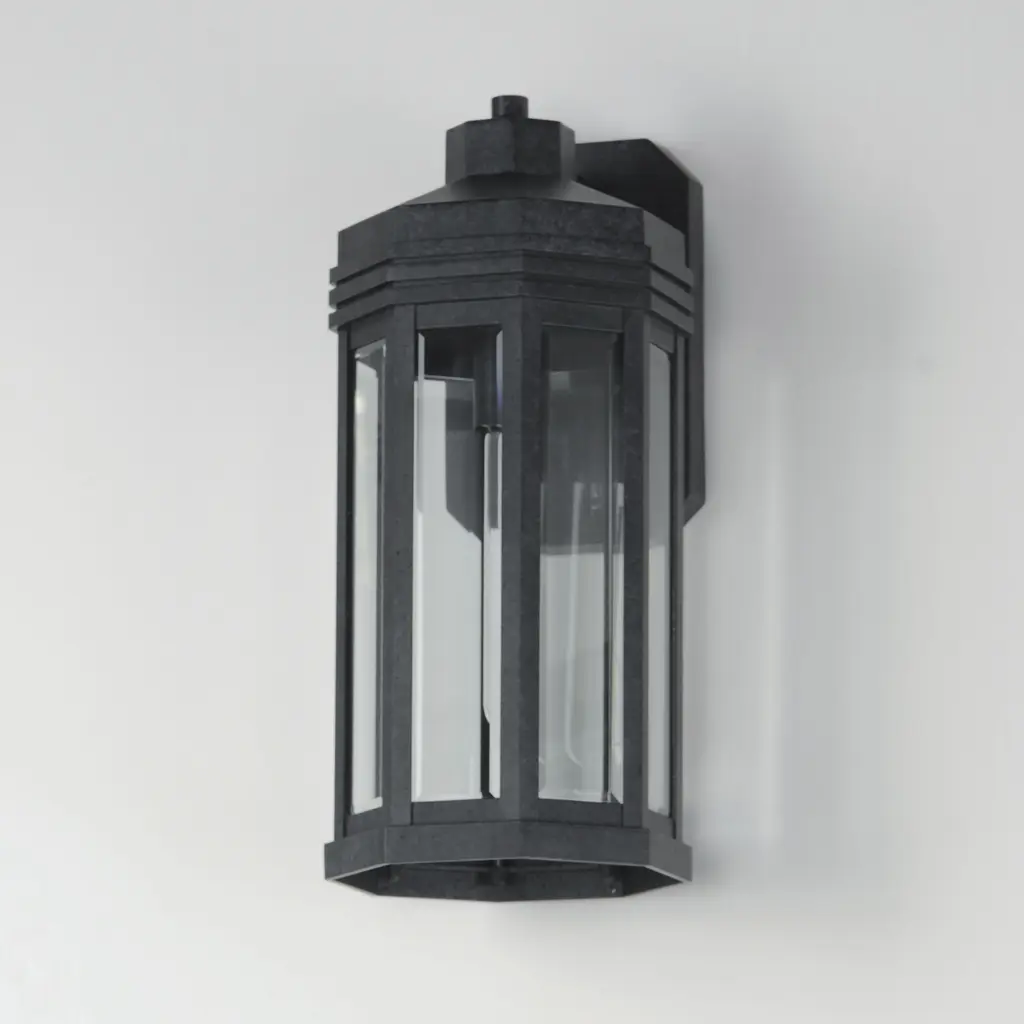 Inspired by the intricate geometric motifs of the iconic architect, the Wright collection of outdoor lighting features a hexagonal frame with tiered louvers along its hood. Beveled at its edges, the Clear glass panes encase the lighting cluster within a robust die cast aluminum body and aluminum frame. Finished in a rich Black Patina, this outdoor series provides thoughtful touches and rich finishes to make a timelessly elegant lighting collection.