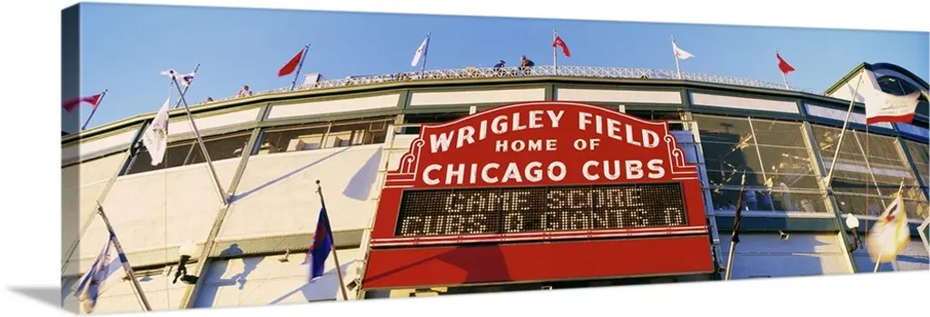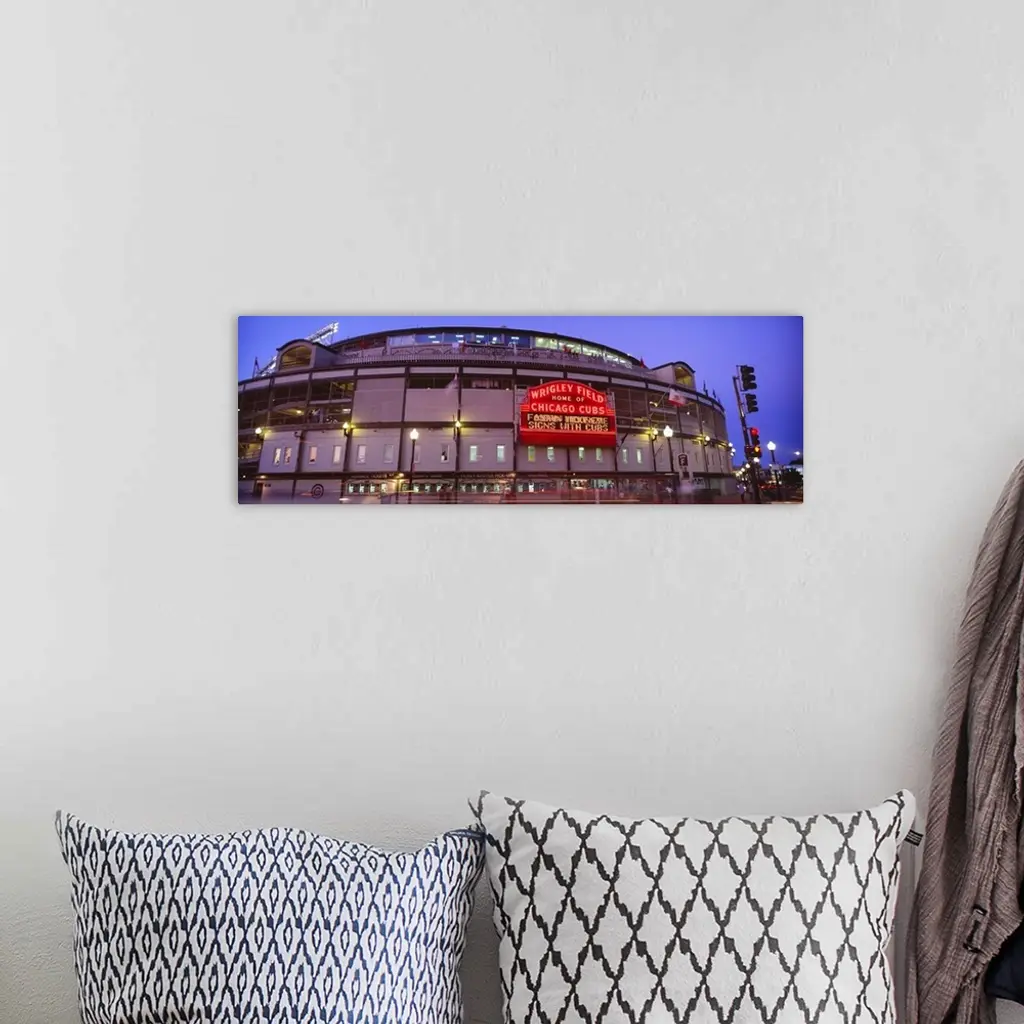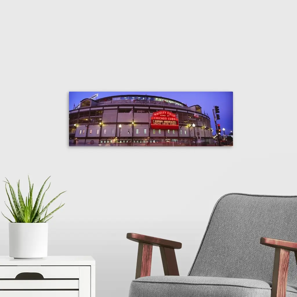 Panoramic photograph of the outer walls and sign of Wrigley Field where the Chicago Cubs play baseball, taken in the early evening.