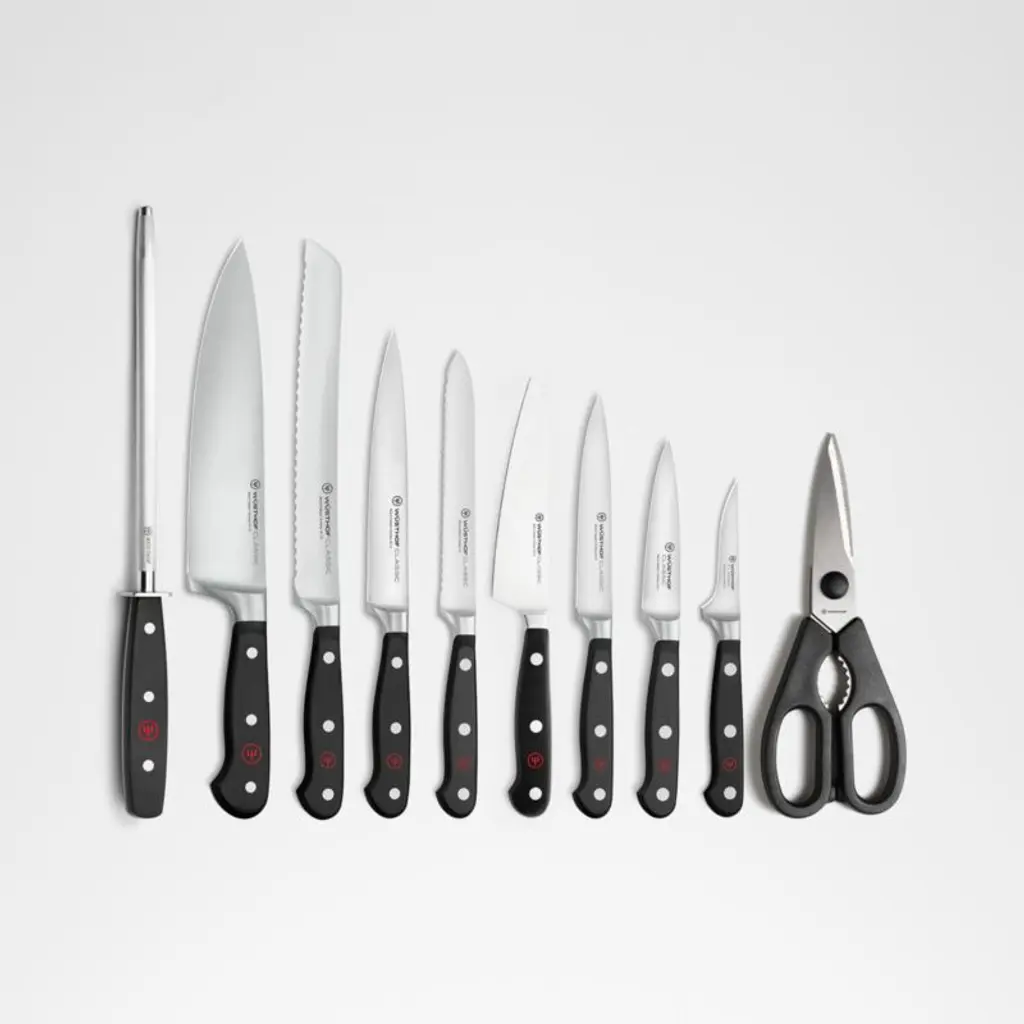 Everything you need to start chopping and prepping. This set of knives by Wüsthof, one of the most respected names in cutlery, features six essential knives and a honing steel to keep them sharp. Made of high-carbon, no-stain blades the knives are weighted with a full tang for exceptional weight and balance. This set includes 2.75-inch trimming knife, 3.5-inch paring knife, 4.5-inch utility knife, 4.5-inch Asian utility knife, 5-inch serrated utility knife, 6-inch utility knife, 8-inch bread knife and 8-inch cook's knife, 9" honing steel and come-apart kitchen shears in a 15-slot acacia wood block with room to spare.Produced by skilled craftspeople in the knife-producing capital of the world, Wüsthof blades have been crafted in Solingen, Germany, for over 200 years. Need help choosing? Here's your essential guide to choosing the best knifeView all Wusthof products