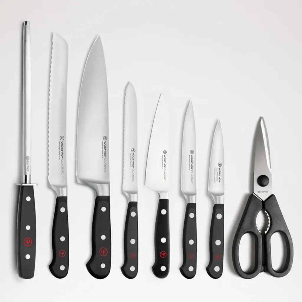 Cut, chop and slice like the pros with this deluxe knife set from Wüsthof, one of the most respected names in cutlery. A best seller for generations, the company's Classic collection features blades that are precision forged from a single blank of high-carbon stainless steel with triple-riveted, full-tang construction for precise control. The highly durable handles are made of synthetic material that resists fading and coloration and are comfortable to hold. The set includes 3½-inch paring knife, 4½-inch utility knife, 4½-inch Asian utility knife, 5-inch serrated utility knife, 8-inch bread knife, 8-inch cook's knife, 9inch honing steel and come-apart kitchen shears in a 17-slot acacia wood block.Produced by skilled craftspeople in the knife-producing capital of the world, Wüsthof blades have been crafted in Solingen, Germany, for over 200 years. Need help choosing? Here's your essential guide to choosing the best knifeView all Wusthof products