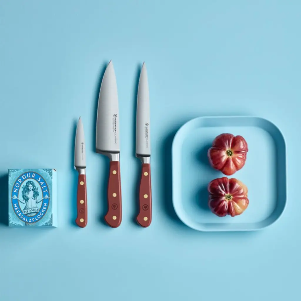The perfect partner to expressive cuisine, this red-handled paring knife jazzes up your kitchen with a pop of vibrant color. Part of Wusthof's Classic series known for its durability and high quality, the paring knife is an essential component of any cutlery collection. The knife excels at trimming, slicing and peeling thanks to a slim, tapered blade precision forged from a single piece of high-carbon stainless steel and finished with a long-lasting edge. A brass-riveted handle provides the full-tang knife with a comfortable handhold as well as a dash of color the shade of dried sumac berries.Produced by skilled craftspeople in the knife-producing capital of the world, Wüsthof blades have been crafted in Solingen, Germany, for over 200 years. Need help choosing? Here's your essential guide to choosing the best knifeView all Wüsthof Cutlery