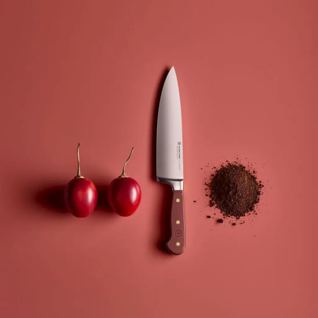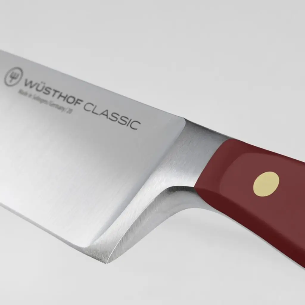 The perfect partner to expressive cuisine, this red-handled chef's knife jazzes up your kitchen with a pop of vibrant color. Part of Wusthof's Classic knife series known for its durability and high quality, the large knife is an essential component of any cutlery collection. The versatile knife excels at a wide range of cutting tasks thanks to a long, razor-sharp blade that's forged from a single piece of high-carbon stainless steel and finished with a long-lasting edge. A brass-riveted handle provides the full-tang knife with a comfortable handhold as well as a dash of color the shade of dried sumac berries.Produced by skilled craftspeople in the knife-producing capital of the world, Wüsthof blades have been crafted in Solingen, Germany, for over 200 years. Need help choosing? Here's your essential guide to choosing the best knifeView all Wüsthof Cutlery