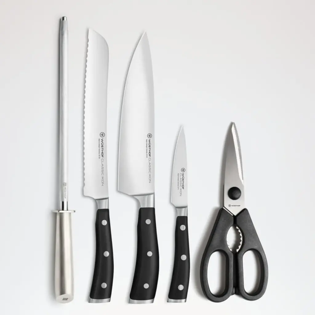 The Classic Ikon series builds on the Wüsthof fine cutlery tradition with thinner blades, refined ergonomic handles, and recessed bolsters that allow full sharpening to the heel. Precision forged knives feature tempered and hardened high-carbon steel blades with a long-lasting V-ground edge that's easy to sharpen. Perfectly balanced, triple-riveted synthetic handles are more sanitary than wood. The 15-slot acacia knife block holds 3 ½" paring, 8" chef's, and 8" bread knives, as well as 9" honing steel and come-apart kitchen shears, with plenty of room left over for old favorites and new additions to your cutlery collection.Produced by skilled craftspeople in the knife-producing capital of the world, Wüsthof blades have been crafted in Solingen, Germany, for over 200 years. Need help choosing? Here's your essential guide to choosing the best knifeView all Wusthof products