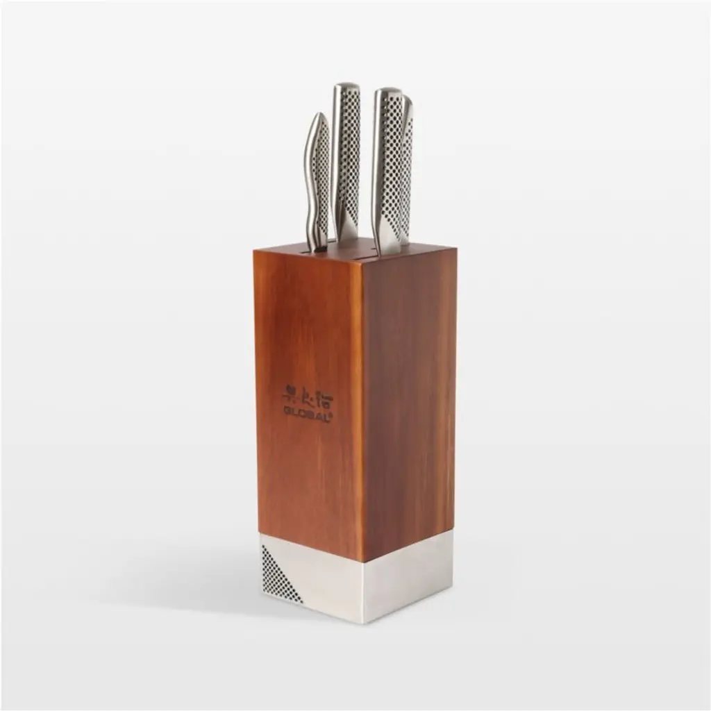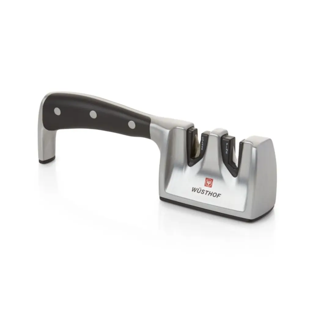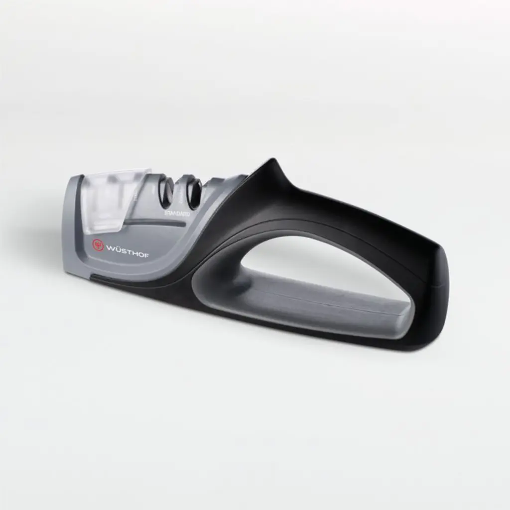 This stylishly designed, hand-held knife sharpener offers two stages of sharpening to keep your knives in tip-top shape. The diamond abrasives option sharpens, and while the other slot hones to maintain the edge.