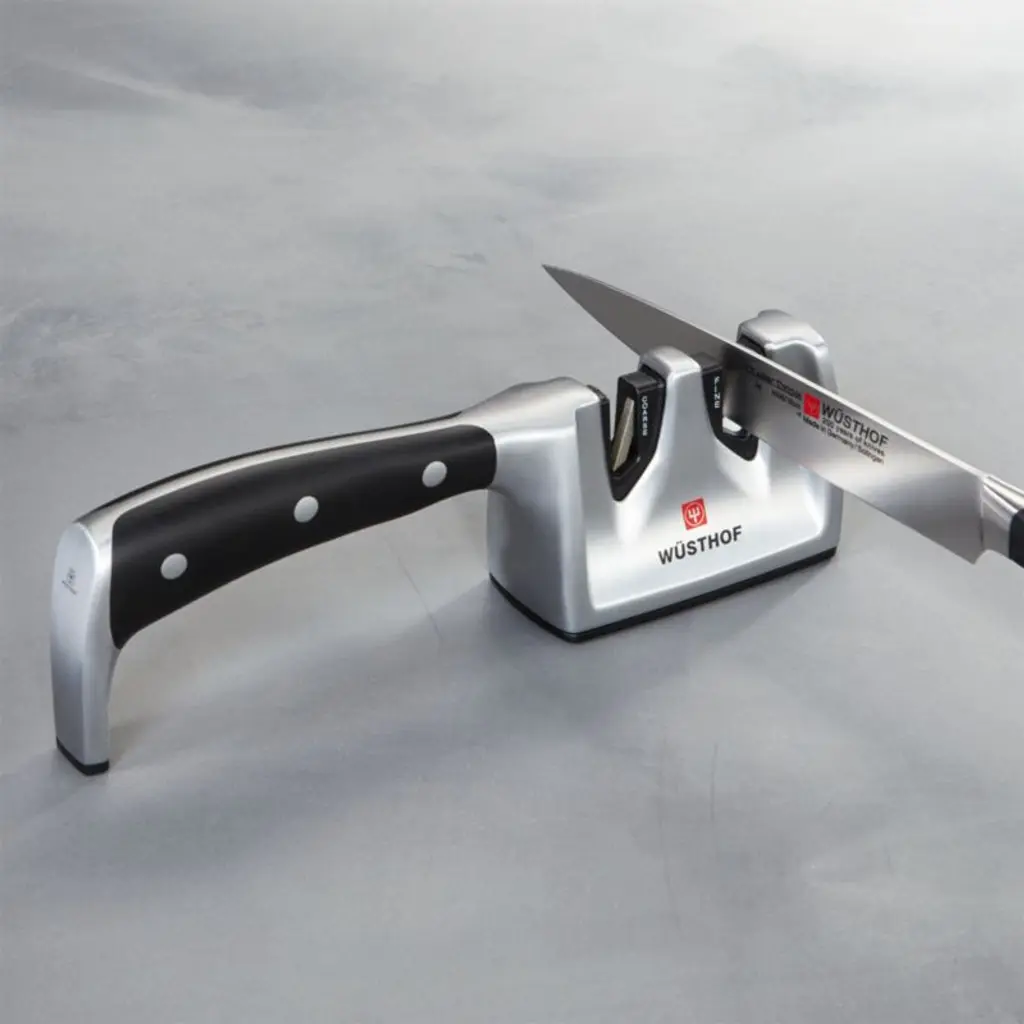 This stylishly designed, hand-held knife sharpener offers two stages of sharpening to keep your knives in tip-top shape. The diamond abrasives option sharpens, and while the other slot hones to maintain the edge.
