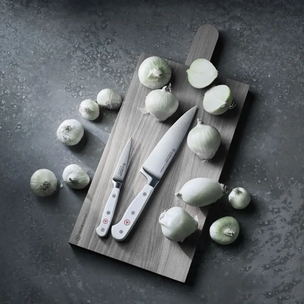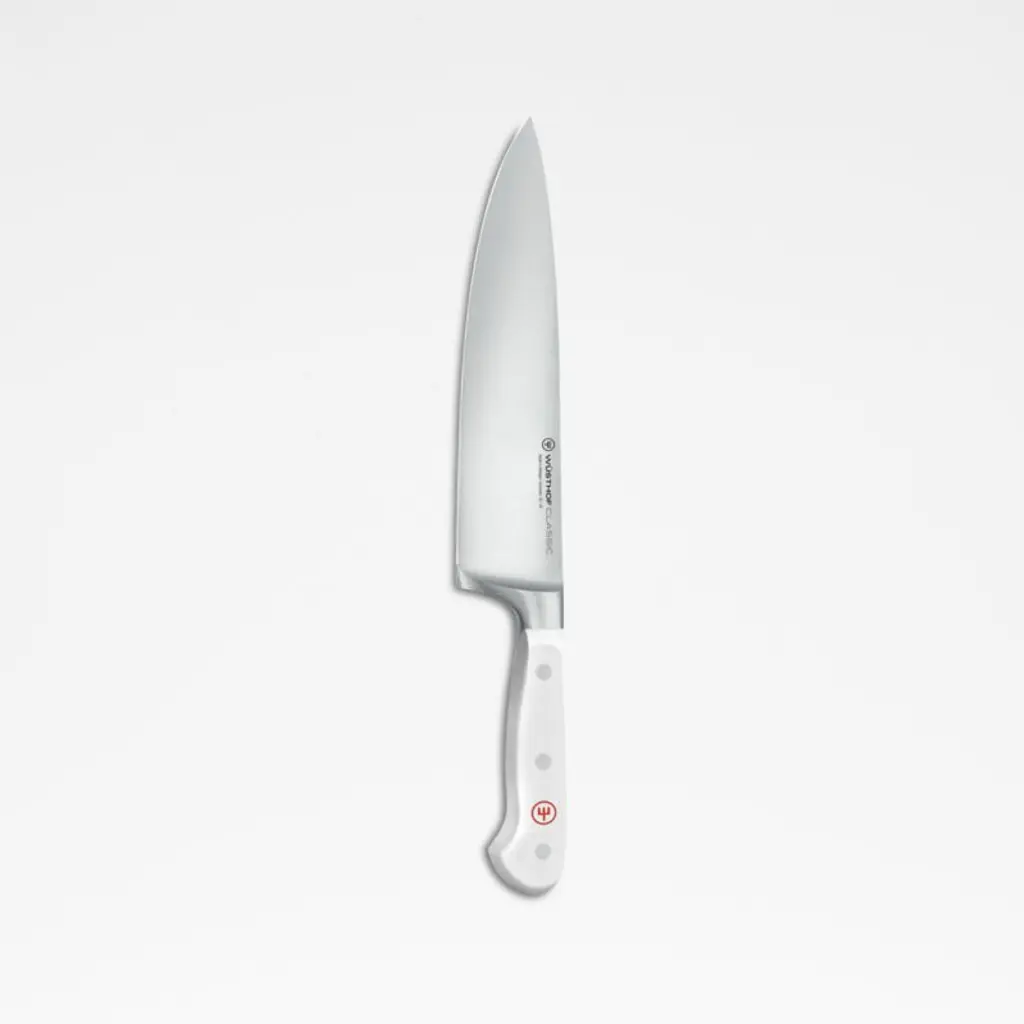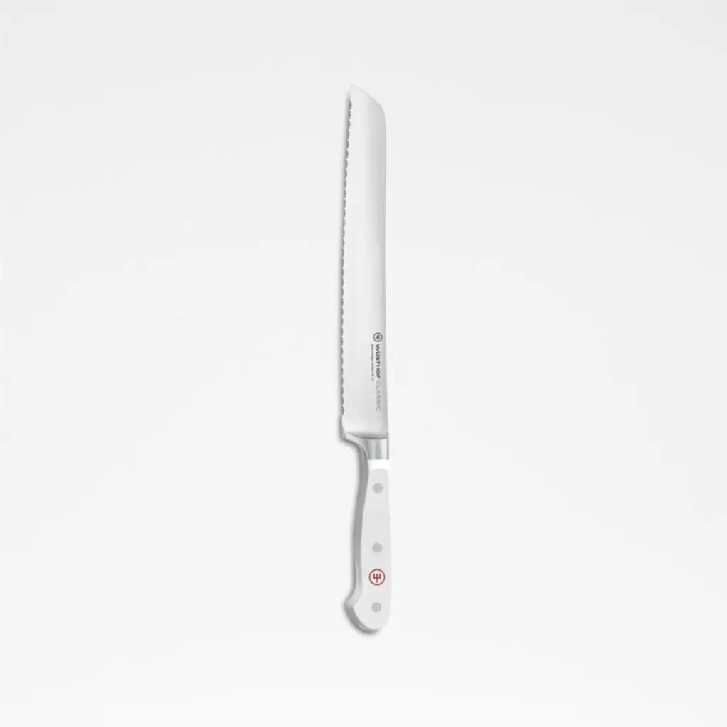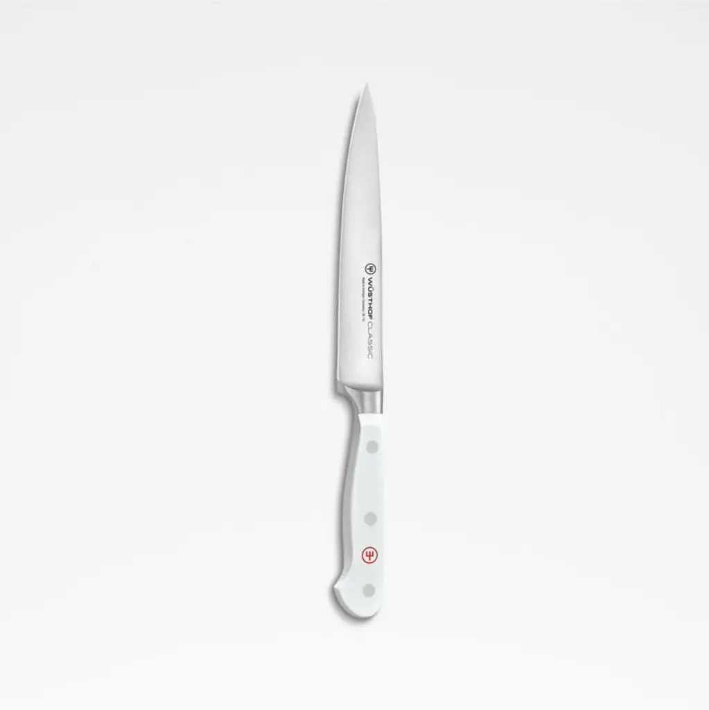 Designed in 1886, the Wüsthof's Classic series epitomizes quality and durability. Precision-forged knives feature hardened high-carbon steel blades with laser-controlled edges that are easy to sharpen. Ergonomic, triple-riveted white synthetic handlesmore sanitary than woodprovide a comfortable grip and precise control. The gorgeously grained acacia wood block has a great countertop presence, with extra slots for new additions. An excellent housewarming, graduation or wedding gift, this seven-piece set includes a 3.5-inch paring knife, 6-inch utility knife, 8-inch chef knife, 9-inch double serrated bread knife, 8.5-inch stainless steel kitchen shears and 9-inch brushed stainless steel honing steel in a knife block.Produced by skilled craftspeople in the knife-producing capital of the world, Wüsthof blades have been crafted in Solingen, Germany, for over 200 years. Need help choosing? Here's your essential guide to choosing the best knifeView all Wüsthof Cutlery