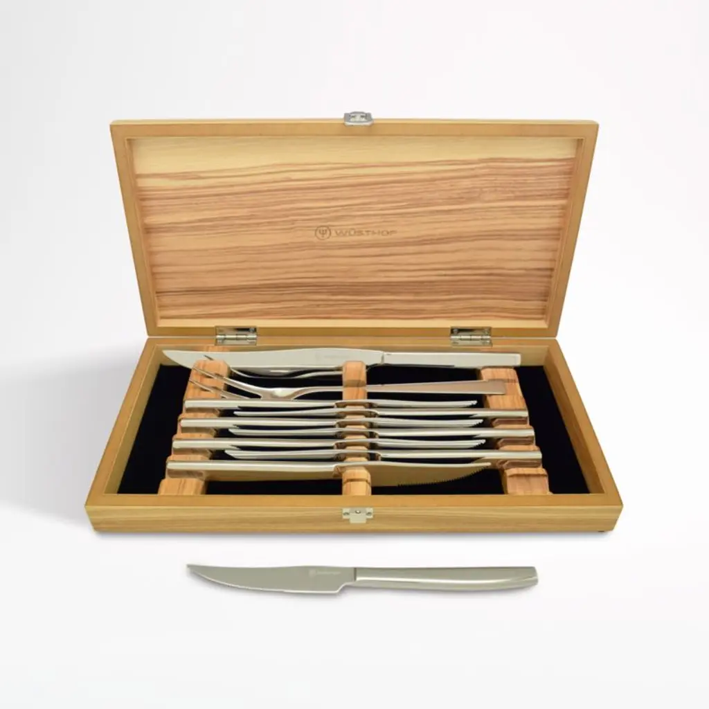 Nested in a beautiful olivewood presentation chest, this steak set from the masters at Wusthof pairs eight sleek stainless steel steak knives with coordinating carving knife and fork. The elegant contemporary design is a tabletop asset, making this 10-piece set a stunning housewarming, wedding or graduation gift. Need help choosing? Here's your essential guide to choosing the best knife