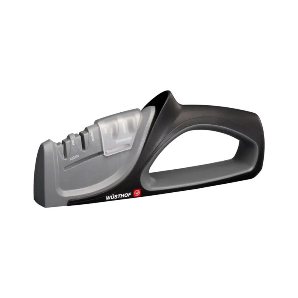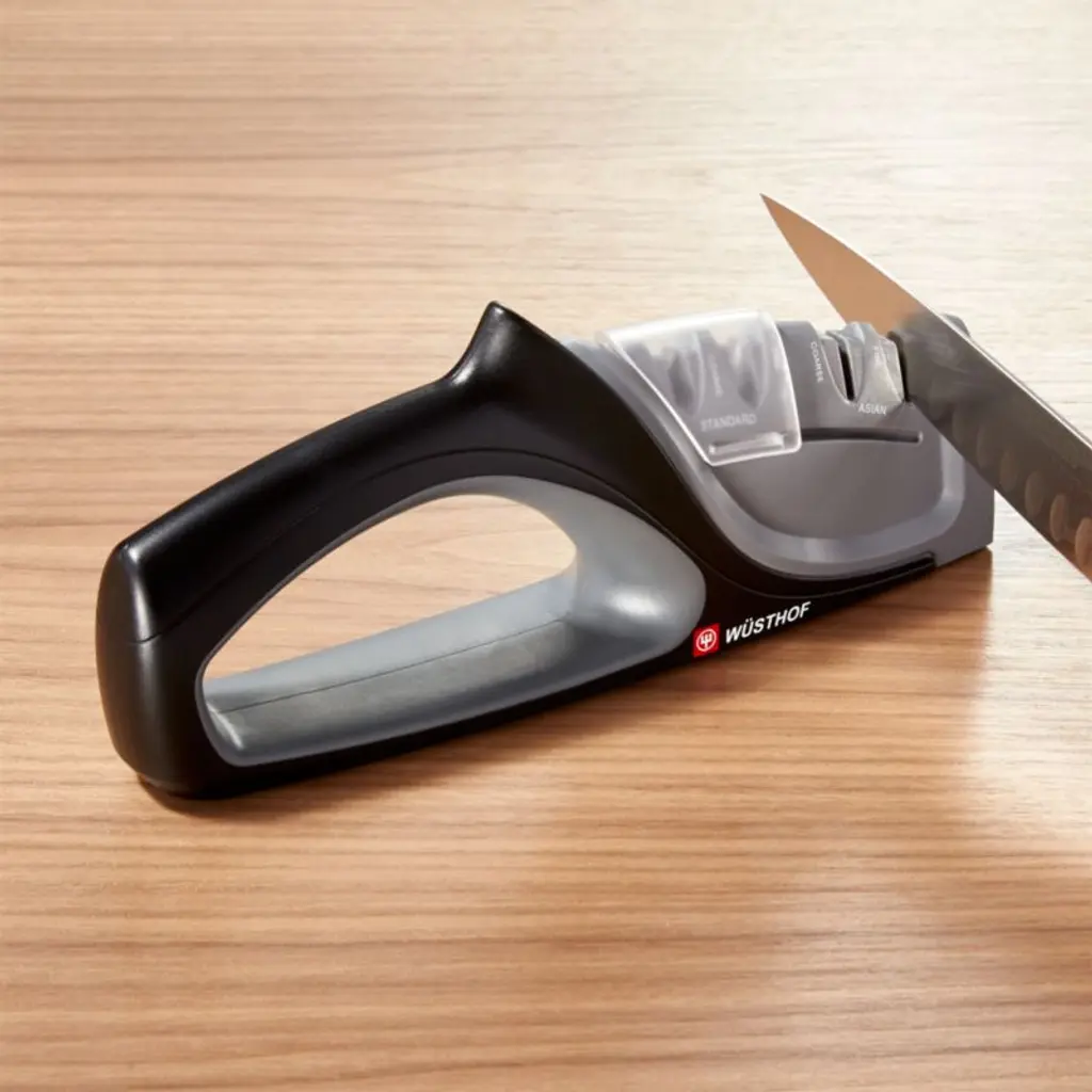 Precision sharpening for European-style Wüsthof knives hones both fine angled and serrated blades. The easy-to-operate has four distinct stages to hone and sharpen both Standard and Asian blades. The course stage quickly sharpens and sets the angle, while the fine stage works to finish and polish the edge. Use the Standard side to sharpen blades at a 14- degree angle and the Asian side to sharpen at a 10-degree angle.
