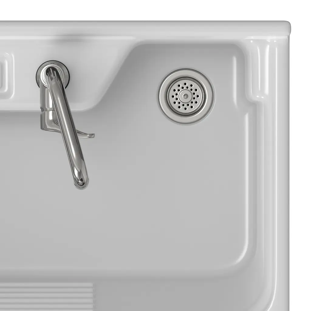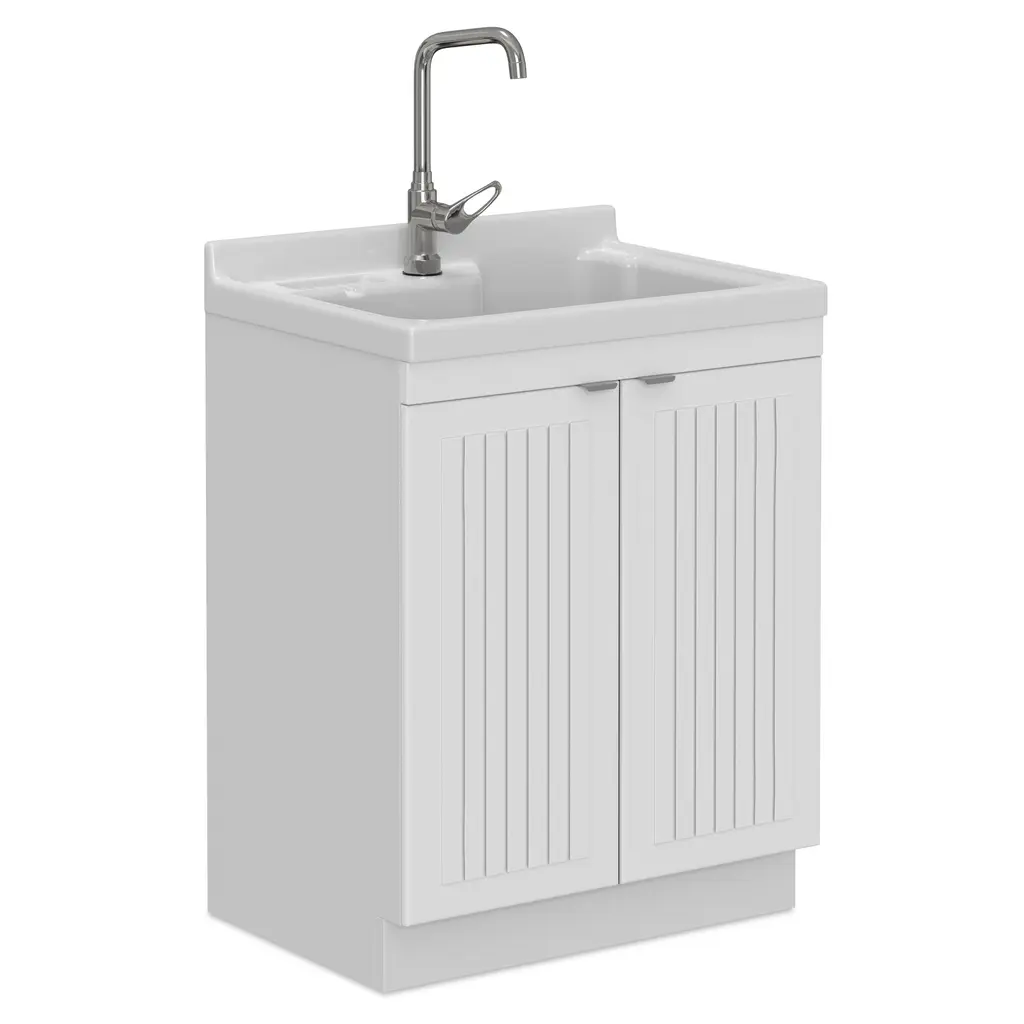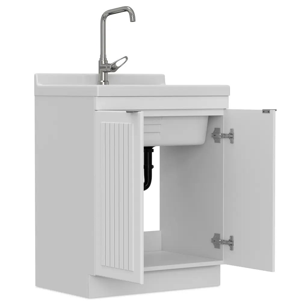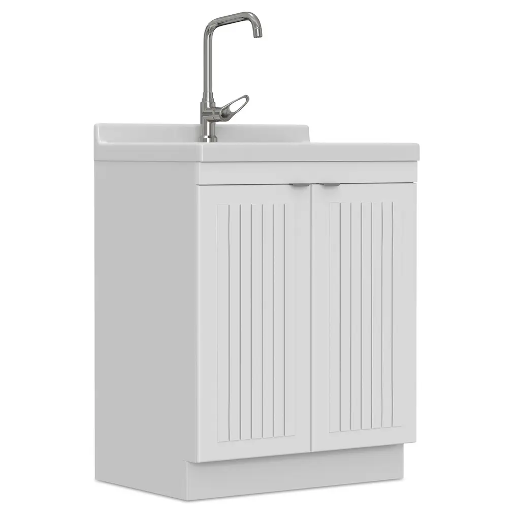 Simple clean lines define the Bishop Laundry Cabinet. With paneled doors, high arc faucet and sleek door pulls, the Bishop Laundry Cabinet brings both functionality and stylish design to your laundry room.