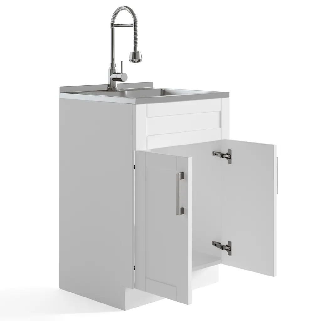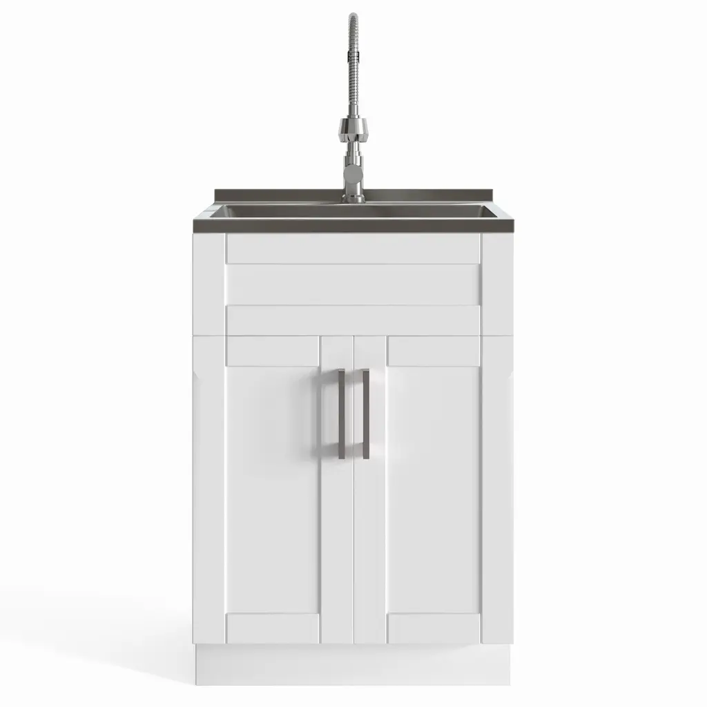 The WyndenHall Hartland Utility Sink & Cabinet is a compact powerhouse designed for small spaces with big cleaning needs. This versatile laundry room essential combines style and functionality, featuring a deep sink with a protective backsplash and a high-arch chrome faucet for tackling everything from pre-treating stains to bathing small pets. The shaker-style doors with brushed nickel handles offer a timeless aesthetic, while the spacious interior provides ample storage for detergents, cleaning supplies, and more. Crafted with water-resistant melamine and PVC-wrapped doors, this durable cabinet stands up to the demands of busy households, making it the perfect addition to laundry rooms, mudrooms, or garages where space is at a premium but style and practicality are non-negotiable Features: