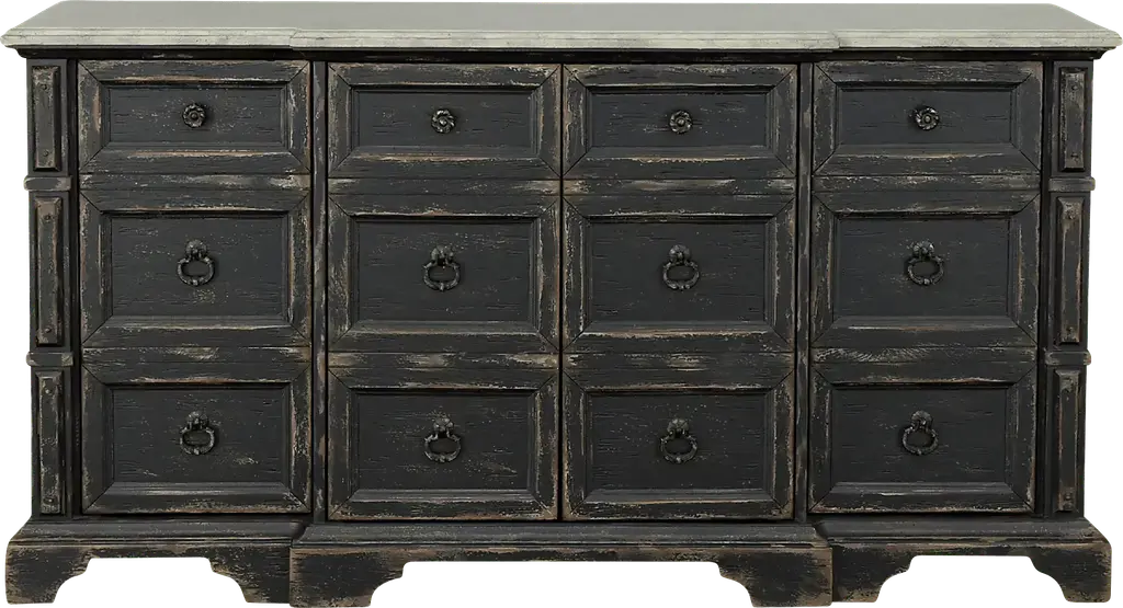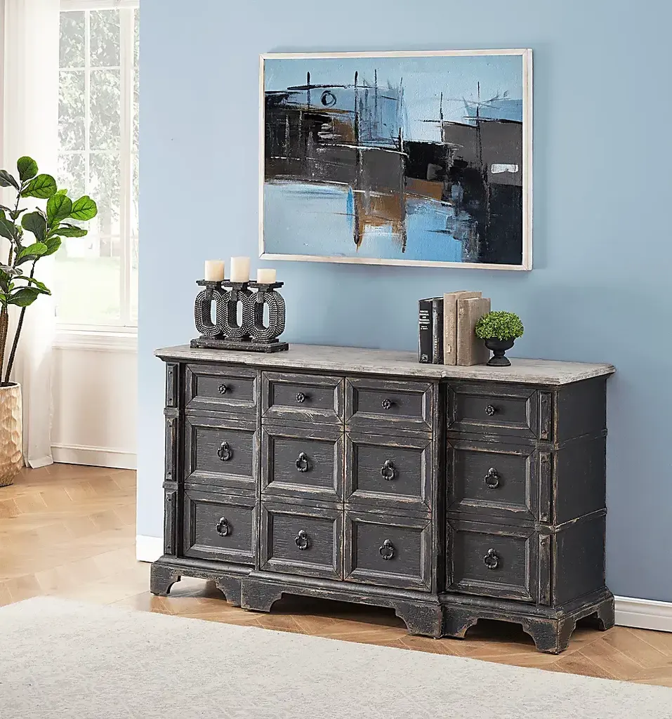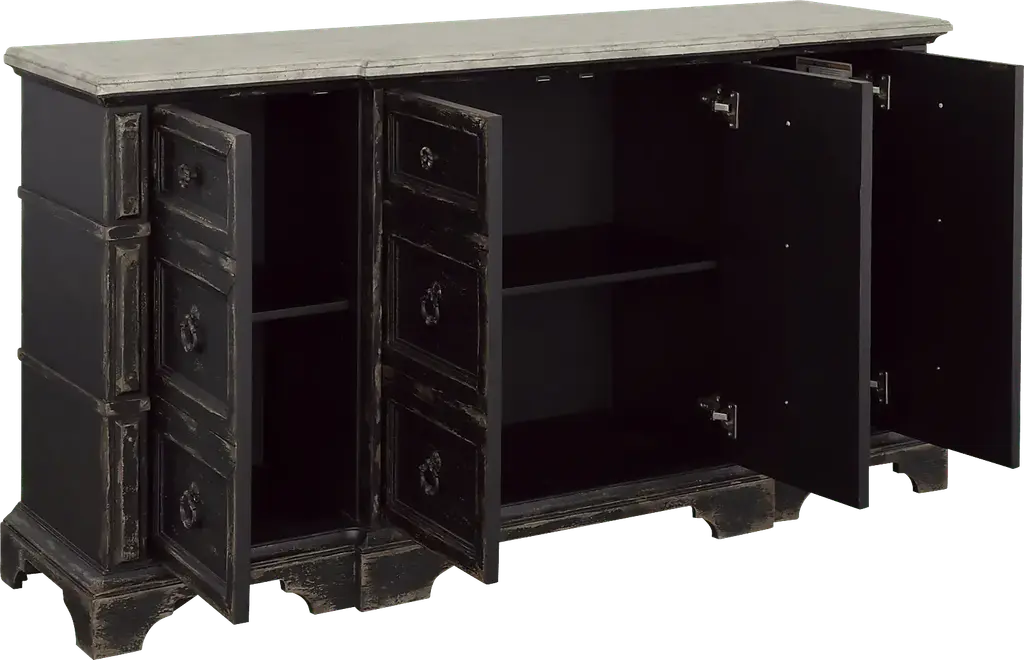 Bring the charm of antiquity into your living room with this attractive Wynmoore four door credenza. The black finish boasts a smoky top contrasted by dark weathered door fronts. The classic breakfront design is enhanced with twelve antique style pulls which create the illusion of many drawers. Behind the four doors, you will find adjustable shelves that provide the storage flexibility that you've always wanted. Without a doubt, this credenza will be the perfect addition to your home. Customer assembly is required.