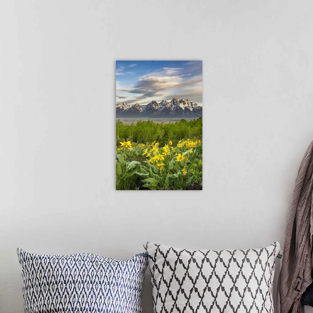 USA, Wyoming. Landscape of Grand Teton, Arrowleaf Balsamroot wildflowers and aspen trees, Grand Teton National Park.