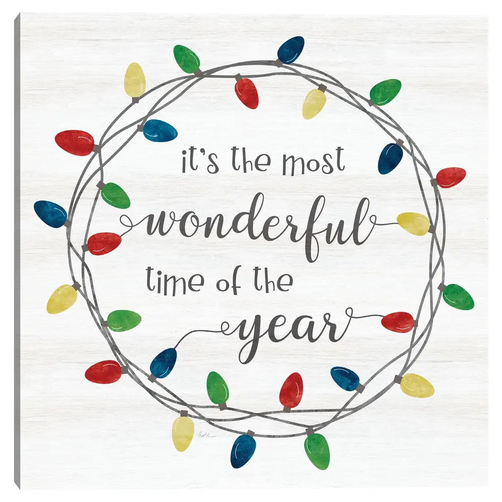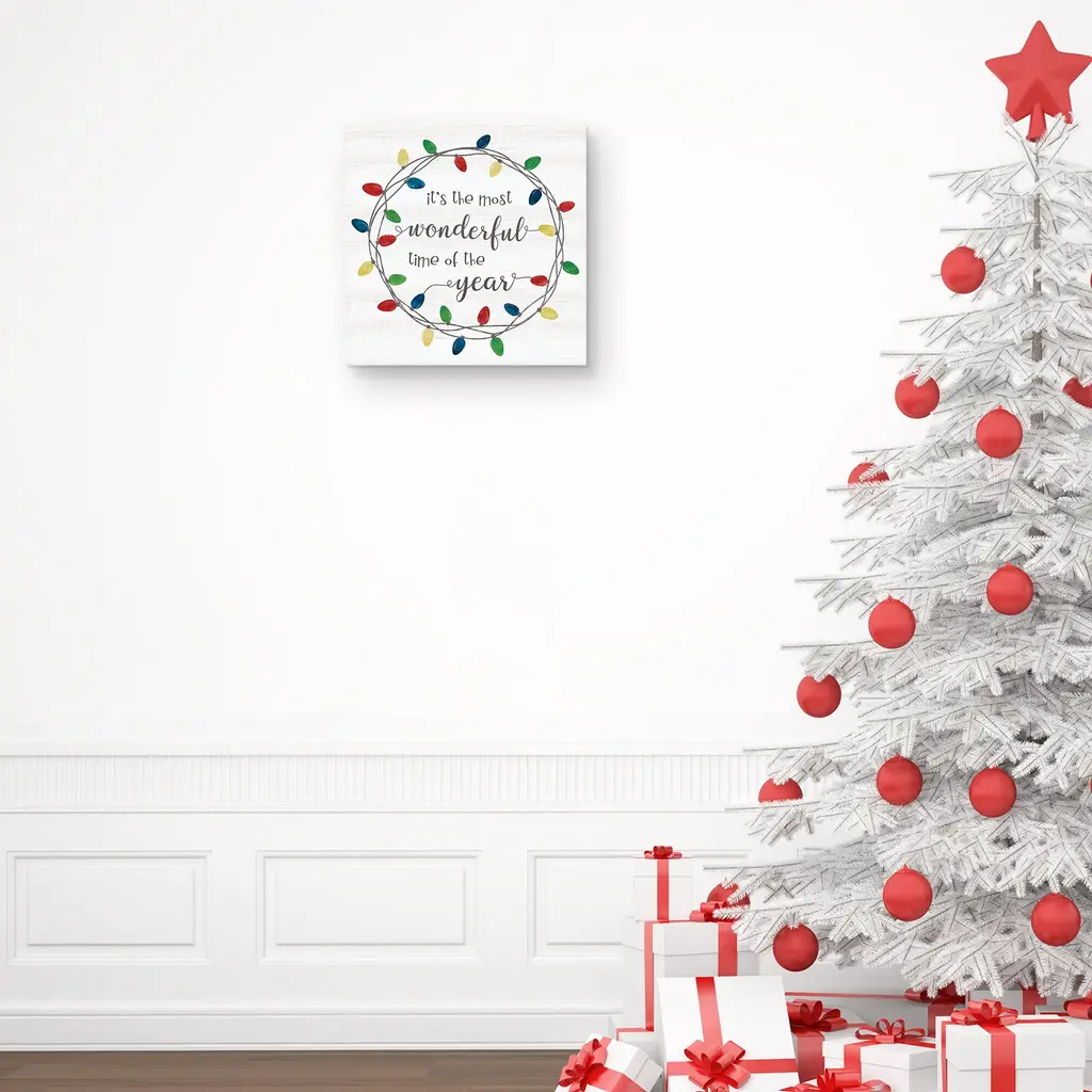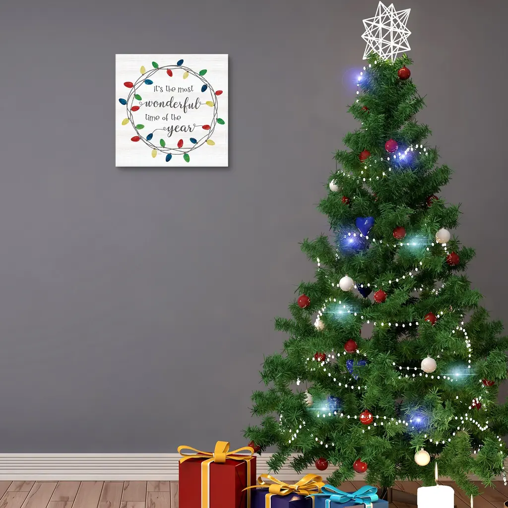 Surrounded by holiday lights of yellow, blue, gree, and red, we want to spread the word, that It's the Most Wonderful Time of The Year! Printed on canvas on a white background, Christmas Light Wreath will illuminate your holidays!
