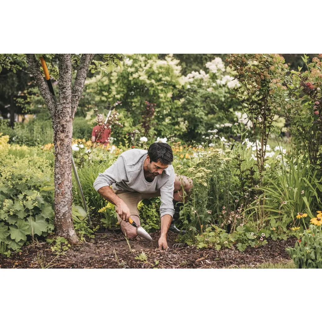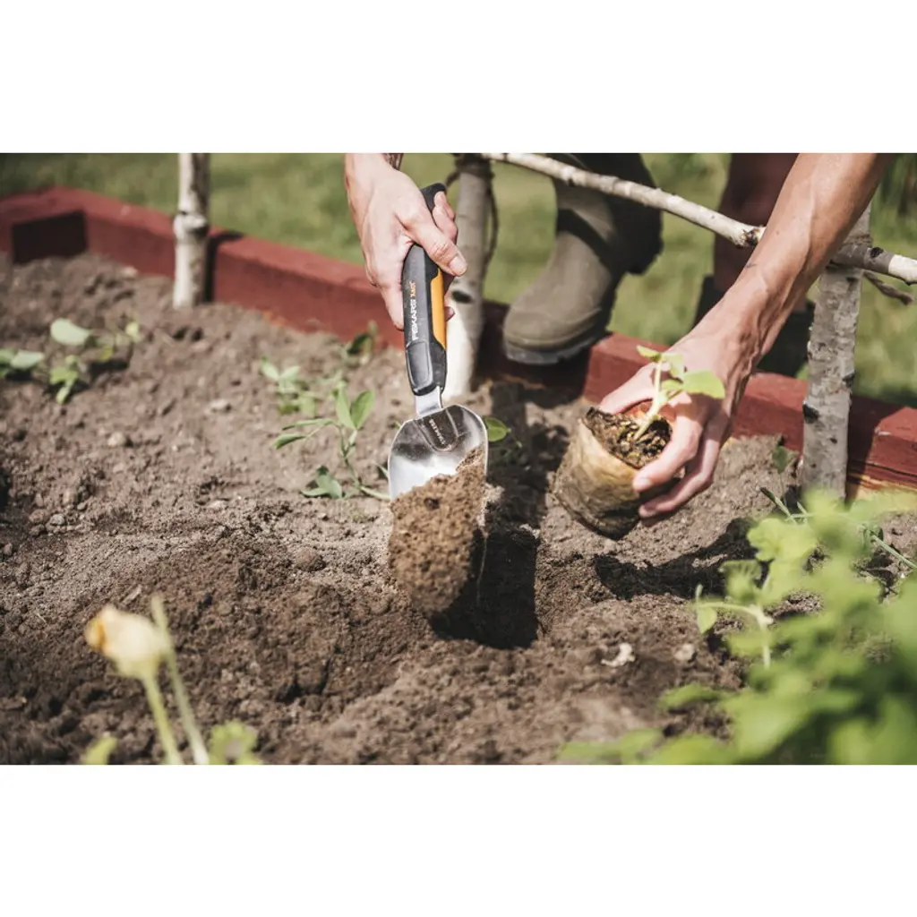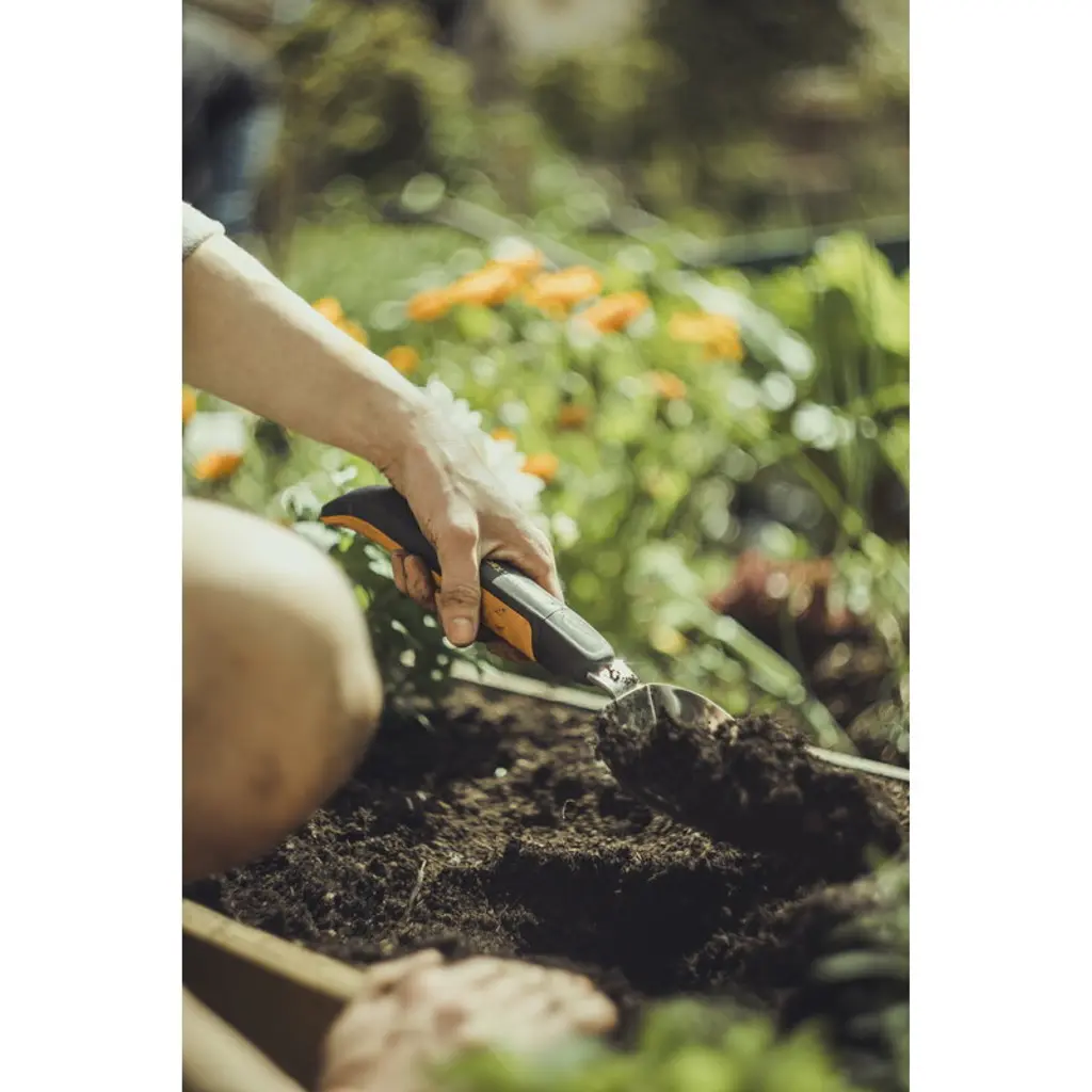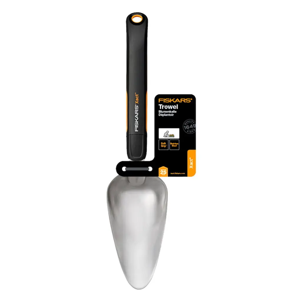 Fiskars' Xact trowel is suitable for digging, planting and turning up the soil. The trowel is equipped with a seven-pronged blade and a SoftGrip handle that allows various handle positions – each firm yet comfortable. The handle is shaped longer than usual so that it provides extra leverage when needed. The Xact trowel has been awarded the 2019 Red Dot Design Award.