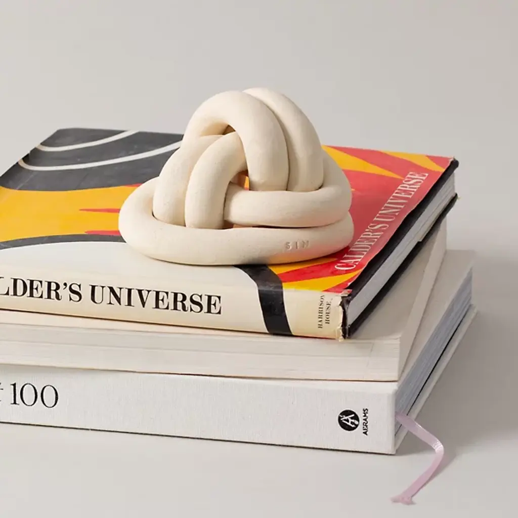 The XL Fist Knot was crafted and designed in Brooklyn, New York by SIN. Skillfully made by artisans using a thick, chunky strand of stoneware results in an extra-large decorative knot that commands attention. It serves as a captivating focal point, drawing in the eye with impressive size and distinctive design.