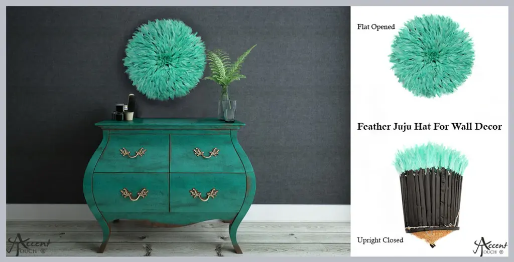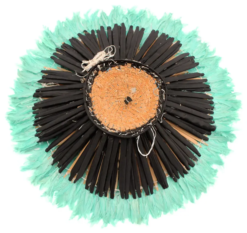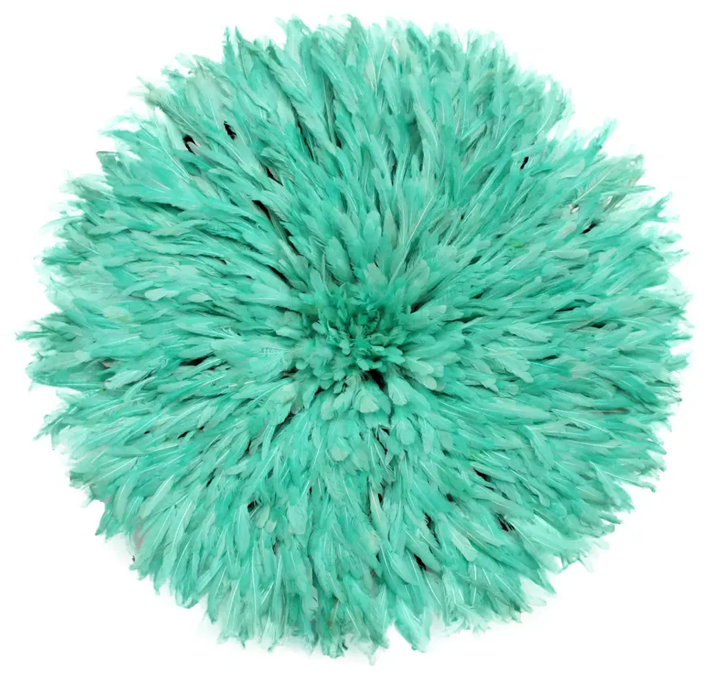 Origin: CameroonDimension: 20-22 inches/51-56 cm diameter.Profile dimension from wall surface (when open and suspend): approx. 4 inches (10 cm).Colors may differ slightly from photos due to different monitor settings. Also, the color may vary from one product to another due to the dye on feathers.Materials: Raffia wood, Hens feathers, fabric, plastic string, dyes for color.Imported. All Juju Hats have been fumigated before importation.Maintenance: Juju Hats need some love too. To maintain a beautiful Juju a little maintenance is necessary. Spray the feathers every 3 to 4 months with an anti-moth to prevent from any damages caused by insects. To remove the dust on the Juju, use a hair blow dryer on low temperature. Keep blow dryer at least 12 inches (or 30 cm) away from the feathers. If needed rearrange the feathers with your fingers.This artful Juju Hat, the Tyn Hat was handcrafted in Cameroon. For centuries, Bamiléké tribes have been making those hats that symbolize prosperity and freedom. Once, Juju Hats were worn by medicine men and royalties during tribal ceremonies. Nowadays, their customs are less restricted during Bamiléké traditional rituals and their beauty has reached homes beyond Cameroon"™s borders. Those headdresses are very impressive hung on walls. Juju hats are made from natural or dyed feathers and woven raffia. Artisans take 2 to 3 days to complete one hat.