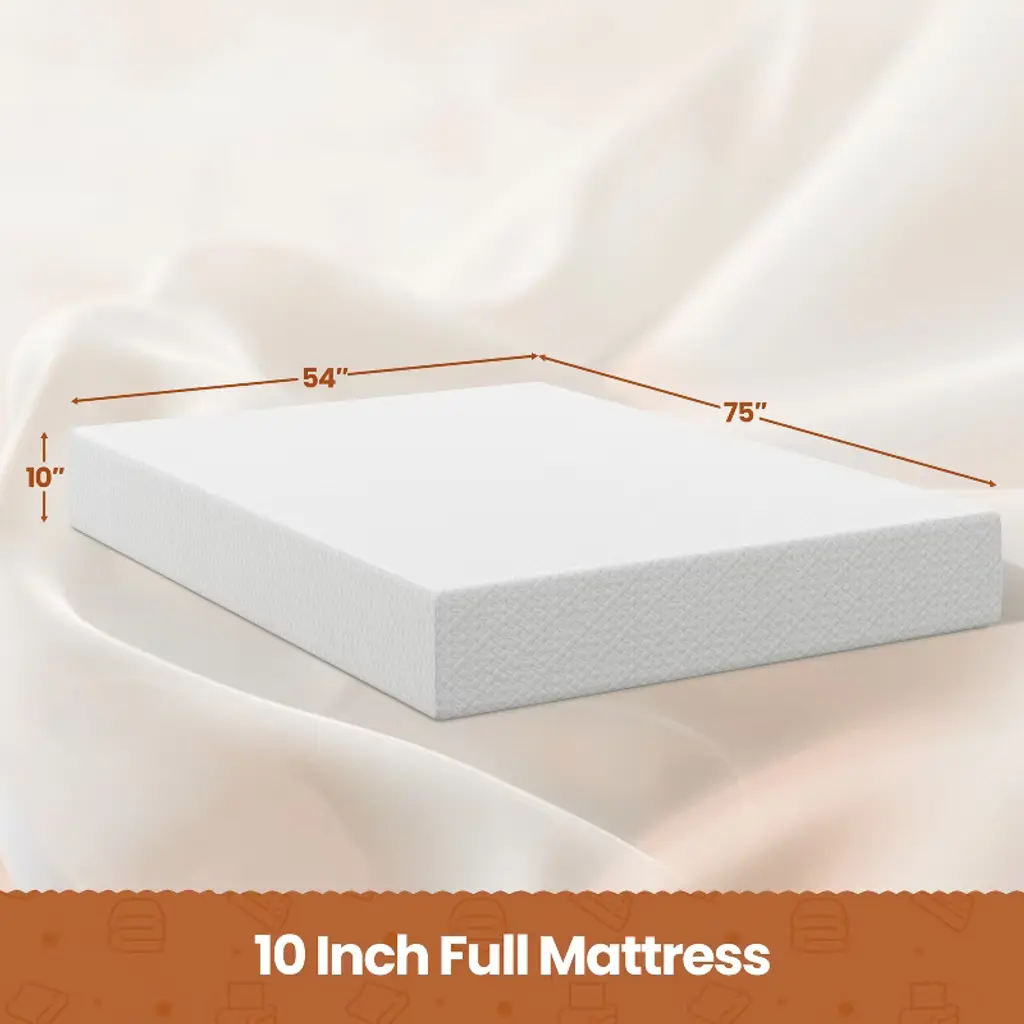 Discover comfort with this 10-inch Gel Memory Foam Mattress. The soft memory foam molds to your body, easing pressure points, while gel in the top layers helps dissipate heat for a cooler rest. A transition foam layer and a green tea-infused base foam provide additional support and a soothing scent. The mattress features a non-slip bottom and a removable zippered cover for easy cleaning. Compatible with most bed frames, it offers a medium-firm feel suited to a wide range of sleepers. Certified to OEKO-TEX STANDARD 100 and CertiPUR-US standards, this mattress arrives ready to deliver peaceful nights. * Specifications: Materials: Polyester fabric, foam, memory foamColor: WhiteTwin Size: Assembled Dimensions: 39" W × 75" L × 8" H Full Size: Assembled Dimensions: 54" W × 75" L × 10" H Queen Size: Assembled Dimensions: 60" W × 80" L × 10" H Please see the image for exact measurements.Please allow a 0.6" measurement tolerance and 5% weight measurement tolerance.