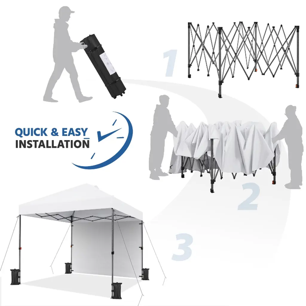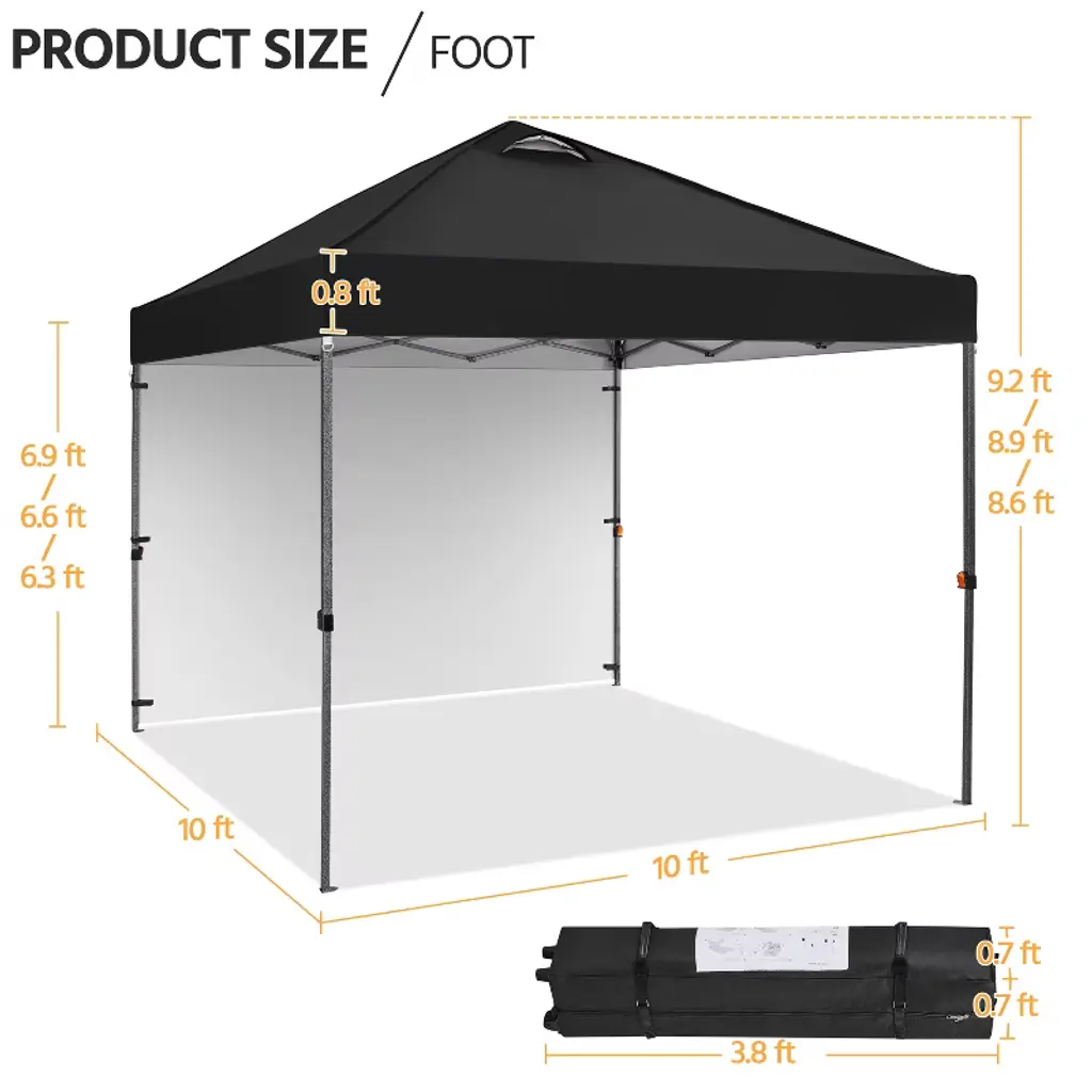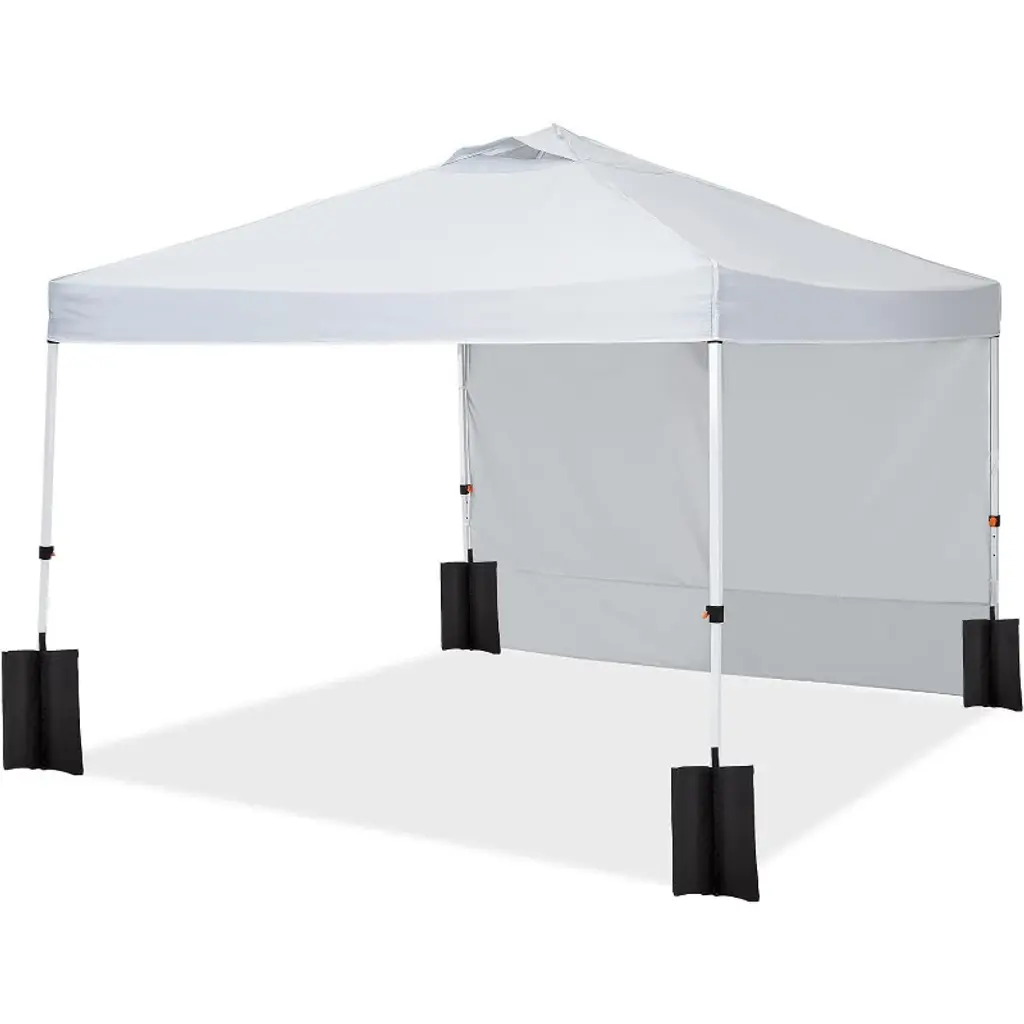 Upgrade your outdoor gatherings with this 10×10 ft Pop-Up Canopy! With adjustable heights, weather-resistant materials, and compact storage size, this canopy is designed for convenience and comfort. The included sidewall provides extra sunshade and wind block, ensuring a more inviting outdoor space. Whether you're attending a craft fair, vendor event, farmers market, outdoor party, or camping trip, this canopy has you covered. For added convenience, the canopy with 1 sidewall comes with a practical roller bag, 4 guy lines, 4 sandbags, and 8 metal ground anchors, providing a hassle-free setup and experience. * Specifications: Canopy Color: White, Black, Navy BlueMaterials: Powder-coated Steel, Polyester FabricAssembled Dimensions: 10' L × 10' W × 8.6-9.2' HAdjustable Canopy Height: 8.6', 8.9', 9.2'Roller Bag: 0.7' L × 0.7' W × 3.8' H Please see the image for exact measurements.Please allow measuring deviation due to manual measurement.Do not use this canopy in strong breeze, continuous light rain, heavy rain, or any other extreme weather scenarios.Please anchor the canopy to the ground when in use.Two or more adults are needed to set up/take down this canopy tent.