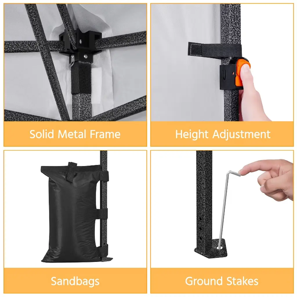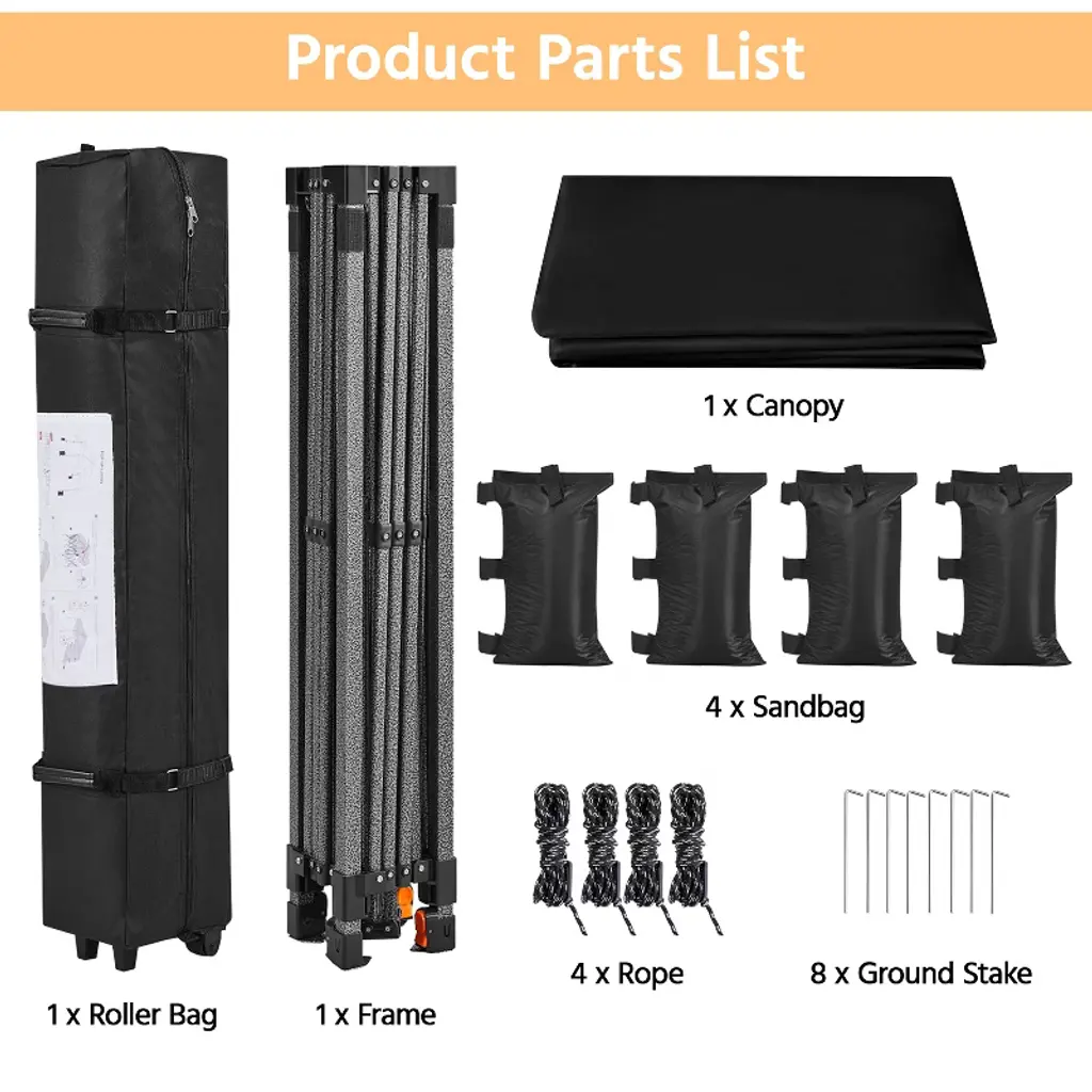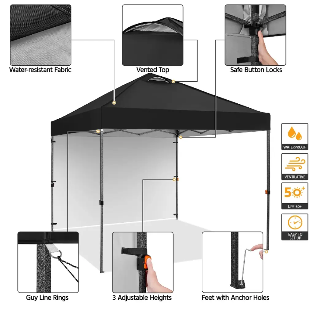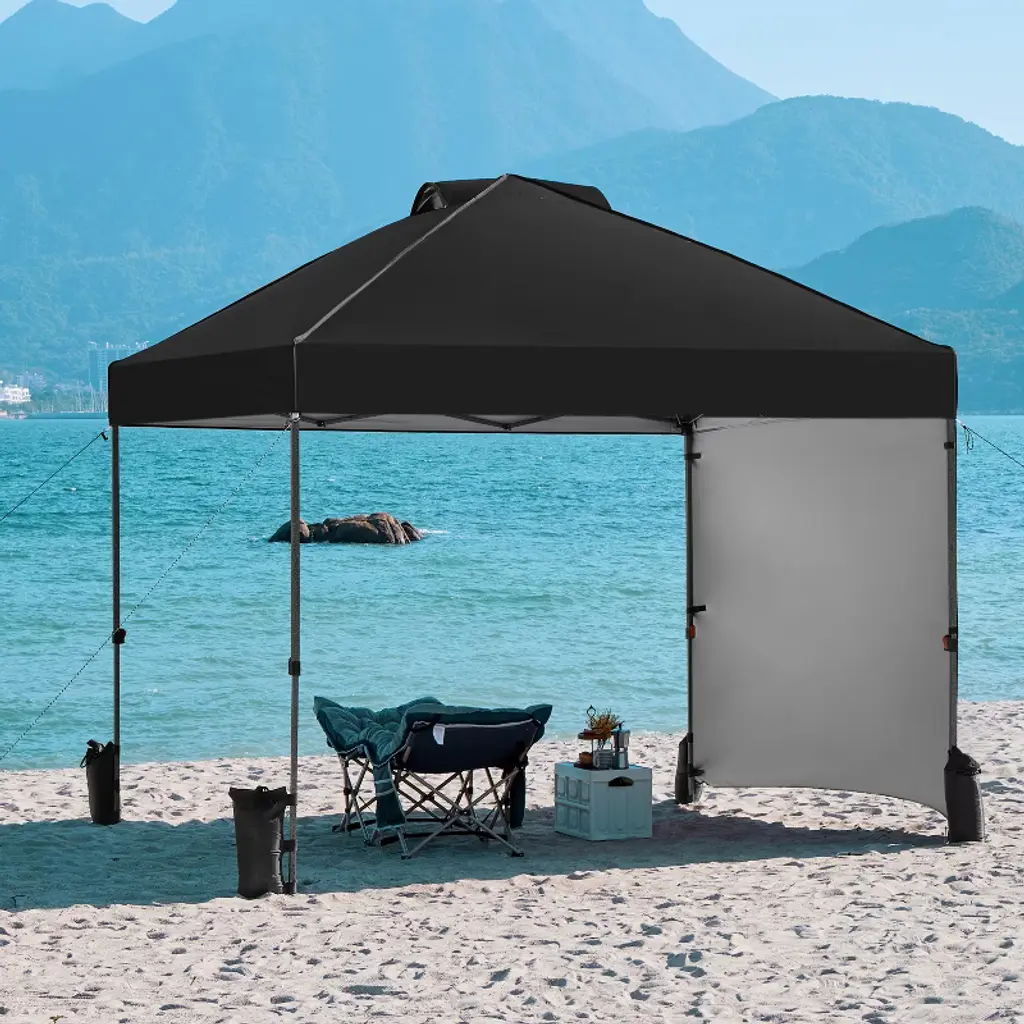 Upgrade your outdoor gatherings with this 10×10 ft Pop-Up Canopy! With adjustable heights, weather-resistant materials, and compact storage size, this canopy is designed for convenience and comfort. The included sidewall provides extra sunshade and wind block, ensuring a more inviting outdoor space. Whether you're attending a craft fair, vendor event, farmers market, outdoor party, or camping trip, this canopy has you covered. For added convenience, the canopy with 1 sidewall comes with a practical roller bag, 4 guy lines, 4 sandbags, and 8 metal ground anchors, providing a hassle-free setup and experience. * Specifications: Canopy Color: White, Black, Navy BlueMaterials: Powder-coated Steel, Polyester FabricAssembled Dimensions: 10' L × 10' W × 8.6-9.2' HAdjustable Canopy Height: 8.6', 8.9', 9.2'Roller Bag: 0.7' L × 0.7' W × 3.8' H Please see the image for exact measurements.Please allow measuring deviation due to manual measurement.Do not use this canopy in strong breeze, continuous light rain, heavy rain, or any other extreme weather scenarios.Please anchor the canopy to the ground when in use.Two or more adults are needed to set up/take down this canopy tent.