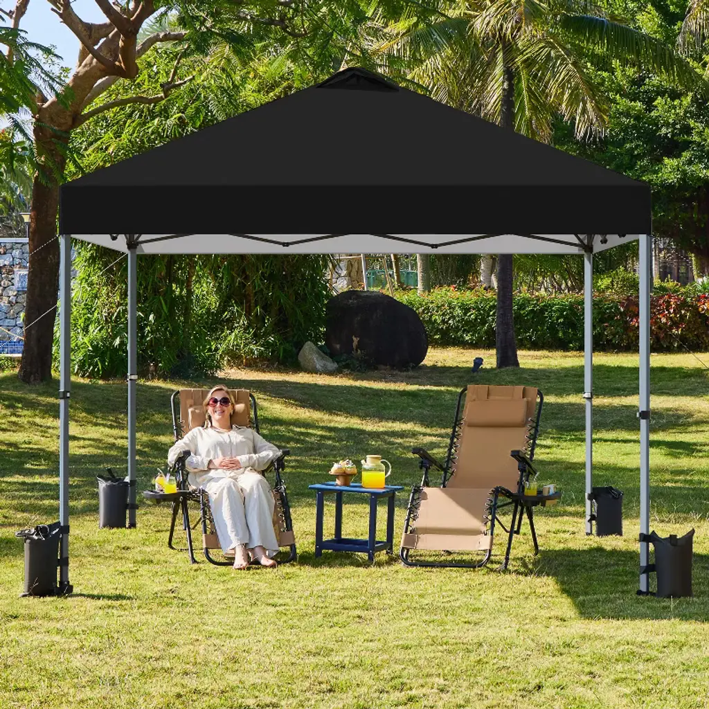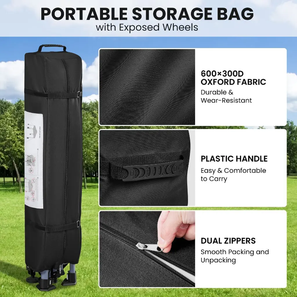 This 10ft × 10ft pop-up canopy tent is designed for ultimate outdoor comfort. Constructed with durable polyester fabric featuring a UPF 50+ UV protective coating and a sturdy powder-coated steel frame, it offers reliable protection from the elements. The one-push-to-lock system makes setup quick and easy, while the adjustable height from 6.2′ to 9.2′ ensures versatility for various needs. The canopy accommodates up to ten people for gatherings or relaxation. Equipped with two-wheeled legs for easy mobility, it can be moved effortlessly even when fully set up. When not in use, the tent folds compactly into a carry bag, and the wheels are exposed for dragging. Strong stability is ensured with guy lines, sandbags, and ground anchors. Ideal for outdoor adventures, parties, or poolside use. Specifications: Canopy Color: White, Blue, Black Materials: Powder-coated Steel, Polyester FabricAssembled Dimensions: 10′ L × 10′ W × 6.2-9.2′ HCarry Bag: 8" L × 8" W × 41.7" H / 0.7′ L × 0.7′ W × 3.5′ HItem Weight: 36.5 lbShipping Weight: 17.7 kg / 39.1 lb Set Includes: 1 Canopy1 Carry Bag4 Guy Lines4 Sandbags8 Ground Stakes Please see the image for exact measurements. Please allow measuring deviation due to manual measurement. For optimal performance and safety, do not use this canopy in conditions of strong breeze, continuous light rain, heavy rain, or any other extreme weather scenarios. Please anchor the canopy to the ground when in use. When disassembling the canopy tent, start by separating the hook and loop fasteners that secure the canopy fabric to the frame.