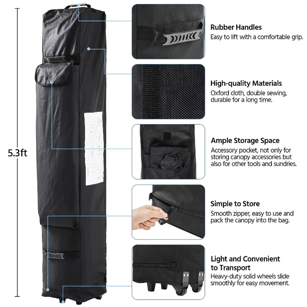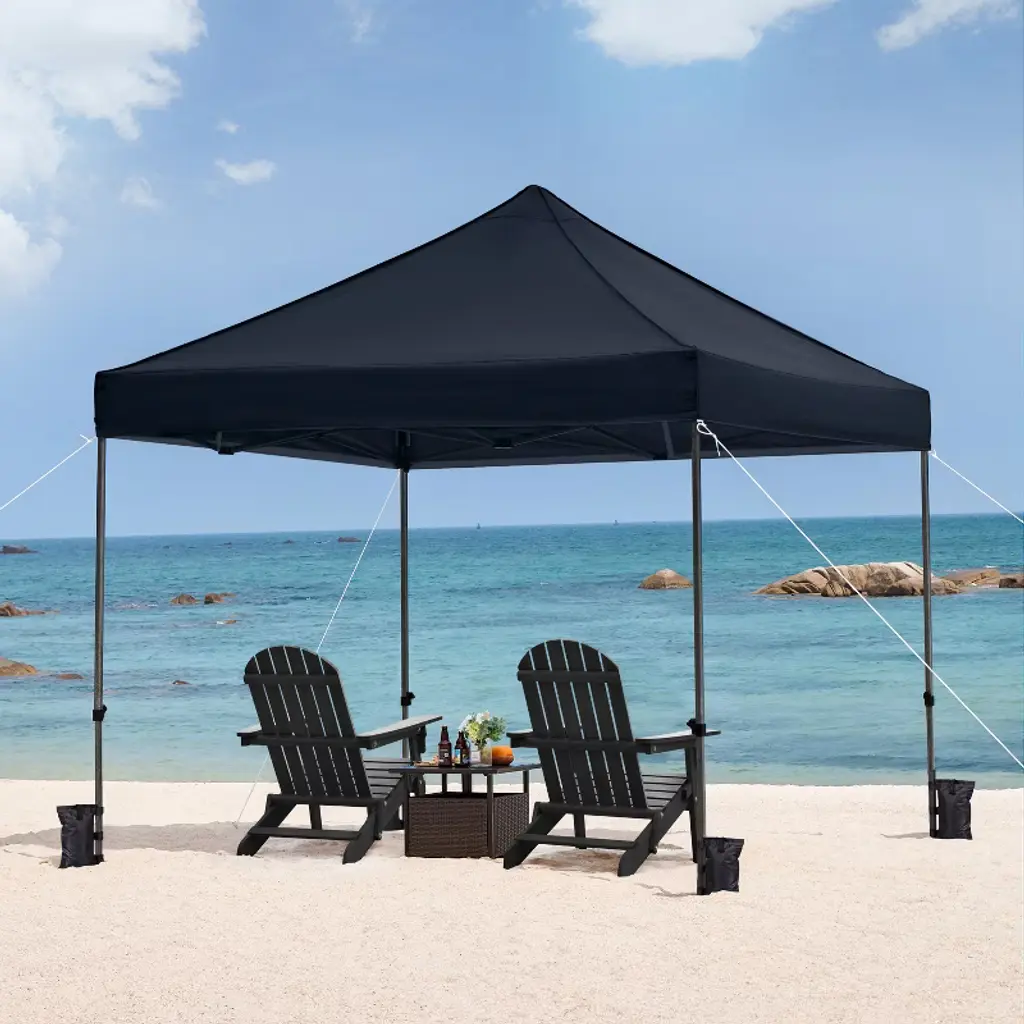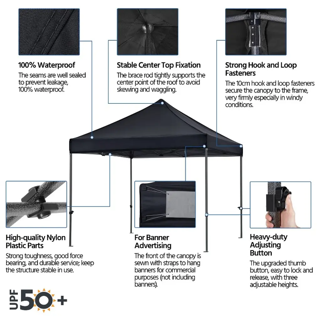This commercial heavy-duty canopy is height adjustable for different needs. The thoughtful details of the pop-up gazebo make it very convenient to set up and disassemble. Also, a wheeled carry bag is provided for easy storage and portability. The folding pop up tent is perfect for outdoor sports, festival events, flea markets, parties, etc. Specifications: Material: oxford, PU, PVC, steel, plastic, composite boardsOverall dimension: 10 x 10 x 11.2 ft (L x W x H)Height adjustment: 7.4-8 ftColor: White, Black, Blue, Green, Gray, Beige, Navy Blue, Red Note: 1. We suggest not using this canopy in strong wind.2. Please see the image for exact measurements.
