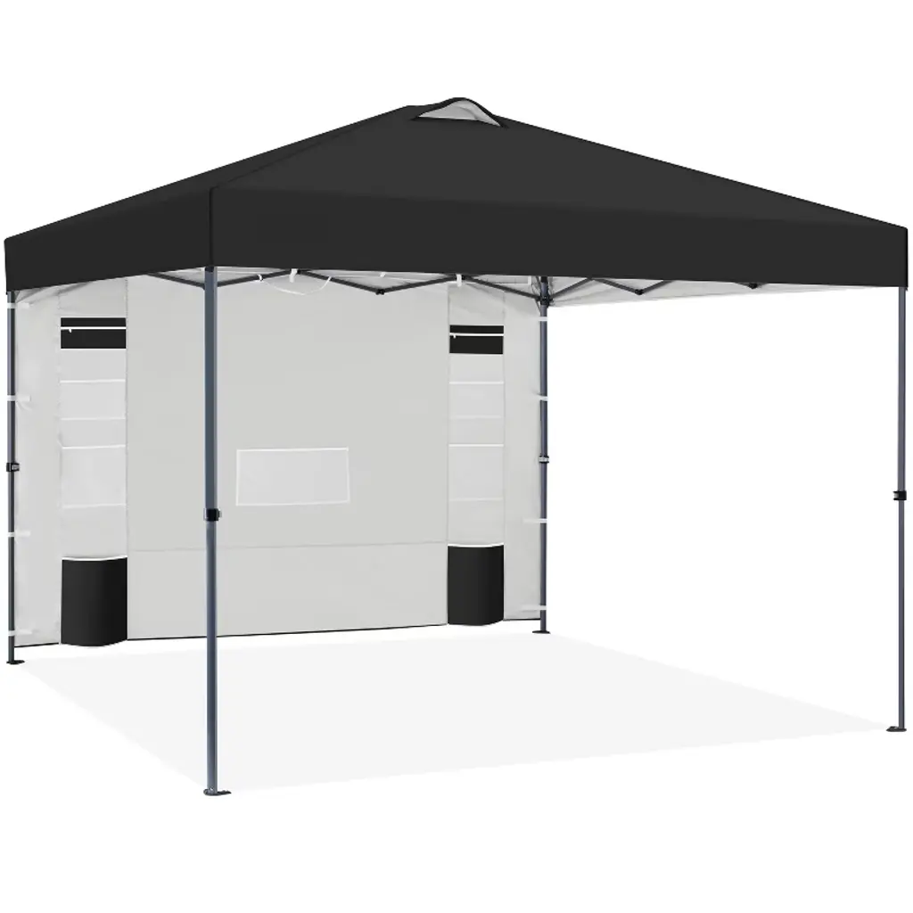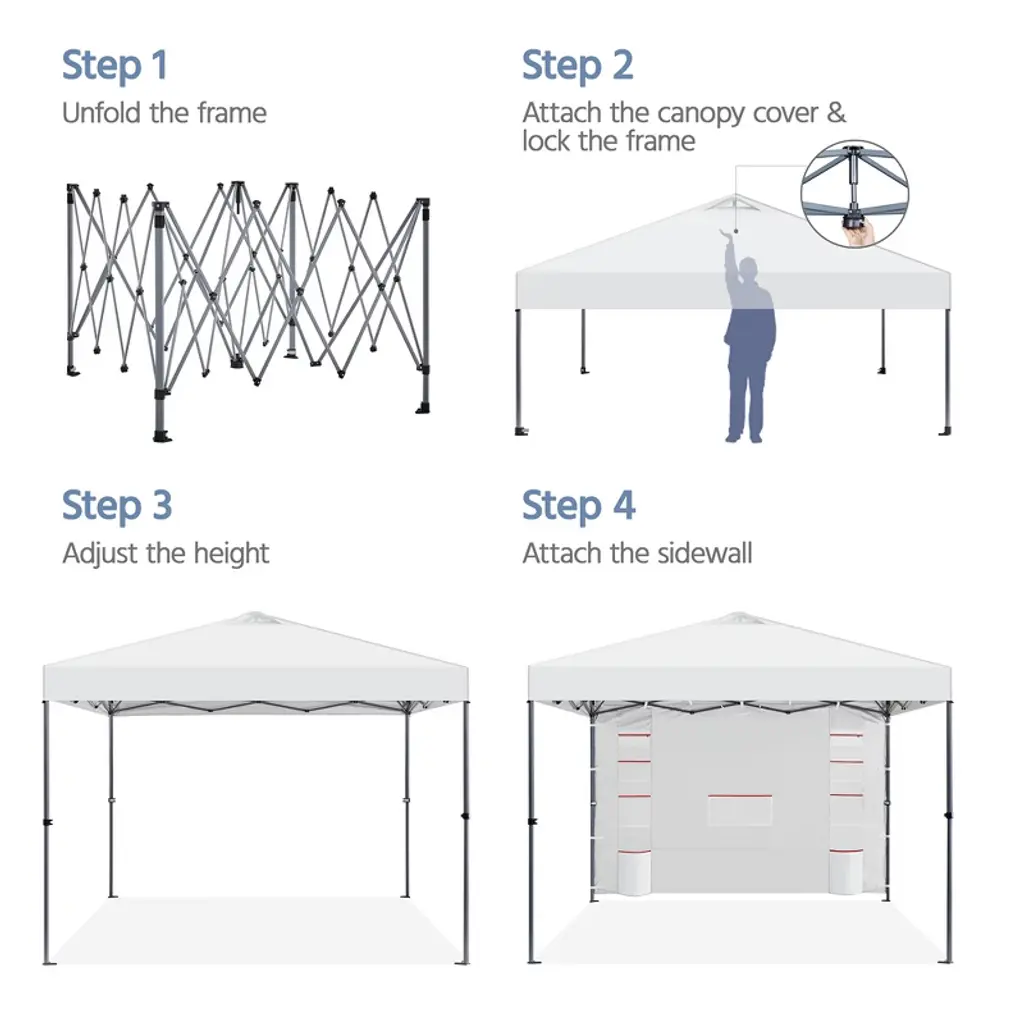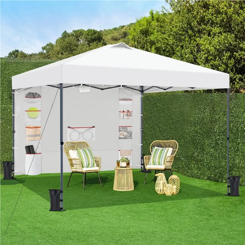 Beat the heat with this 10ft × 10ft Pop-Up Canopy! Built with rugged silver-lined Oxford fabric and a sturdy powder-coated steel frame, this instant canopy tent shields you from the scorching sunlight while ensuring durability. The one-push-to-lock mechanism simplifies the setup for you, and the freely adjustable height (5.6′ to 8.7′) lets you find your ideal fit. For added functionality, the canopy features a versatile sidewall that not only enhances wind, sun, and privacy protection but also includes nine varied-sized storage pockets and a handy hanging strap—ideal for keeping everything from small essentials to volleyballs or rackets neatly organized and within easy reach. Whether it’s a backyard hangout, beach party, or outdoor event, this canopy comfortably shades ten people. Better yet, it comes fully equipped with a roller bag, guy lines, ground anchors, and sandbags to keep things steady and convenient. Specifications: Canopy Color: White; Blue; BlackMaterials: Powder-Coated Steel, Polyester FabricAssembled Dimensions: 10′ L × 10′ W × 5.6-8.7′ HRoller Bag: 9" L × 8.5" W × 45.7" H / 0.8′ L × 0.7′ W × 3.8′ HZipper Pocket: 12.6" L × 6.3" WSmall Mesh Pocket: 12.6" L × 8" WMedium Mesh Pocket: 12.6" L × 12" WLarge Mesh Pocket: 24.4" L × 12" WLarge Pocket: 17.7" L × 12.6" W Please see the image for exact measurement. Please allow measuring deviation due to manual measurement.For optimal performance and safety, do not use this canopy in conditions of strong breeze, continuous light rain, heavy rain, or any other extreme weather scenarios.Please anchor the canopy to the ground when in use.When disassembling the canopy tent, start by separating the hook and loop fasteners that secure the canopy fabric to the frame.