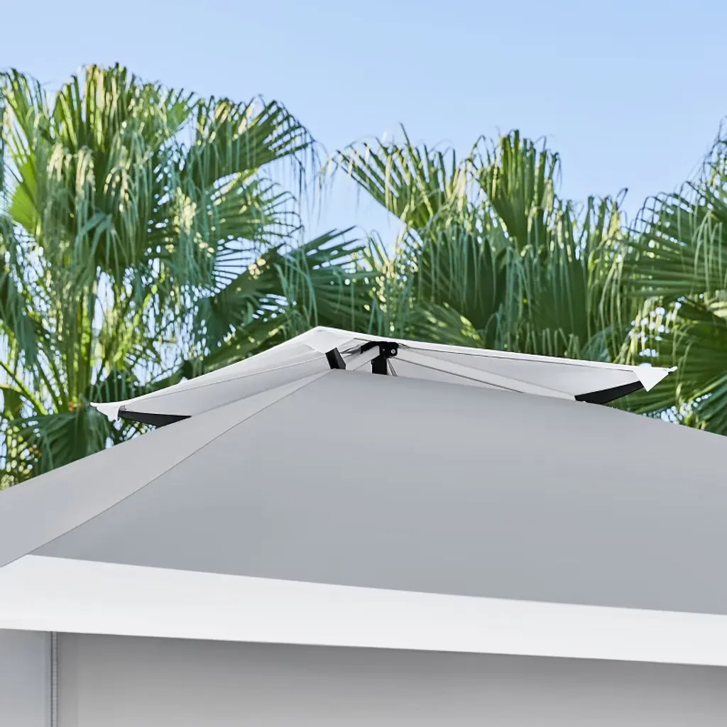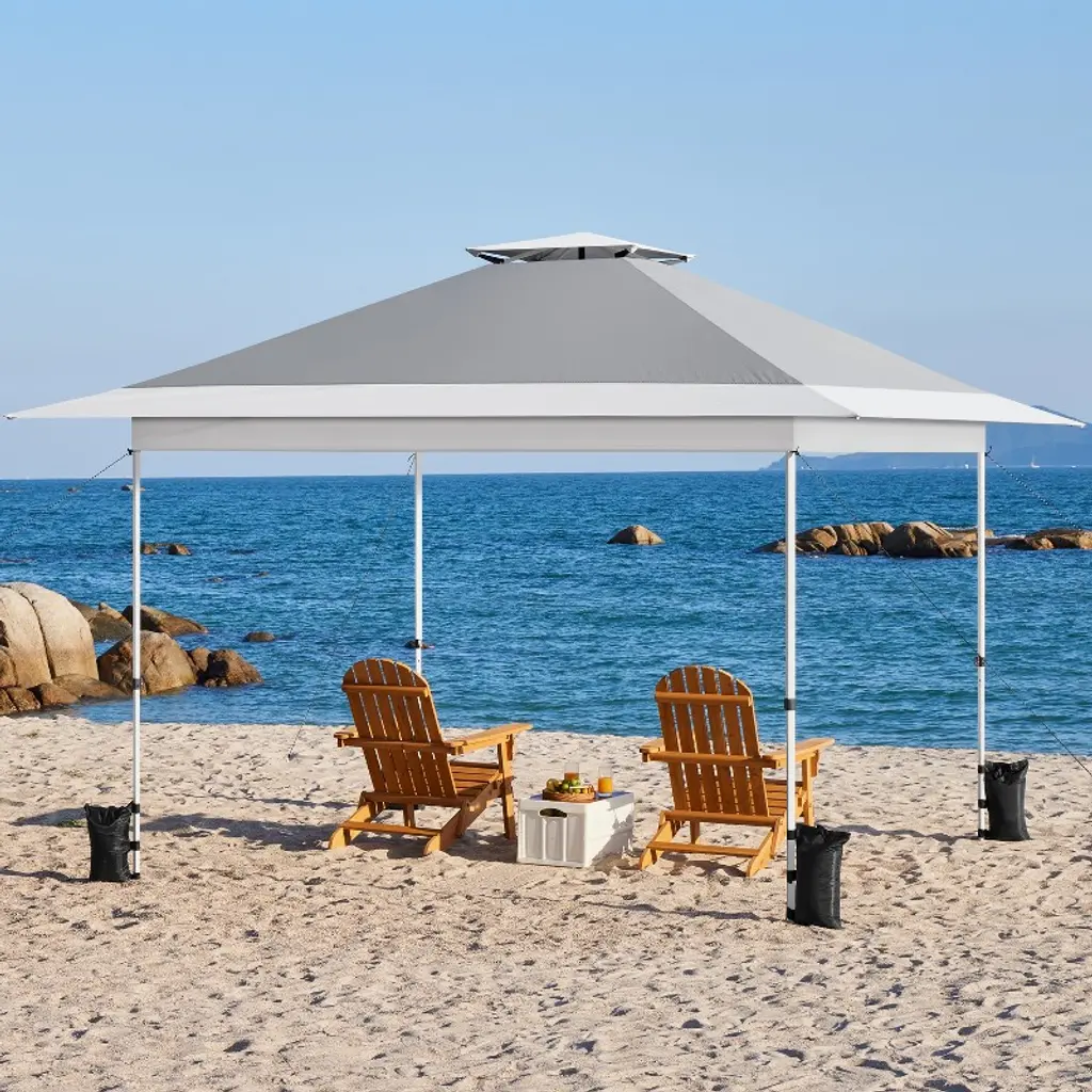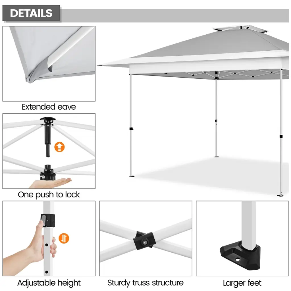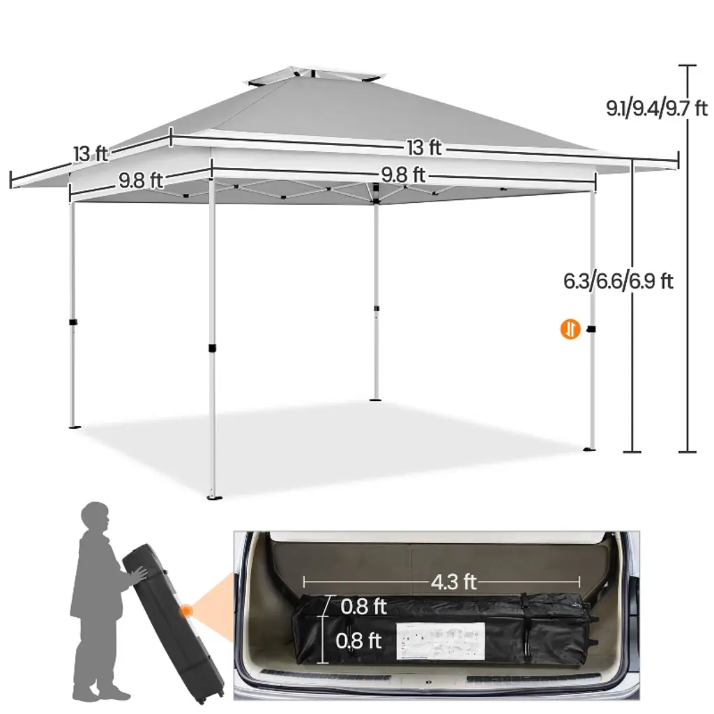 Ready to shield you and your friends from direct sunlight and uncomfortable heat, this 13ft × 13ft Pop-Up Canopy Tent is the ideal refuge for garage sales, backyard/beach parties, group tours, weekend markets, and commercial events. Crafted from UPF 50+ polyester fabric with a silver lining and a powder-coated steel bracket, this canopy ensures high weather resistance and strength. The overhang design lends extra shade for more people. Additionally, the adjustable tent height adds versatility. Easily modify the height from 9.1′ to 9.7′ in 4″ increments using the snap buttons on the legs. The one-push-to-lock mechanism ensures a hassle-free setup. For added convenience, this set includes a roller bag, four guy lines, eight metal ground anchors, and four sandbags. Specifications: Canopy Color: Light Gray/White; Khaki/Brown; Light Gray/GreenMaterials: Powder-Coated Steel, Polyester FabricAssembled Dimensions: 13′ L × 13′ W × 9.1-9.7′ HAdjustable Canopy Height: 9.1′, 9.4′, 9.7′Rolling Storage Bag: 0.8′ L × 0.8′ W × 4.3′ H Set Includes: 1 Canopy 1 Rolling Storage Bag4 Sandbags4 Guy Lines8 Ground AnchorsPlease see the image for exact measurements. Please allow measuring deviation due to manual measurement.For optimal performance and safety, do not use this canopy in conditions of strong breeze, continuous light rain, heavy rain, or any other extreme weather scenarios.Please anchor the canopy to the ground when in use.Two or more adults are needed to set up/take down this canopy tent.