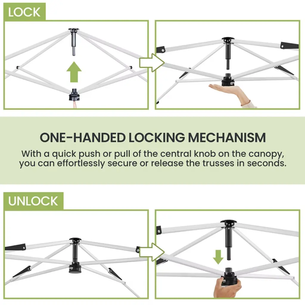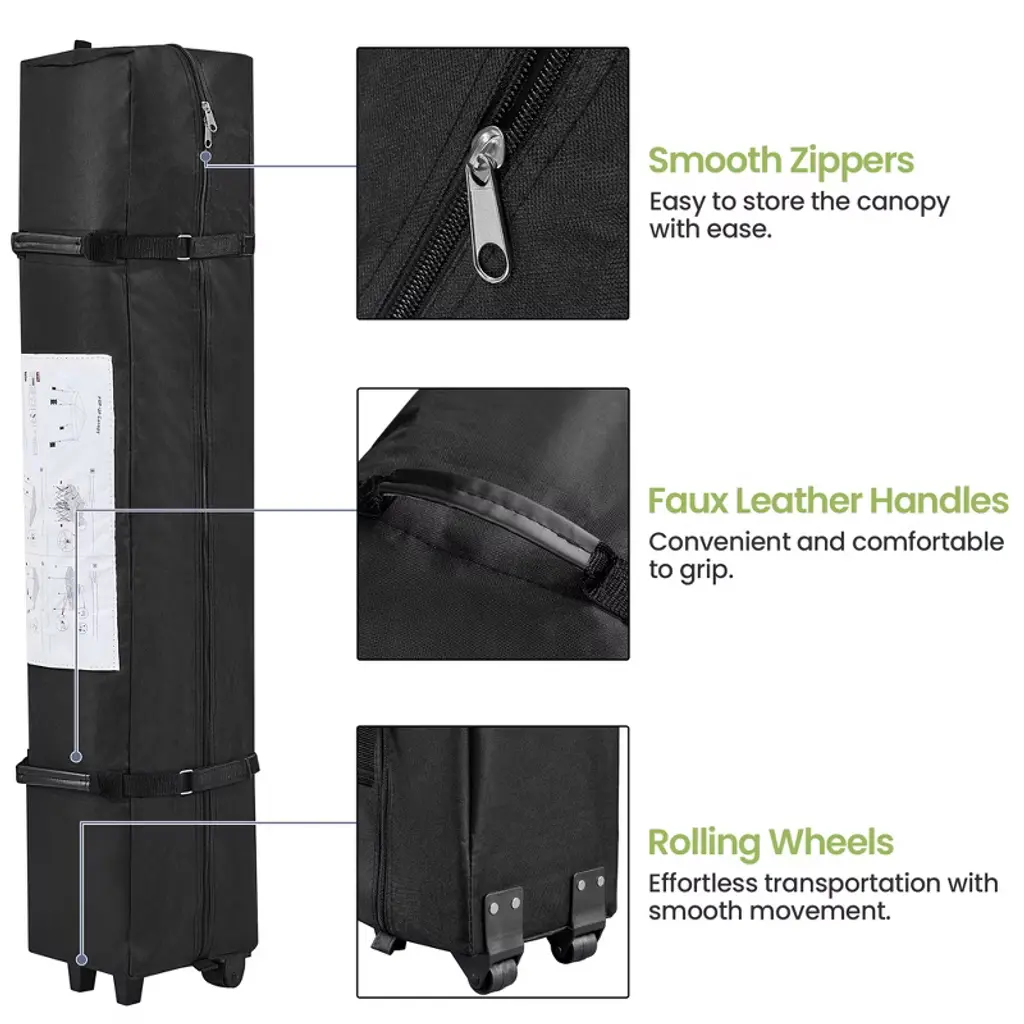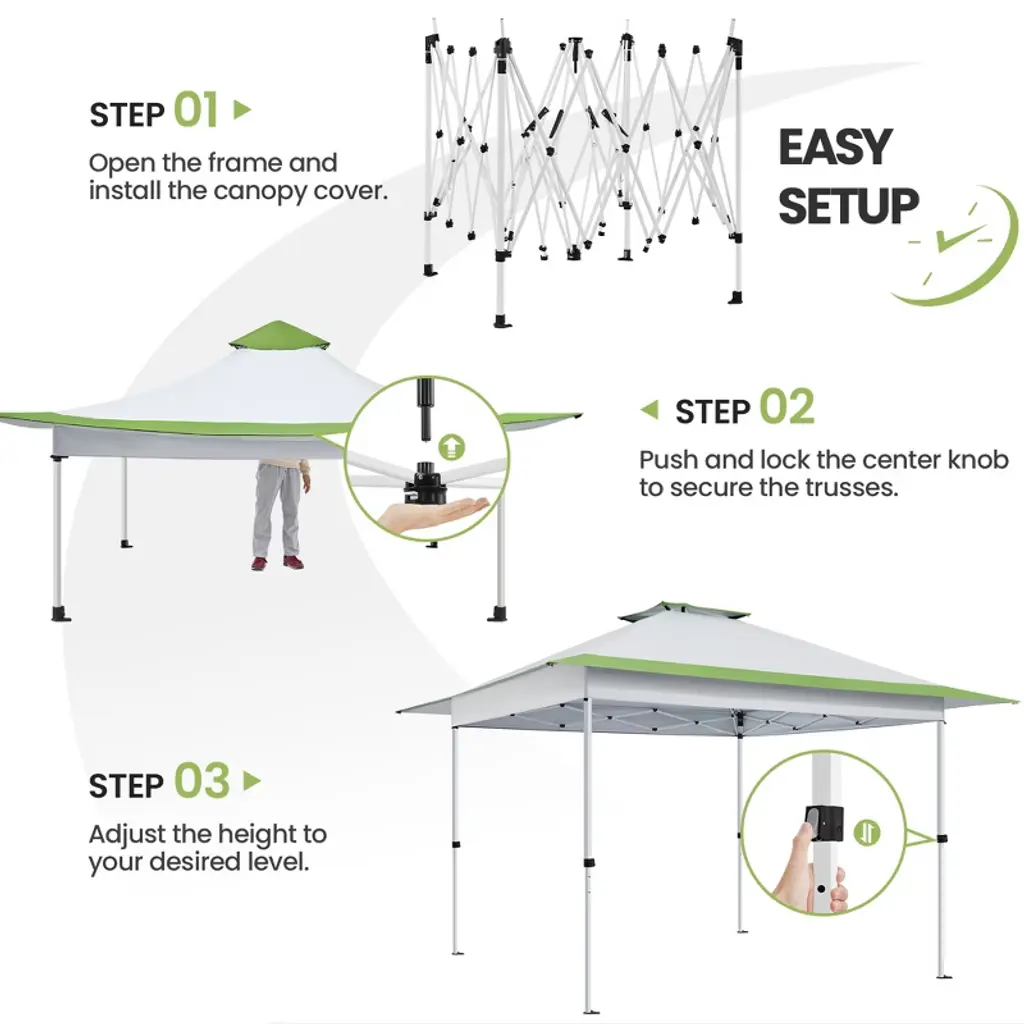 Ready to shield you and your friends from direct sunlight and uncomfortable heat, this 13ft × 13ft Pop-Up Canopy Tent is the ideal refuge for garage sales, backyard/beach parties, group tours, weekend markets, and commercial events. Crafted from UPF 50+ polyester fabric with a silver lining and a powder-coated steel bracket, this canopy ensures high weather resistance and strength. The overhang design lends extra shade for more people. Additionally, the adjustable tent height adds versatility. Easily modify the height from 9.1′ to 9.7′ in 4″ increments using the snap buttons on the legs. The one-push-to-lock mechanism ensures a hassle-free setup. For added convenience, this set includes a roller bag, four guy lines, eight metal ground anchors, and four sandbags. Specifications: Canopy Color: Light Gray/White; Khaki/Brown; Light Gray/GreenMaterials: Powder-Coated Steel, Polyester FabricAssembled Dimensions: 13′ L × 13′ W × 9.1-9.7′ HAdjustable Canopy Height: 9.1′, 9.4′, 9.7′Rolling Storage Bag: 0.8′ L × 0.8′ W × 4.3′ H Set Includes: 1 Canopy 1 Rolling Storage Bag4 Sandbags4 Guy Lines8 Ground AnchorsPlease see the image for exact measurements. Please allow measuring deviation due to manual measurement.For optimal performance and safety, do not use this canopy in conditions of strong breeze, continuous light rain, heavy rain, or any other extreme weather scenarios.Please anchor the canopy to the ground when in use.Two or more adults are needed to set up/take down this canopy tent.