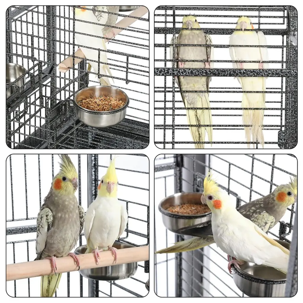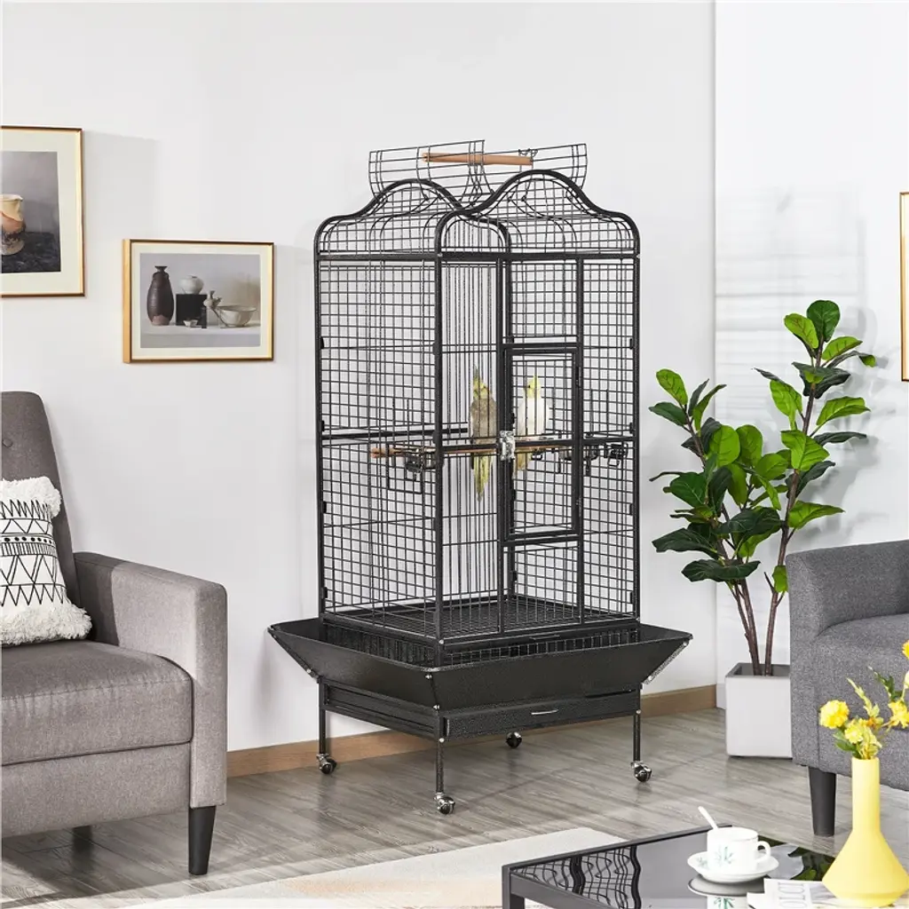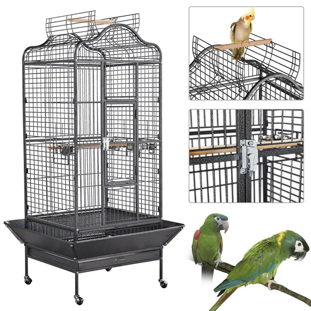 This substantial open-top large parrot cage features a Victorian archtop that opens to create a decent perching place outside the cage for your birds. This sturdy birdcage is constructed of powder-coated wrought iron and has high strength and good durability. Founded atop four all-directional wheels, this parrot cage for large birds takes you no effort to move it around the house. Other thoughtful features like the feeder doors and slide-out tray provide more convenience for pet parents. Simple assembly is required. Specifications:Color: Hammered BlackMaterial: Wrought Iron, Stainless Steel, WoodPackage includes: 1 Birdcage, 3 Feeders, 2 Dowel perchesBar spacing: 1"Overall dimensions (with roof opened): 32" L x 30.5" W x 63" HOverall dimensions (with roof closed): 32" L x 30.5" W x 60.5" HCage: 32" L x 30.5" W x 44.5" HFront door: 9" W x 18.3" H Please see the image for exact measurements.The color of this bird cage is not pure black. It is a hammertone black.Please allow a 0.5" measurement tolerance.This cage is designed for MEDIUM/LARGE-SIZED birds. Please make sure that this cage is suitable for your birds before purchase.