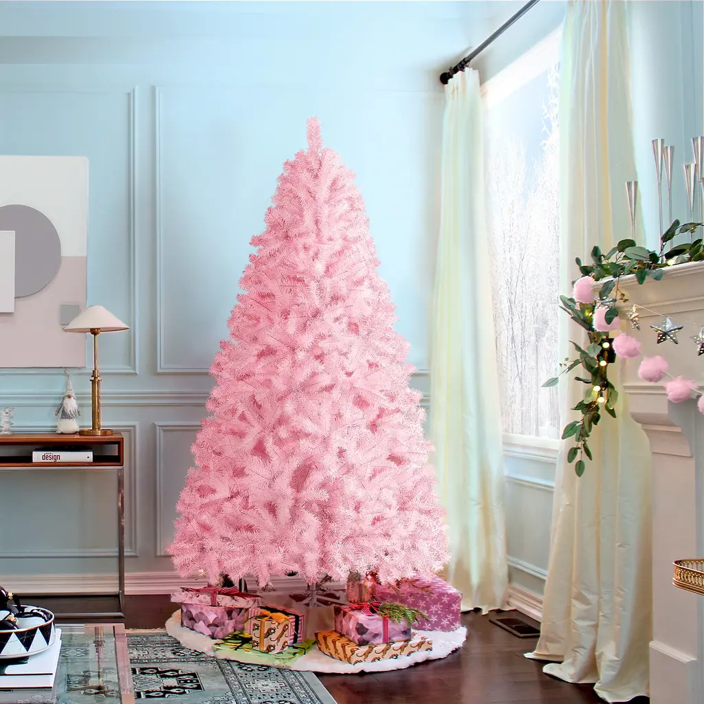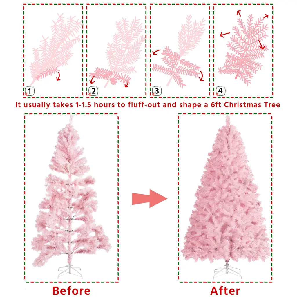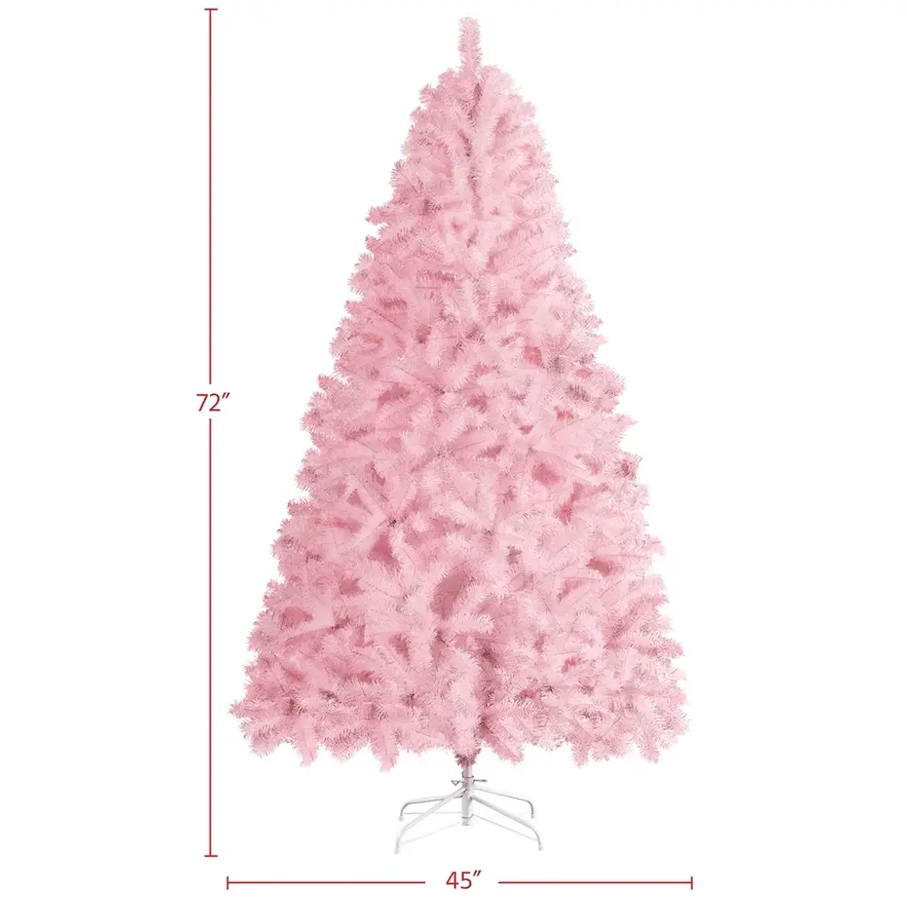 Here is a stunning Christmas gift for all pinklefins, a Christmas tree that comes with pink branches and leaves. The unique cherry blossom pink is romantic and subdued, suitable for most events that are princess/fairy themed. Premium PVC branches and tips are flexible to set and fluff out. Fire-resistant feature assured safety usage; Foldable stand is easy to store and pack; Non-skid rubber feet keep the tree stand in place; Versatile color & design make this holiday decoration wide applicable. Features: 1. Premium quality material: Get into the Christmas joy with this flourishing man-made tree. All branches and tips are made of premium PVC. Both trunk and the stand are made of iron. 2. Foldable stand: The stand is foldable for easy storage and packing. Four feet of the stand are covered by non-skid rubber each to make sure the tree is sturdy. 3. Versatile design: Our flourishing artificial tree can be used either indoor or outdoor, the sturdy metal frame is relatively heavier and not likely to collapse. 4. Flexible tips: The "leaves" on our tree can be bent and set at will. After putting the tree body and they stand together, you are supposed to fluff out the tips to give a full look at your special Christmas tree. 5. Easy to set up: Our tree is made based on a hinged system, the tree body is divided into 3 sections with labels on them. The stand can also be effortlessly folded out and connect to the tree body with screws. 6. Design by yourself: The lush spruce branches provide ample space for your decorations and toys. It is also an unlit tree with no extra ornaments on it. 7. Lightweight but sturdy: This artificial Christmas tree features a lightweight design, which is convenient to move around as needed. The solid metal stand provides extra stability for you to hang beautiful ornaments without worrying about tipping over. Specifications: Materials: PVC, Iron Categories: Regular Unlit Spruce 6 FT Christmas tree: Total Tips Count: 818 Overall Dimension: 44 × 72''(Dia. × H) Shipping Dimension: 40× 8.5×9.5'' Stand Dimension: 18 × 5.3''(Dia. × H) Tree Trunk Diameter: 1'' G.W.: 16.8lb; N.W.: 14.1lb 7.5 FT Christmas tree: Total Tips Count: 1539 Overall Dimension: 52.5 × 92''(Dia. × H) Shipping Dimension: 46× 14×15'' Stand Dimension: 21.7 × 7''(Dia. × H) Tree Trunk Diameter: 1.3'' G.W.: 31.3lb; N.W.: 25.4lb