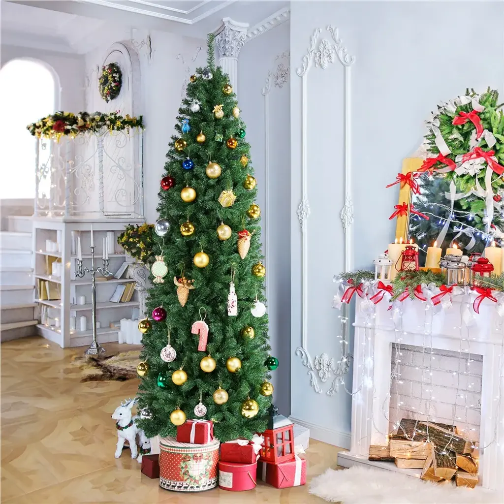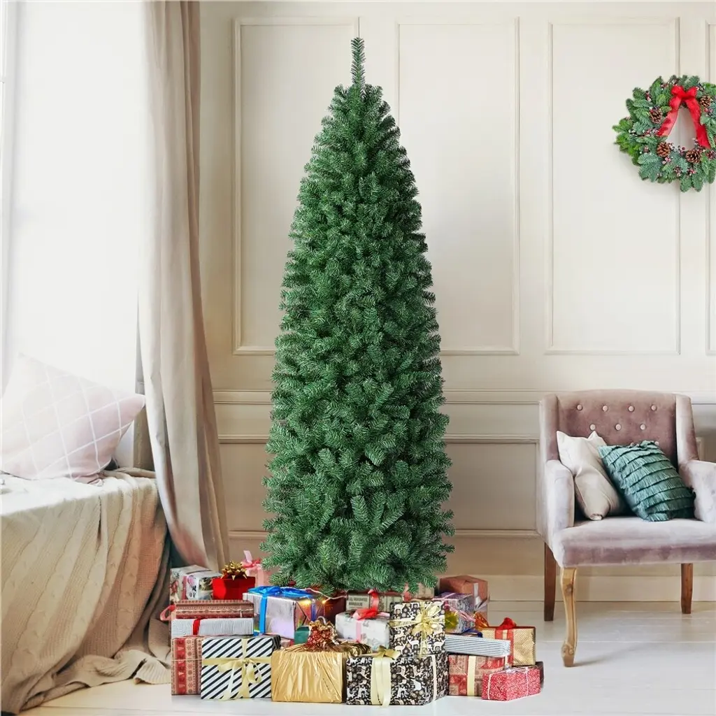 Ready to soak in the Christmas vibe? Our slim pencil Christmas tree is ready to visit your lovely home. Horizontally small sized artificial Christmas tree is suitable for locations with limited space. A natural lifelike appearance present you with a full and fluffy feeling; Premium quality materials ensure this artificial tree durable and sturdy; Bendable branch tips are easy to lift up and down for pre-setting; Versatile design allow the whole family to enjoy fum time decorating at their will. This tree is easy to assemble with a foldable stand and three other sections of tree body. Features: 1. 【Slim pencil tree】Slim pencil shape of the tree body makes it space-saving. This artificial Christmas tree are hinged with plentiful tips, which give a full and fluffy look from any angles in your decorated places. Green and thick finish of branch tips enhanced the natural leafy vibe of this decorative holiday tree. Lush tips also leave more space for your other festive ornaments. 2. 【Premium quality material】Get into the holiday joy with this lush artificial Christmas tree. All branches and tips are made of premium PVC, which makes it harmless and durable. Both trunk and and the stand are made of iron, ensuring sturdy and balanced placing, not to mention other feathers such as fire-resistant and anti-collapse. 3. 【Foldable stand】This stand is foldable for easy storage and packing, you can effortlessly fold it to save more space in garage and wait for another coming year. Four feet of the stand are covered by rubber each to make sure the tree is sturdy, also preventing from floor scratches. 4. 【Versatile design】Our green spruce artificial tree can be used either indoor or outdoor, the sturdy metal frame is relatively heavier and not likely to collapse. Pencil shaped Christmas tree takes less room, suitable for places where the space is limited. It is an unlit tree with no decoration on it except for branches and tips. We hope you can enjoy a sweet fun time decorating this full and fluffy tree with your family and beloved ones. 5. 【Flexible tips】The "leaves" on our tree can be bent and set at will. After putting the tree body and the stand together, you are supposed to fluff out the tips to give a full look of your unique Christmas tree. All tips are bendable and can be set in a certain direction, normally the fluffing out procedure including two steps: lifting up the top tips and pulling out the side tips. 6. 【Easy to set up】Our tree is made based on hinged system, the tree body is divided into 3 sections with label on them. You could set up this tree by simply insert one of tree parts on another. The stand can also be effortlessly folded out and connect to tree body with screws. It is suggested to wear gloves while setting up and fluffing out, just like a real spruce, the "needles" can be a bit scratchy. 7. 【Easy to clean】All branches and tips are made of premium PVC, which is easy to clean with a damp cloth when needed. 8. 【Reusable item】Crafted of the selected material, our flocked artificial Christmas tree is stable and durable for long time use. Use and preserve it well, it will still highlight your home next Christmas. Specifications: 6 FT Christmas tree: Materials: PVC, Iron Categories: Pencil Unlit Spruce Total Tips Count: 814 Overall Dimension: 29 × 72''(Dia. × H) Stand Dimension: 19.7×5.7''(Dia. × H) G.W.: 17.6lb N.W.: 14.3lb 7.5 FT Christmas tree: Materials: PVC, Iron Categories: Pencil Unlit Spruce Total Tips Count: 1086 Overall Dimension: 32.5×90''(Dia. × H) Stand Dimension: 22×6.7''(Dia. × H) Tree Trunk Diameter: 1.3'' Trunk Pole Thickness: 0.03'' G.W.: 24.4lb ; N.W.: 20.7lb Note: Please allow ±1.2''measurement error due to the bendable branch tips.